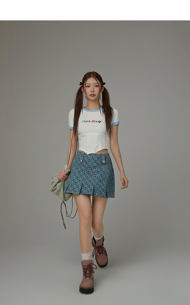 彩色字母绣花T恤女2025夏学院风撞色拼接修身短袖上衣 345747