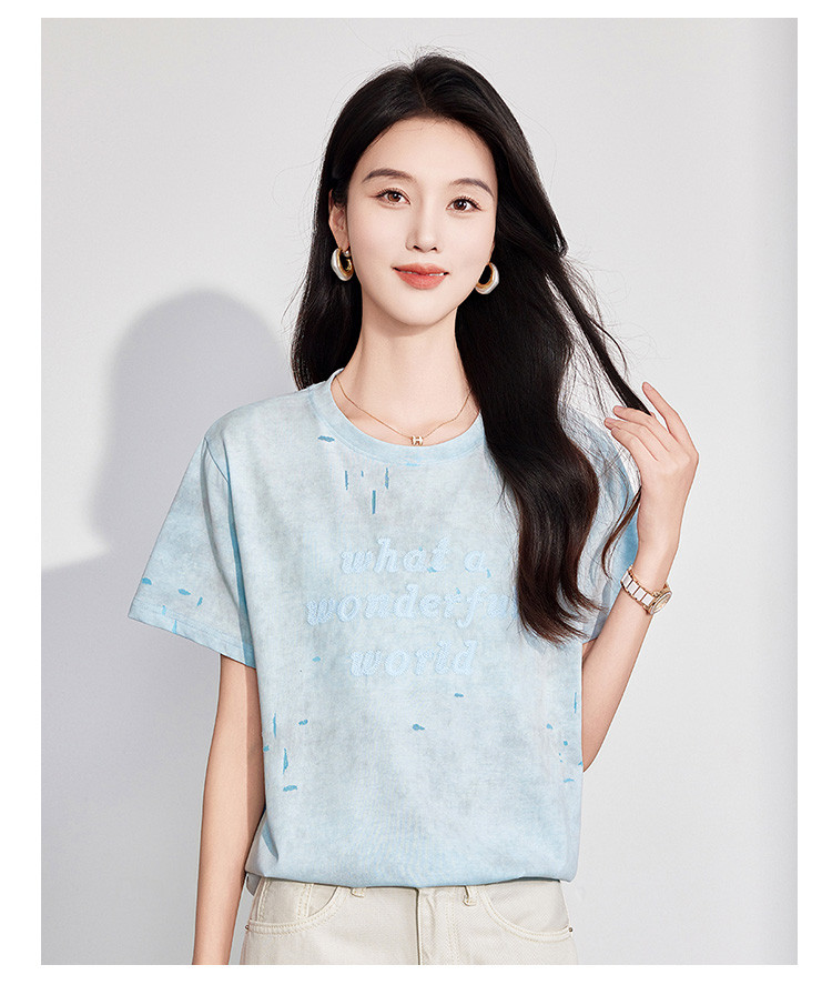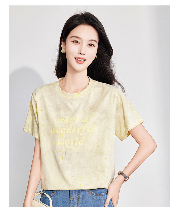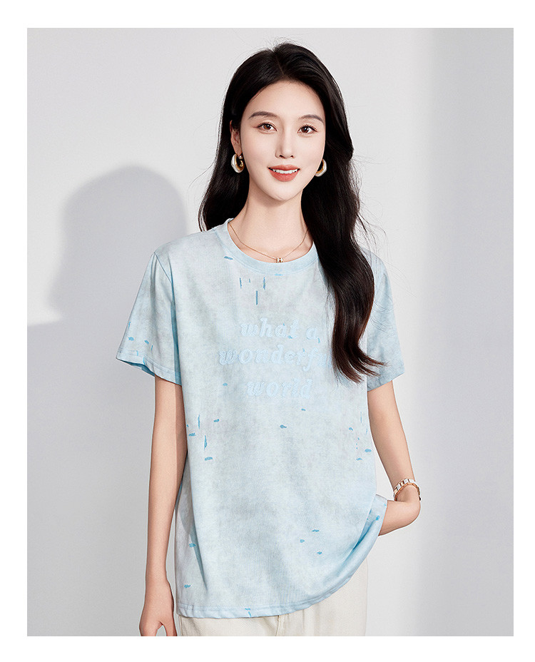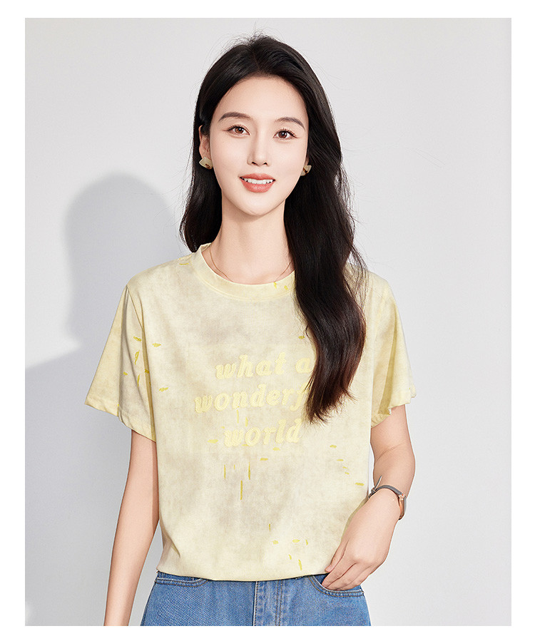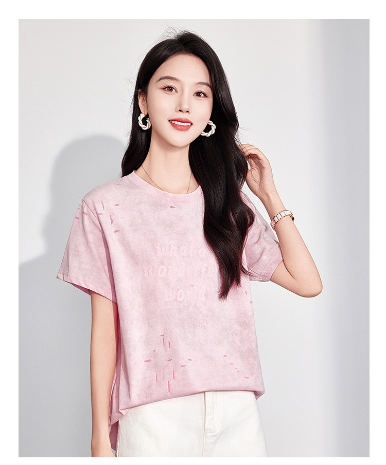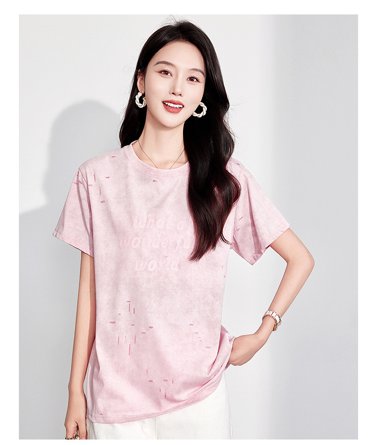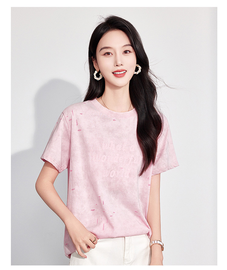 25夏季新款简约字母晕染做旧短袖T恤女日常元气学院风套头上衣 511839