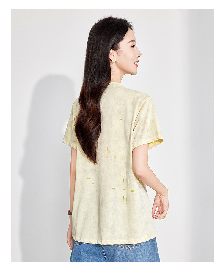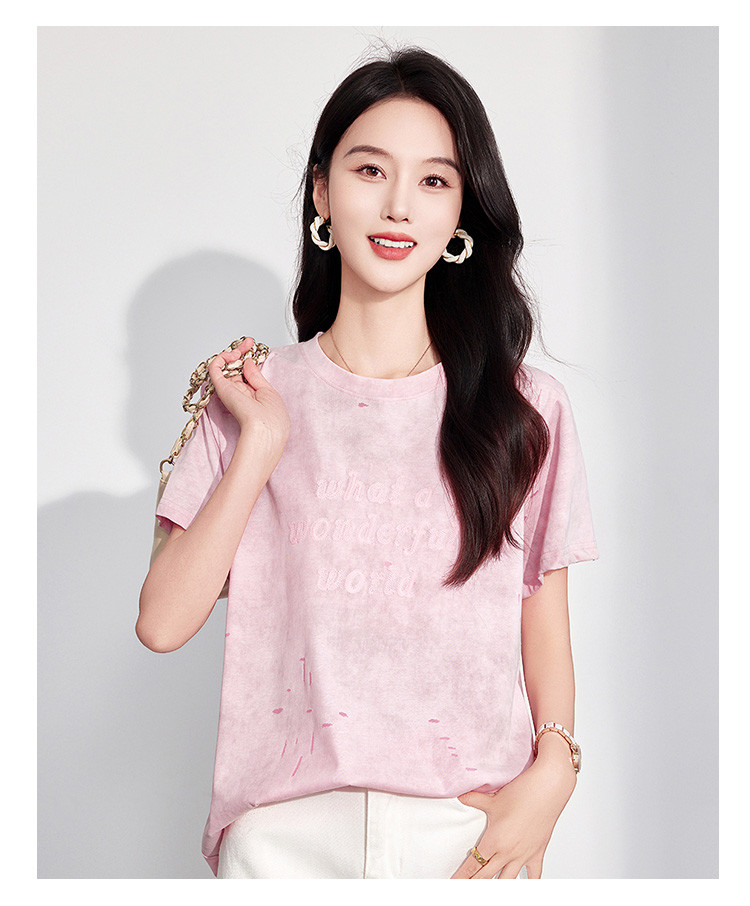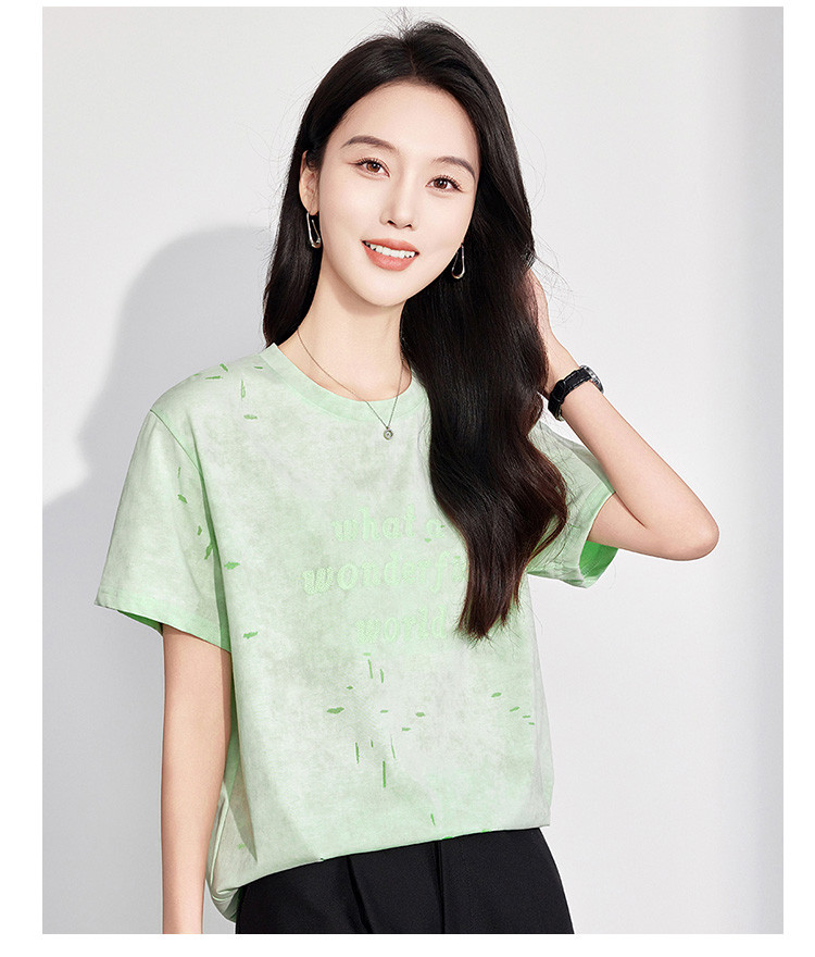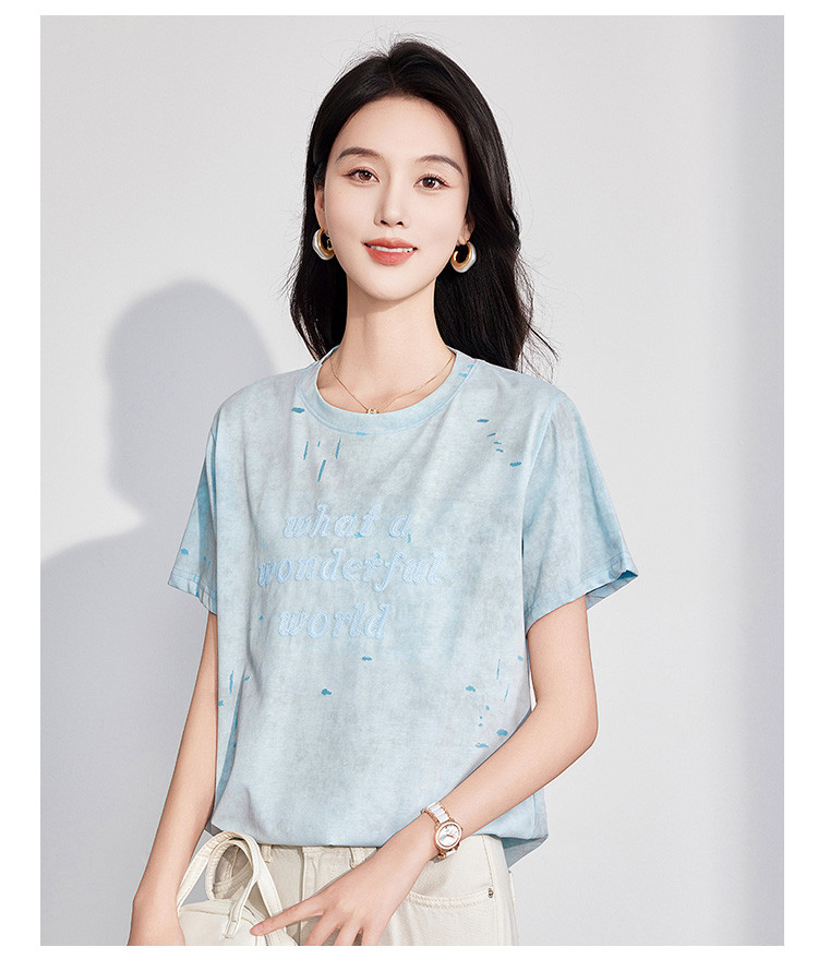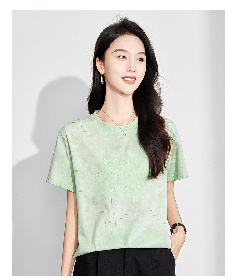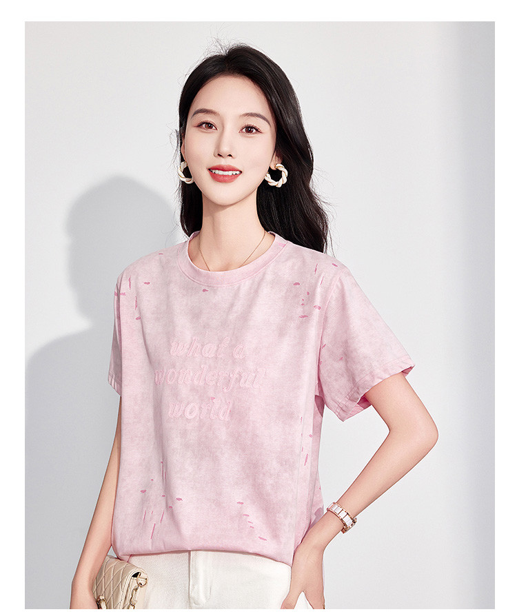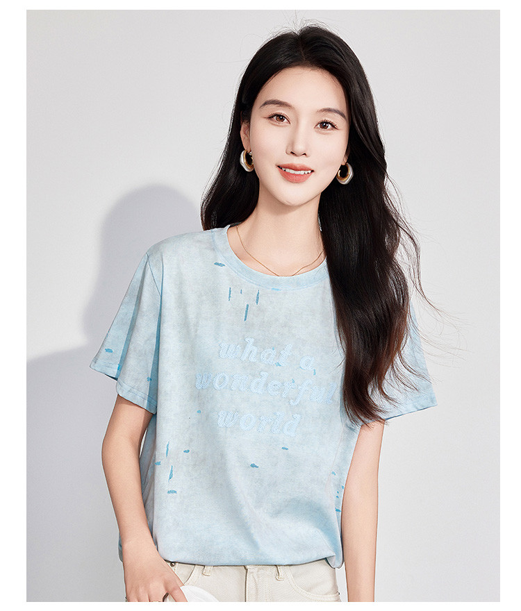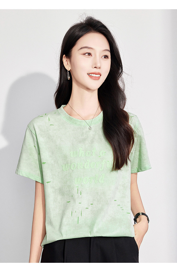 25夏季新款简约字母晕染做旧短袖T恤女日常元气学院风套头上衣 511839