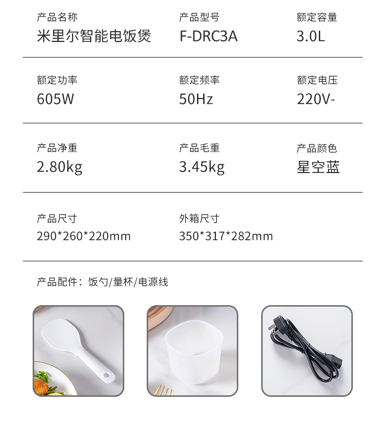 商品名称:finsybo/菲斯宝3升米里尔智能电饭煲F-DRC3A