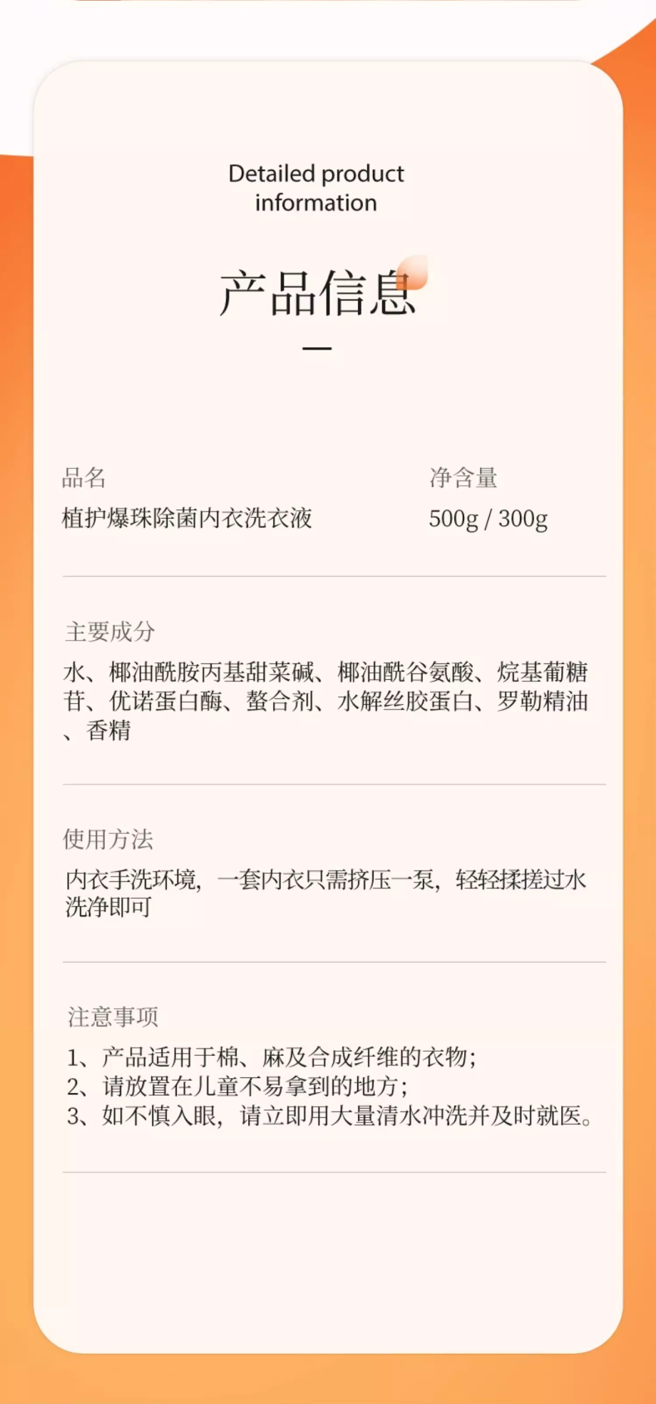 商品名称:植护 爆珠除菌内衣洗衣液 300g/瓶 1瓶