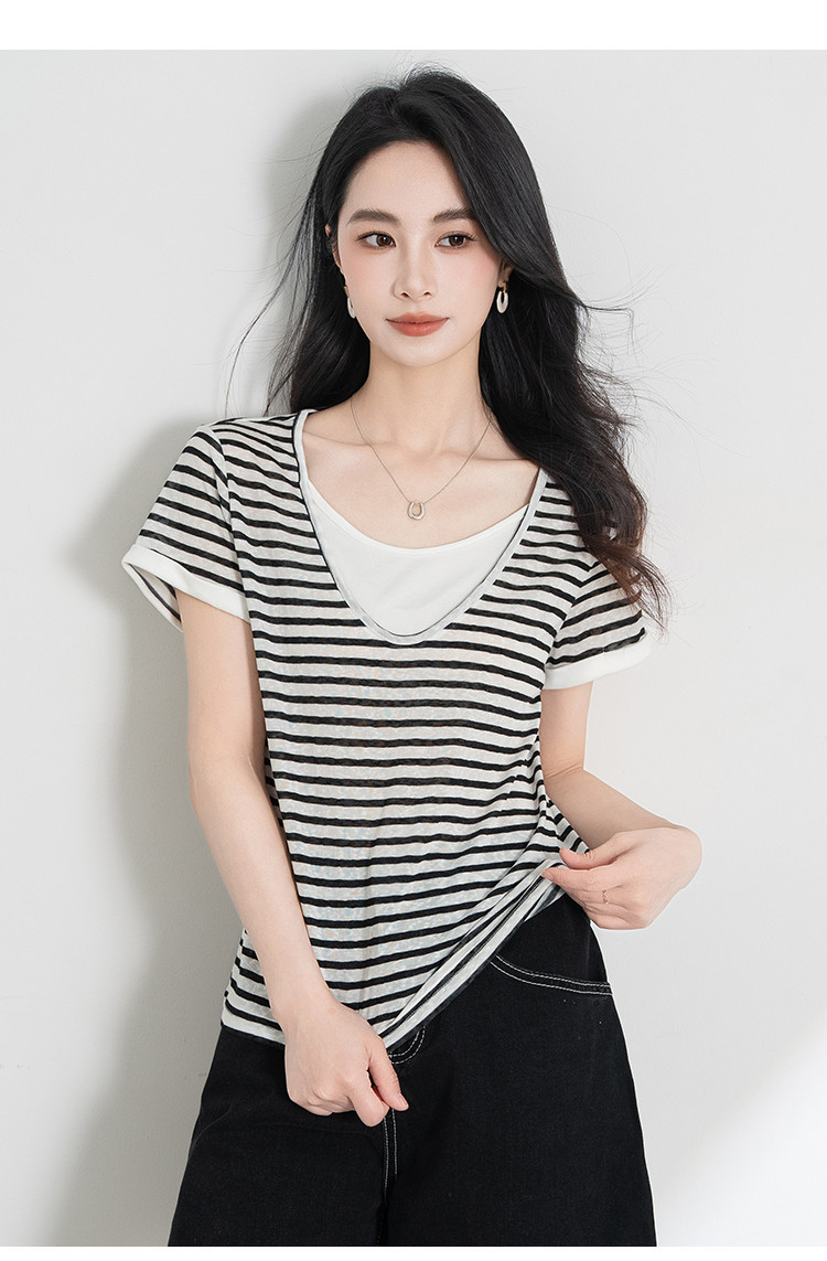 【叠穿层次感】莱赛尔条纹假两件短袖t恤女夏季2025休闲t恤 612511