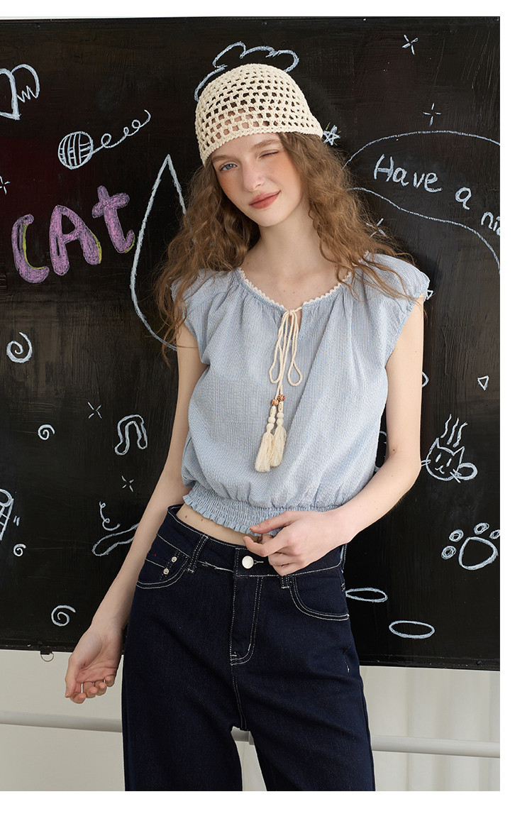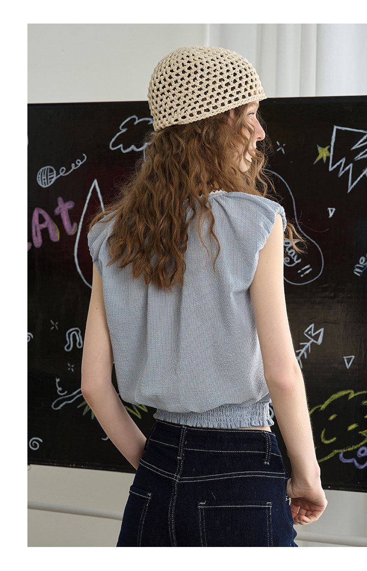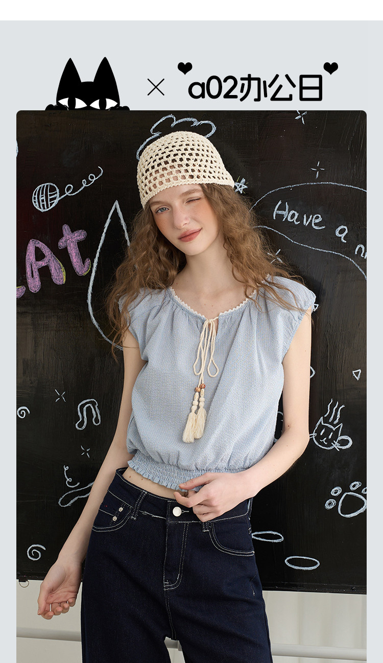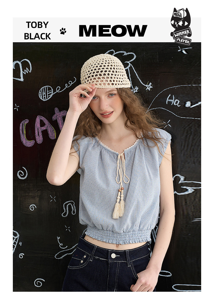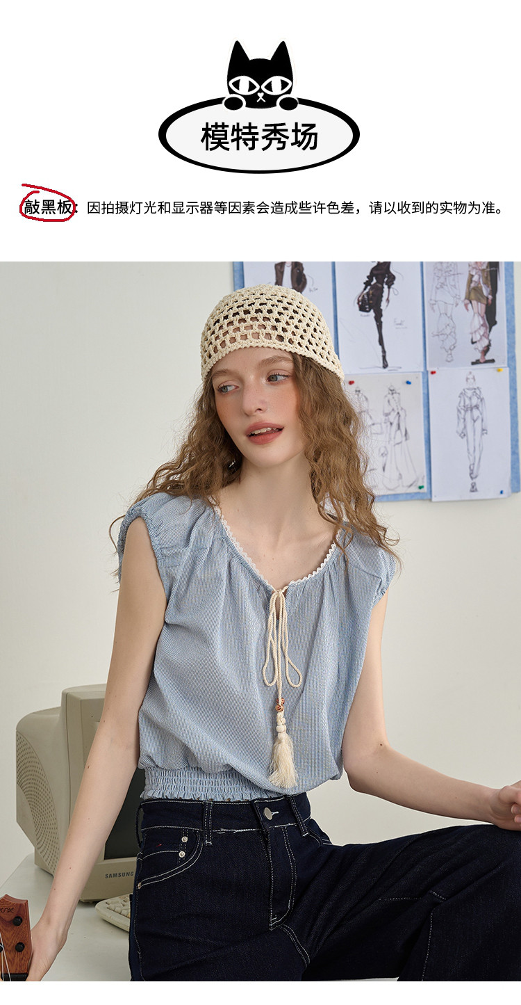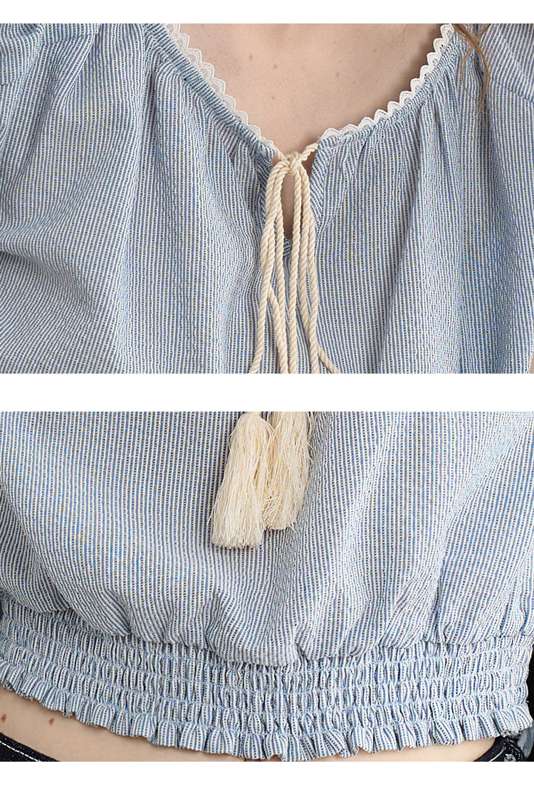 商品名称:条纹文艺花边复古抽绳短款衬衣2025夏季百搭休闲女式衬衫 757597