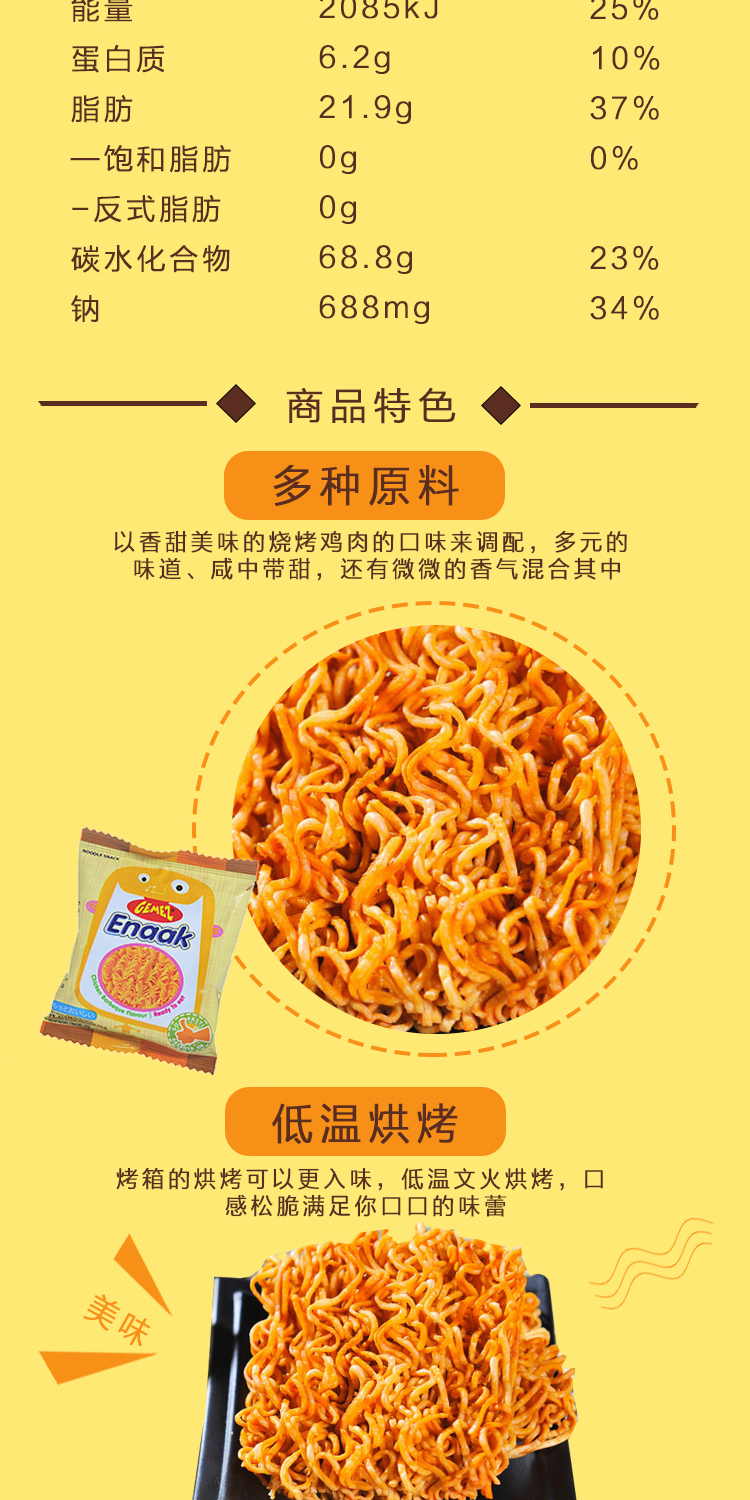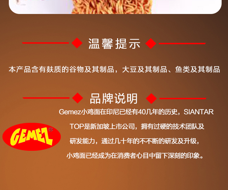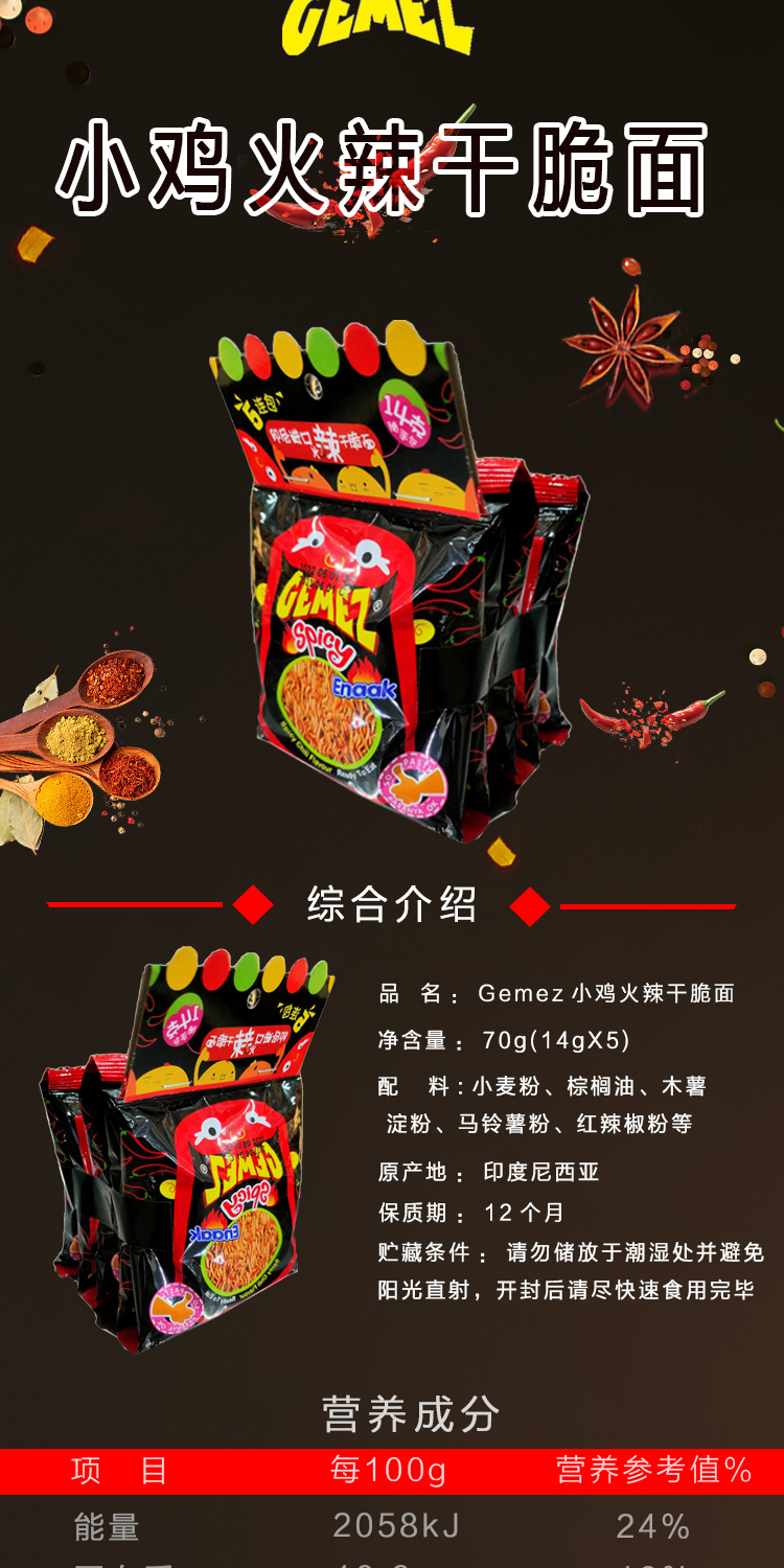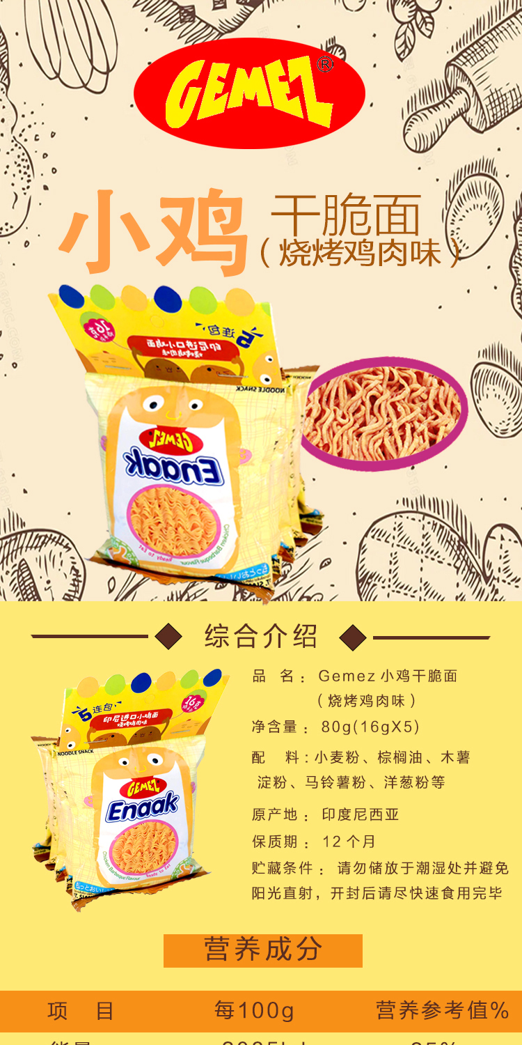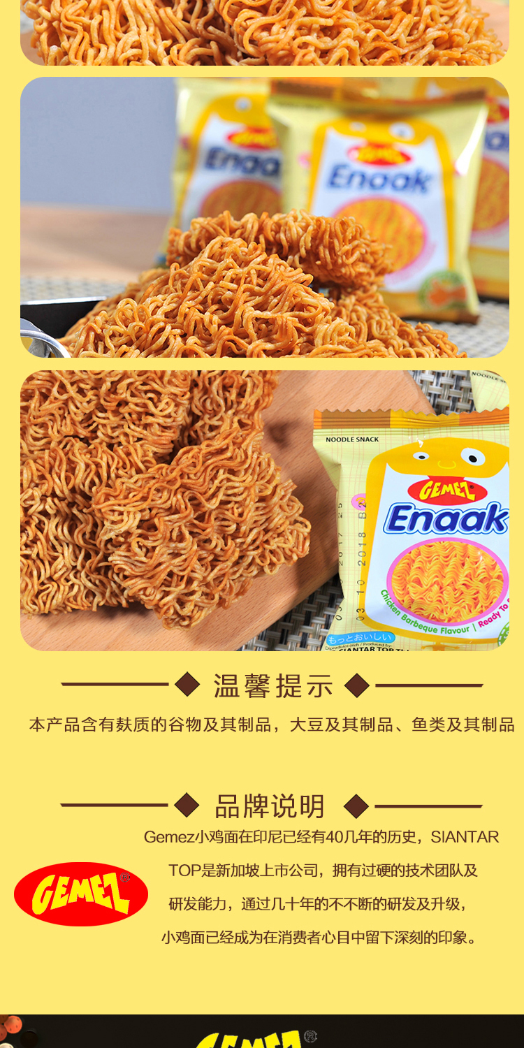 商品名称:Gemez印度尼西亚进口小鸡干脆面烧烤鸡肉味16g*25+火辣味14g*25