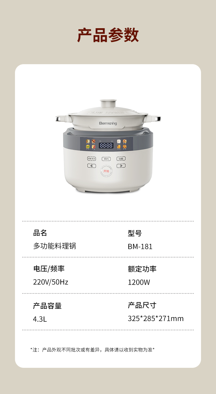 商品名称:Bernaning/勃曼4.3升多功能料理锅BM-181