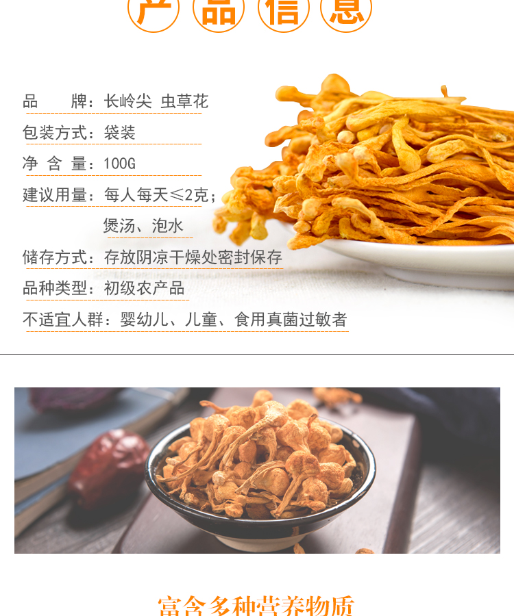 商品名称:长岭尖原野精选虫草花100g*2袋