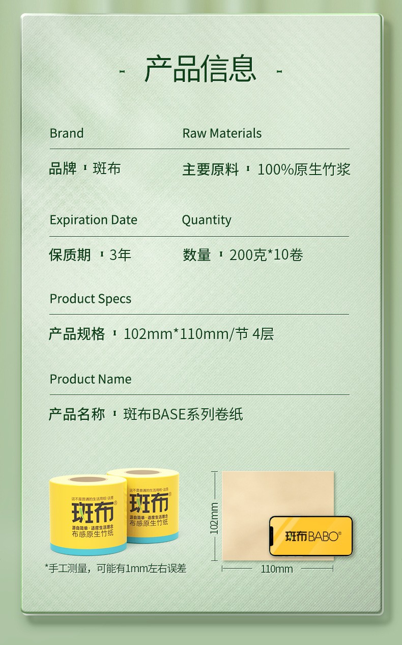 商品名称:BABO/斑布BASE系列有芯卷纸4层200g*10卷