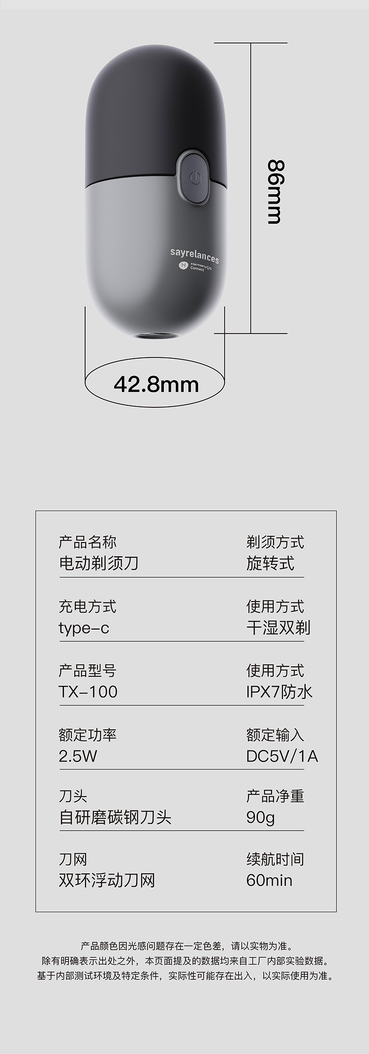 商品名称:sayrelances/赛尔兰斯胶囊电动剃须刀TX-100