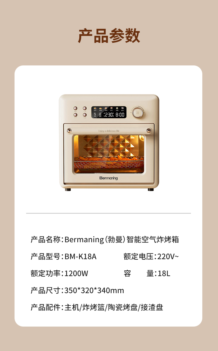 商品名称:Bernaning/勃曼18升智能空气炸烤箱BM-K18A