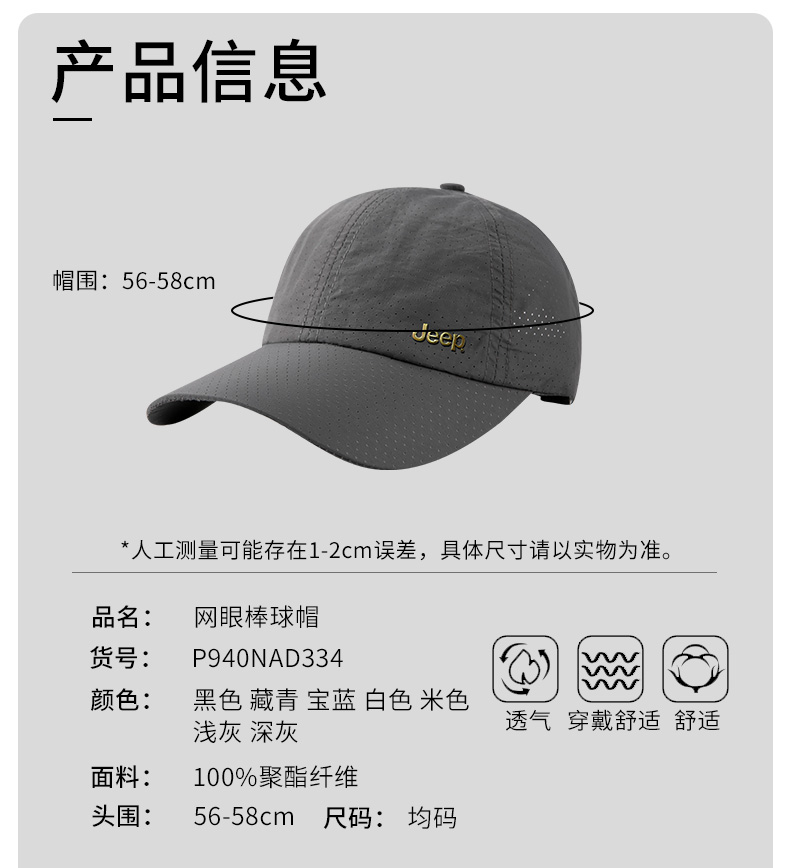 商品名称:Jeep/吉普网眼可调节棒球帽P940NAD334