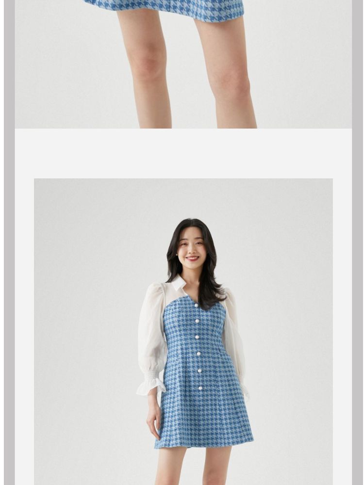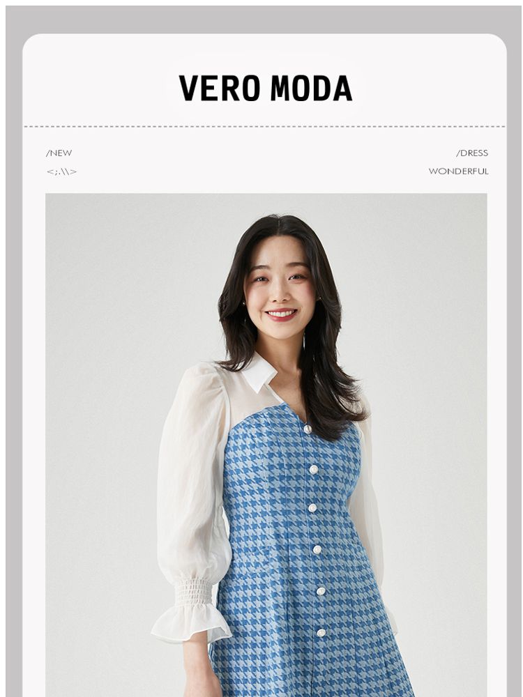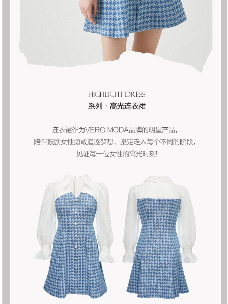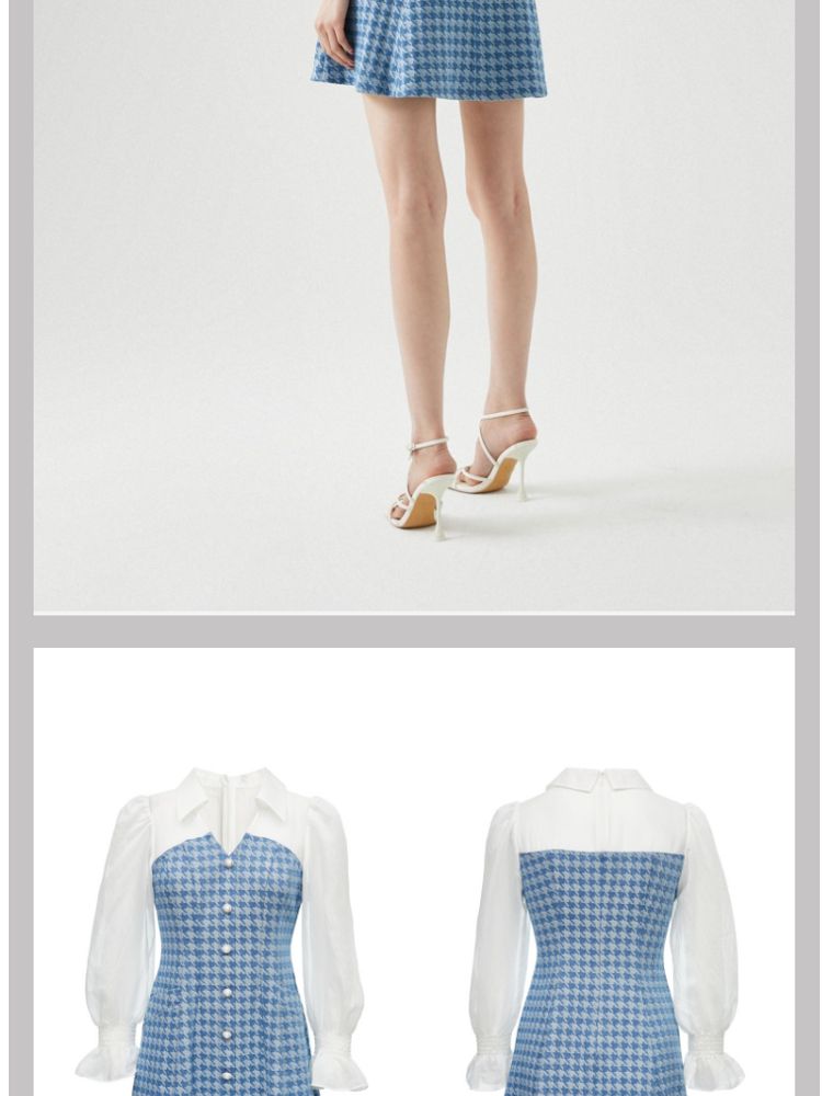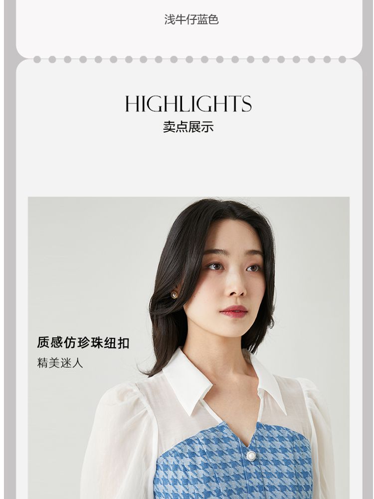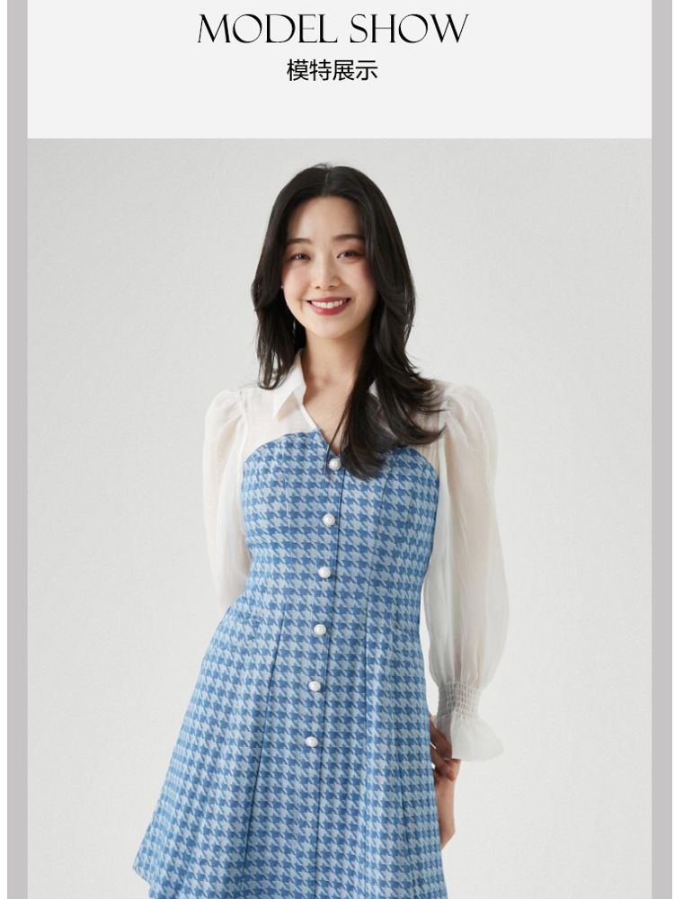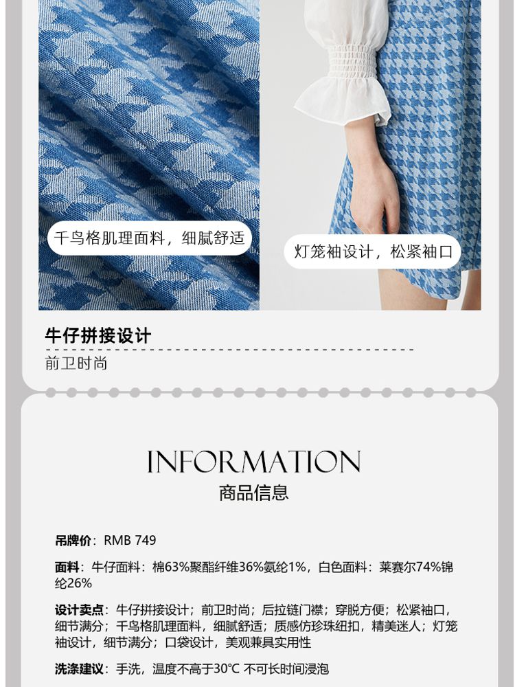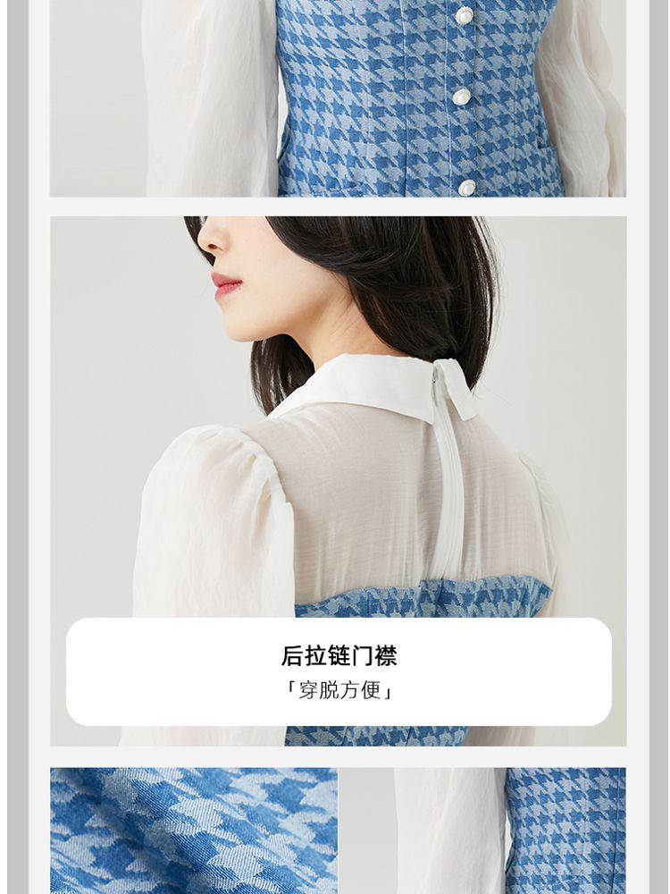 商品名称:【天丝柔软】春夏专柜款优雅千鸟格拼接牛仔灯笼袖连衣裙百搭时尚 069457