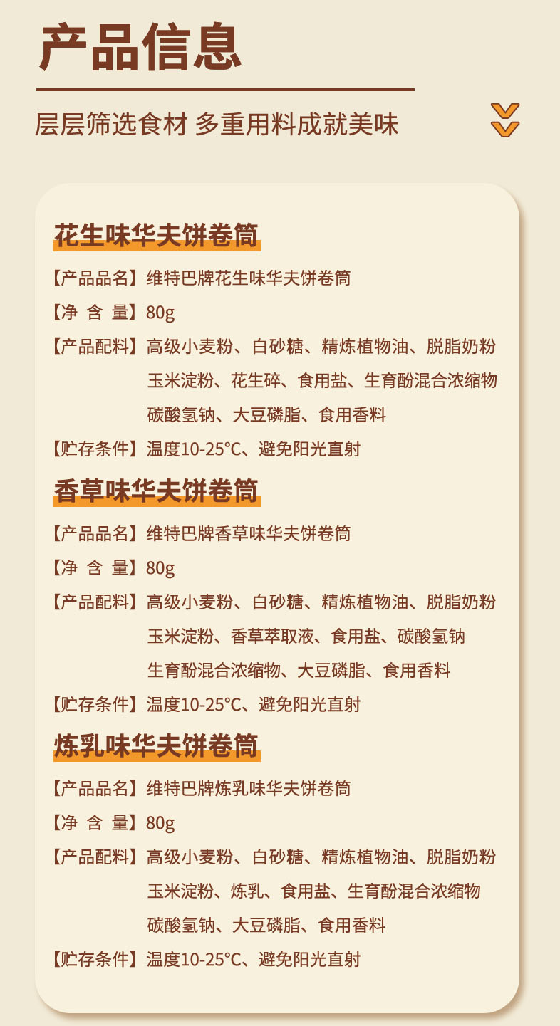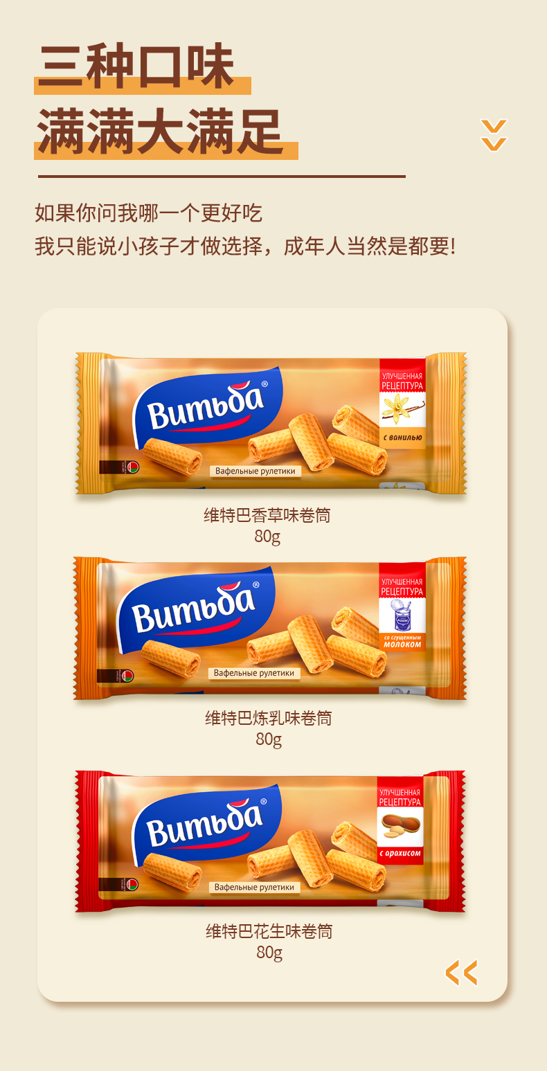 商品名称:维特巴牌白俄罗斯进口华夫饼卷筒混合口味80g*6袋