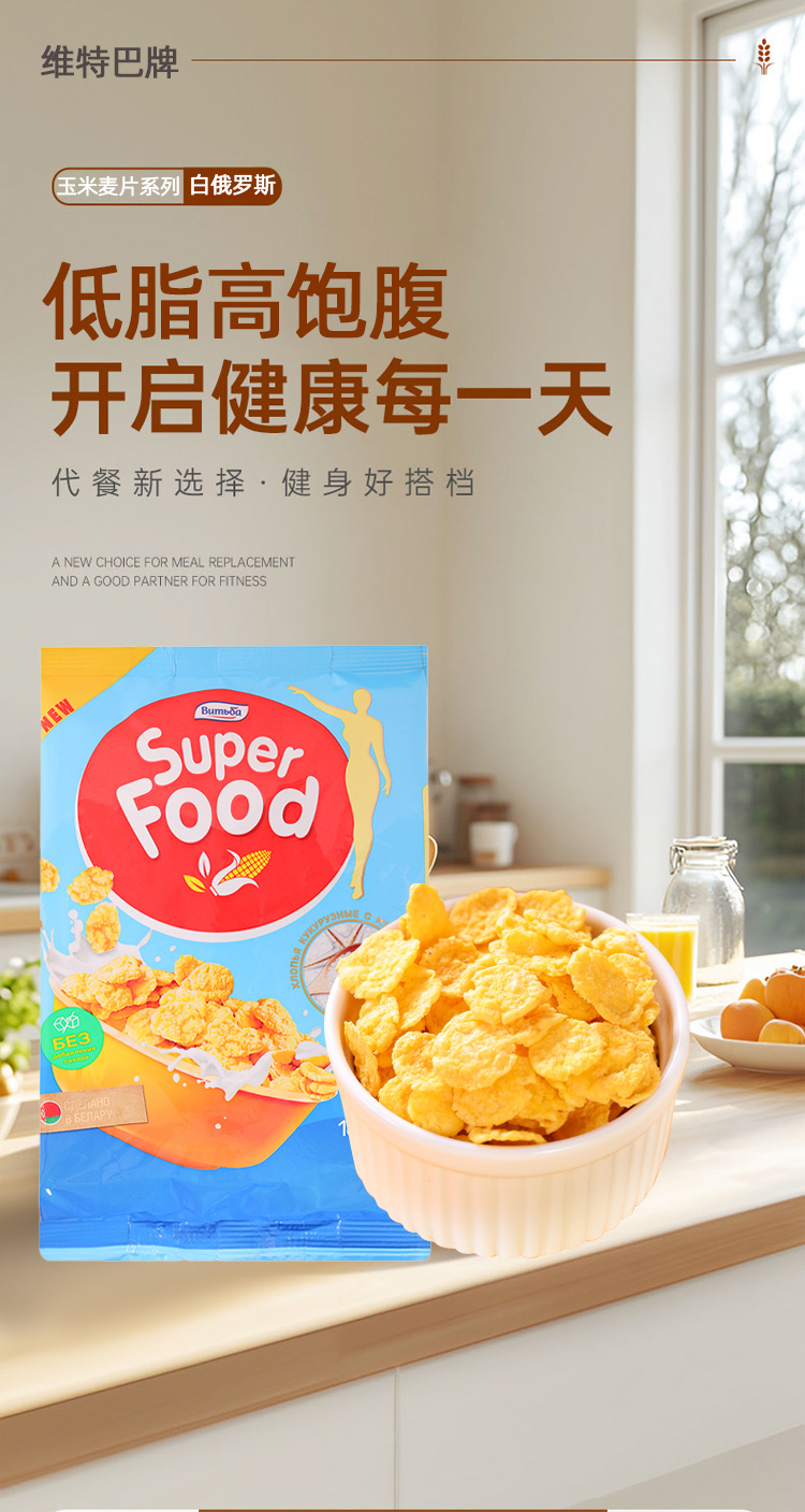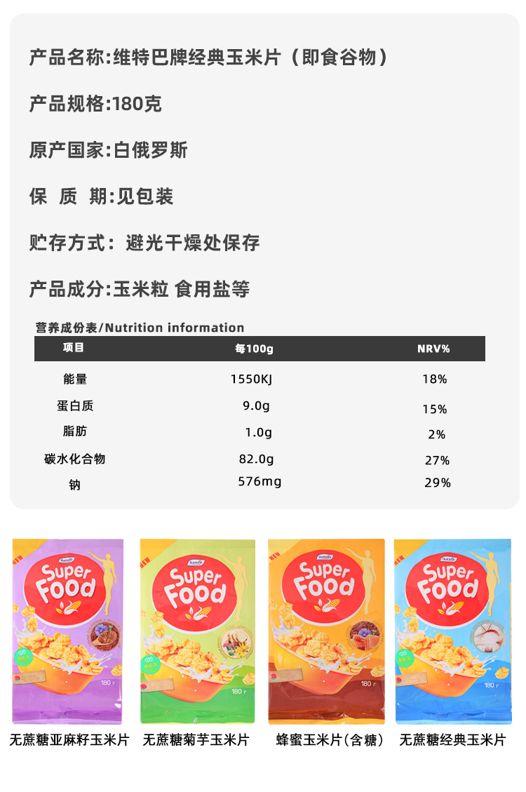 商品名称:维特巴牌白俄罗斯进口无蔗糖玉米片混合口味180g*4袋