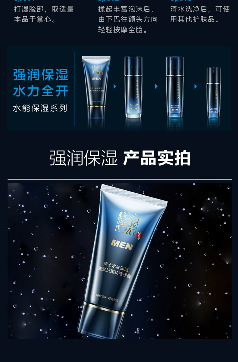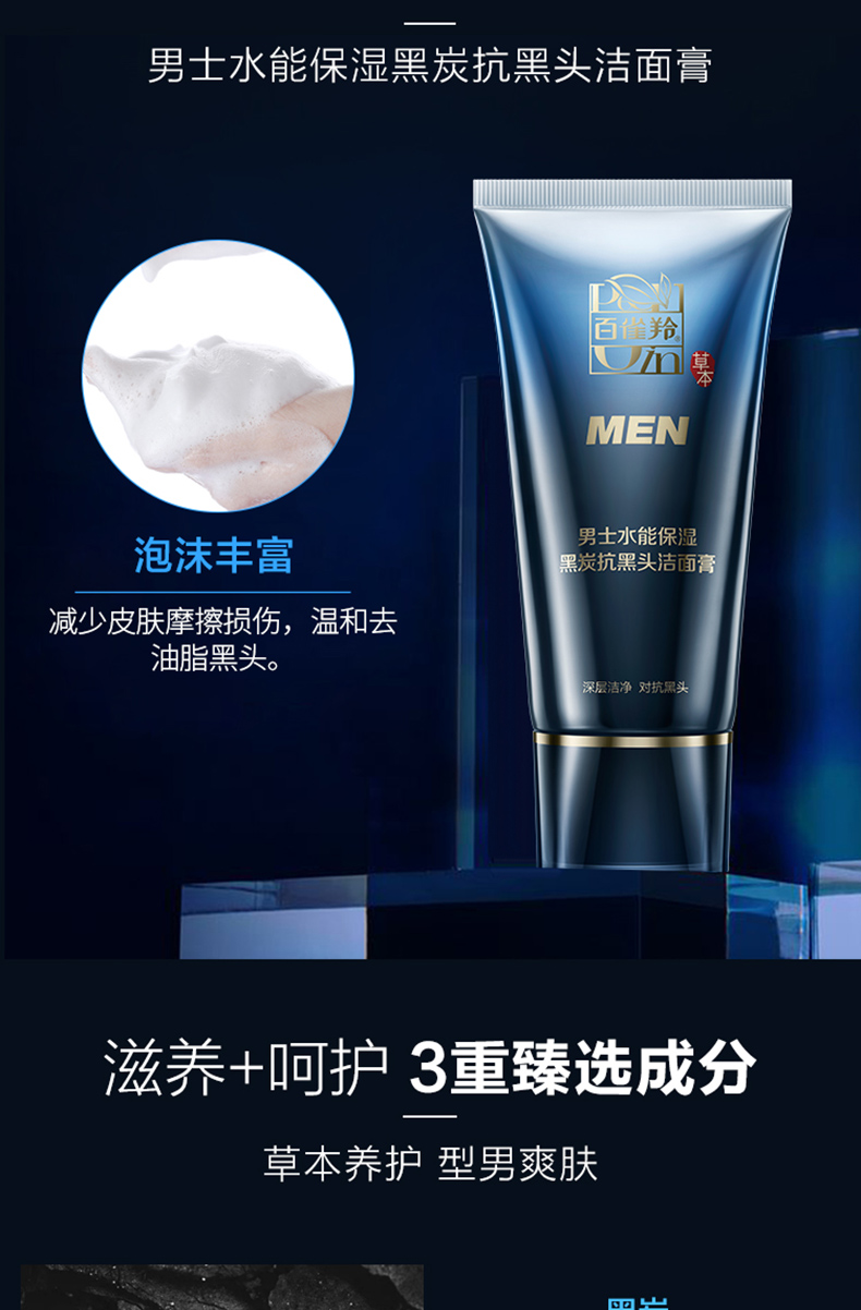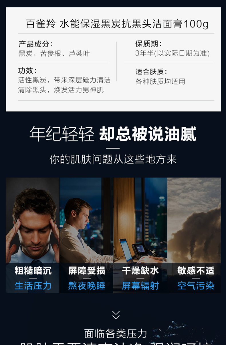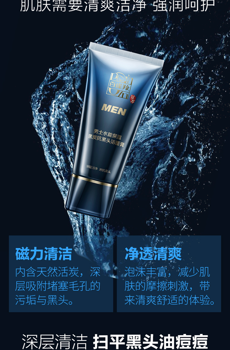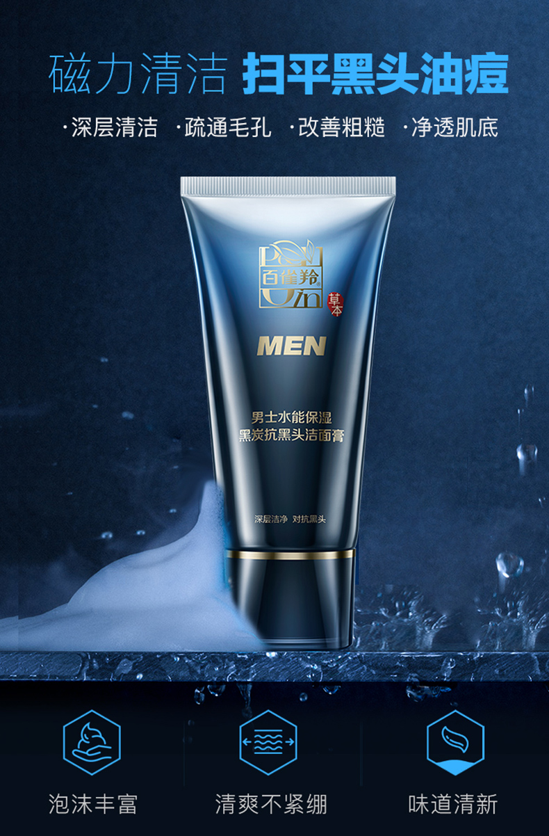 商品名称:PECHOIN/百雀羚男士水能保湿黑炭抗黑头洁面膏100g