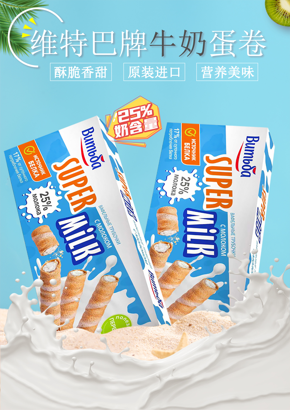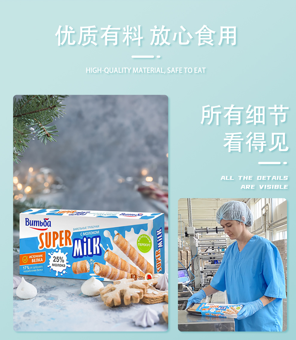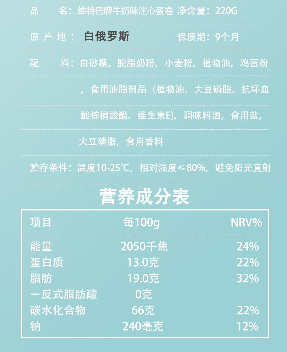 商品名称:维特巴牌白俄罗斯进口牛奶味注心蛋卷220g*4盒