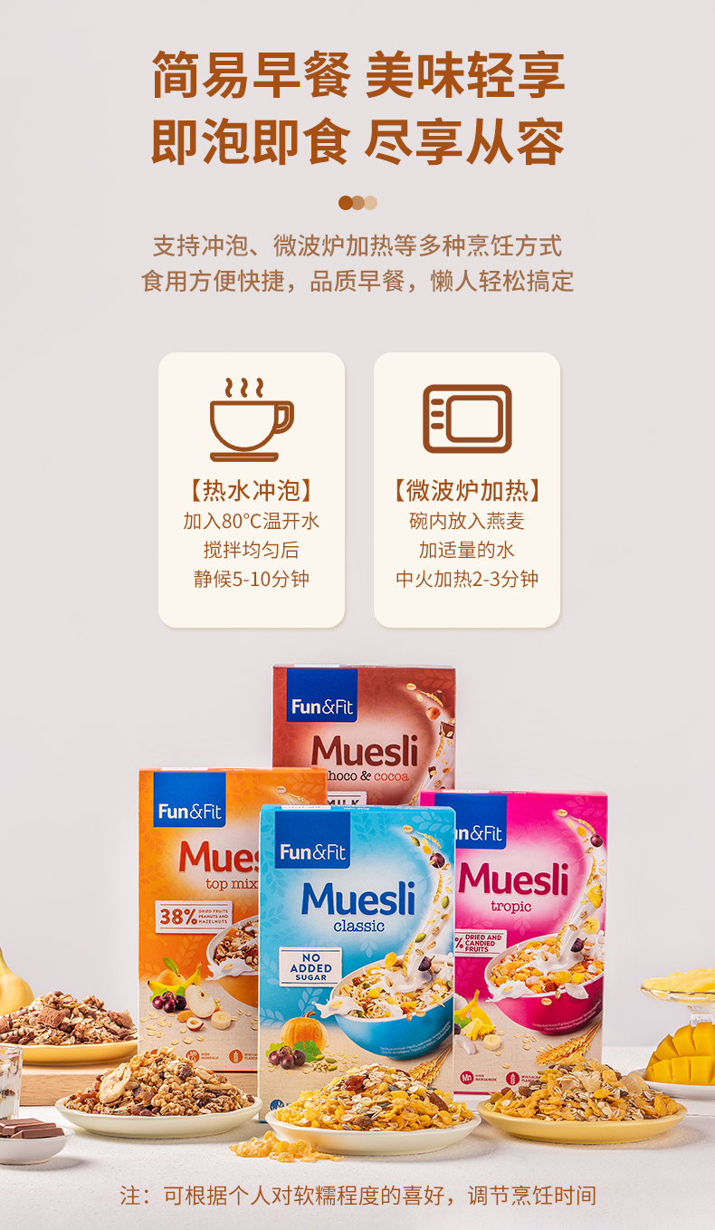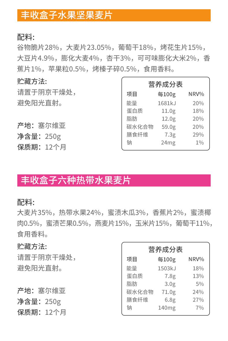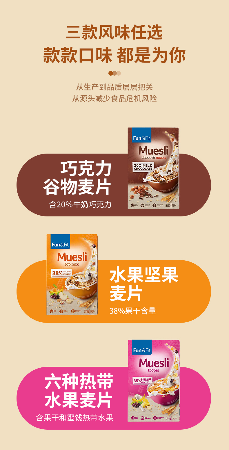 商品名称:Fun&Fit Muesli丰收盒子塞尔维亚进口麦片混合口味250g*3盒