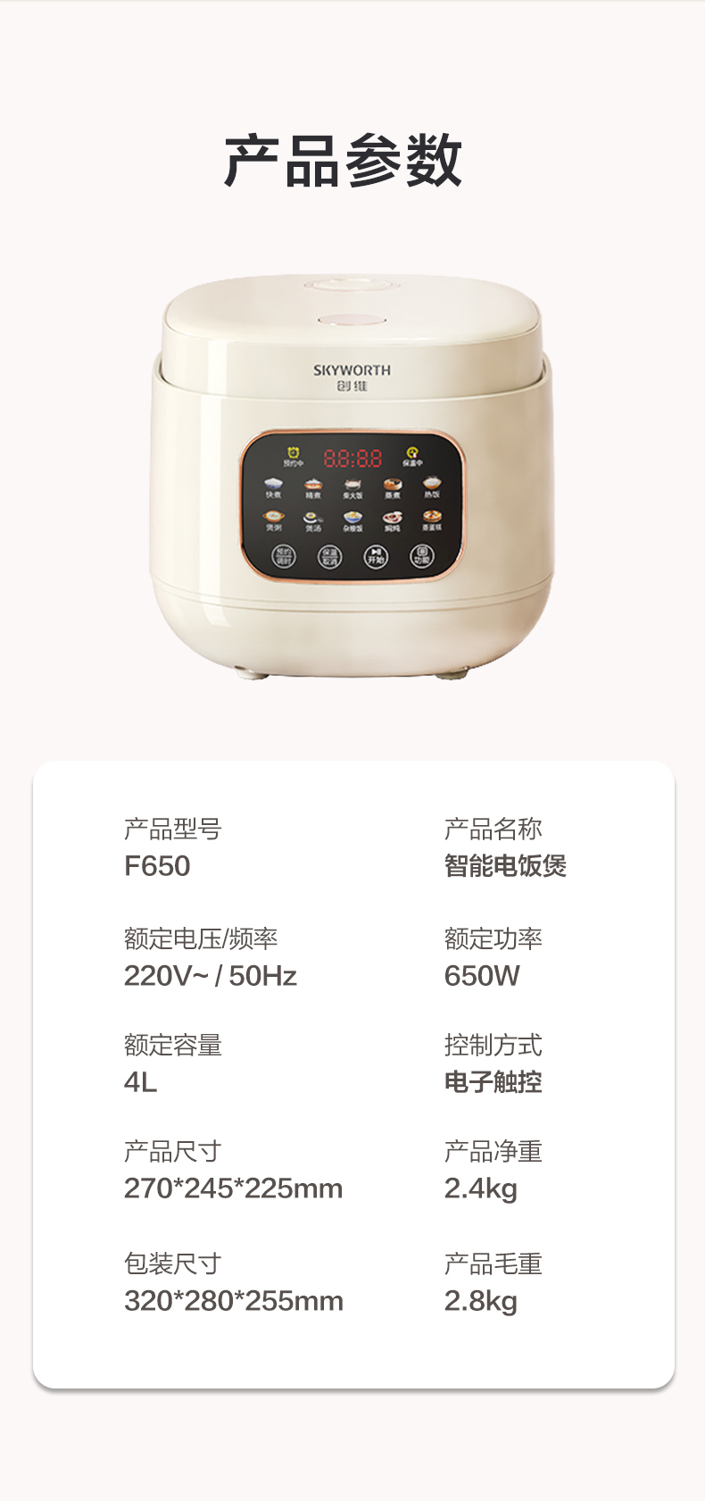 商品名称:SKYWORTH/创维4L智能电饭煲F650