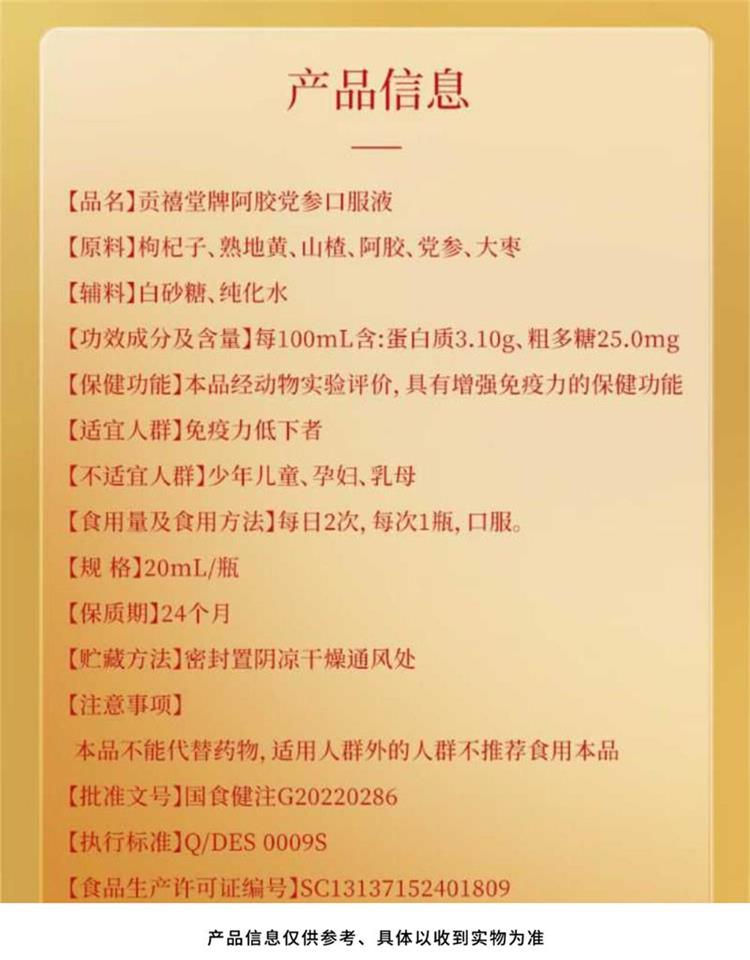 商品名称:杞里香礼盒贡禧堂牌阿胶党参口服液20ml*48支装端午送父母礼品实用
