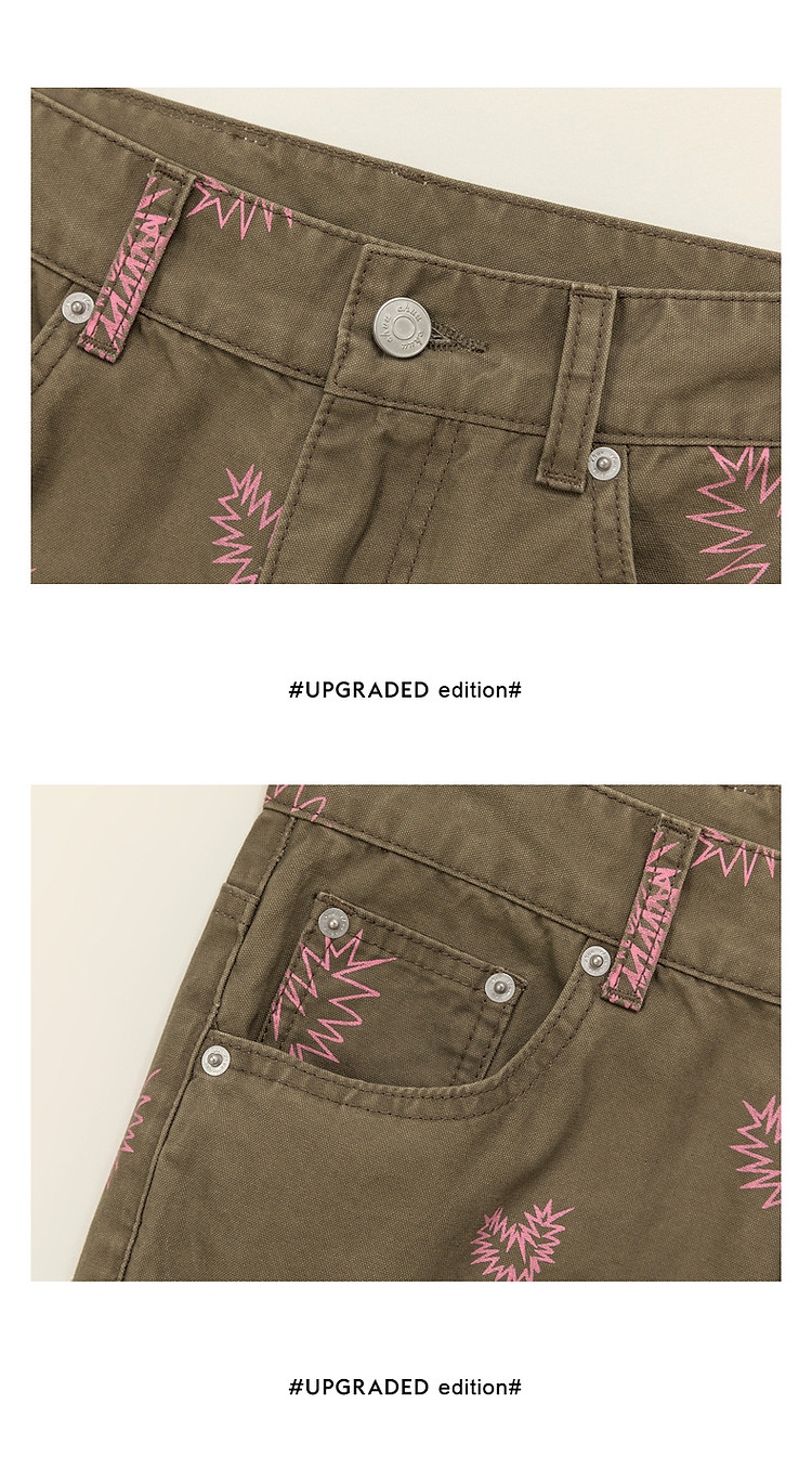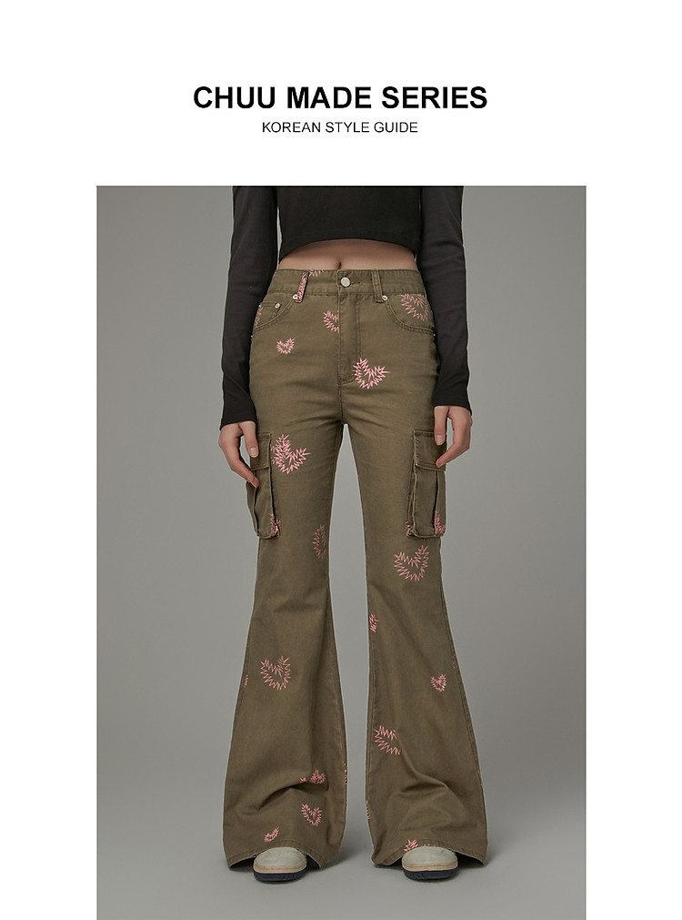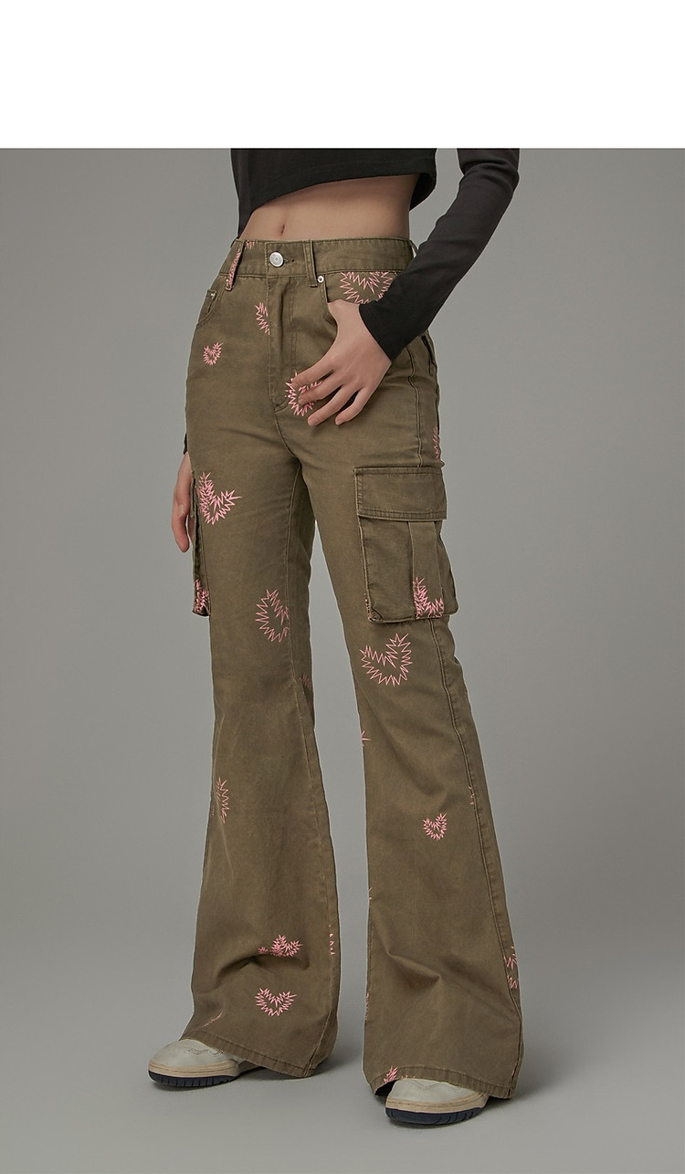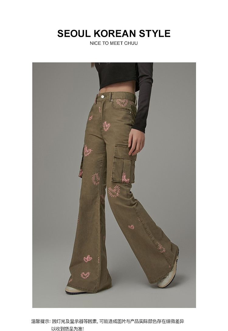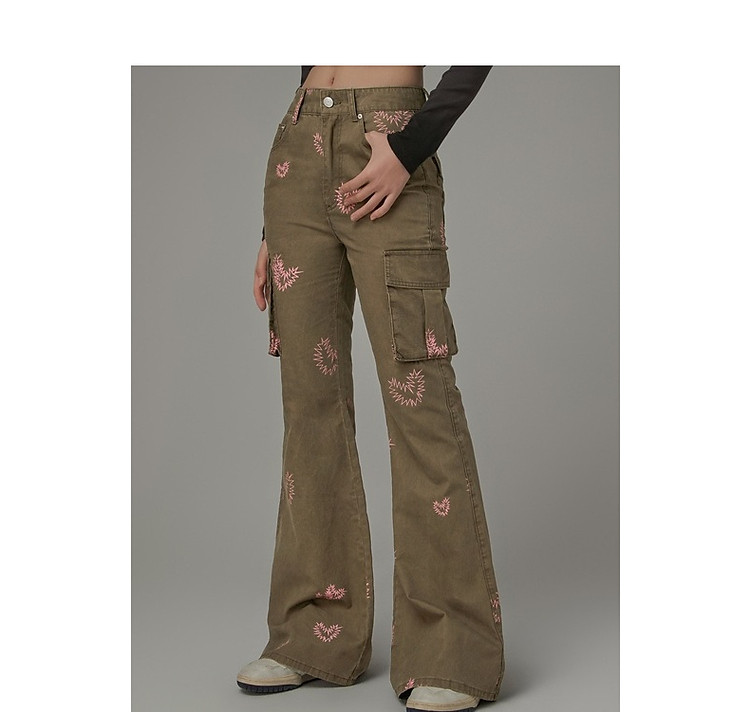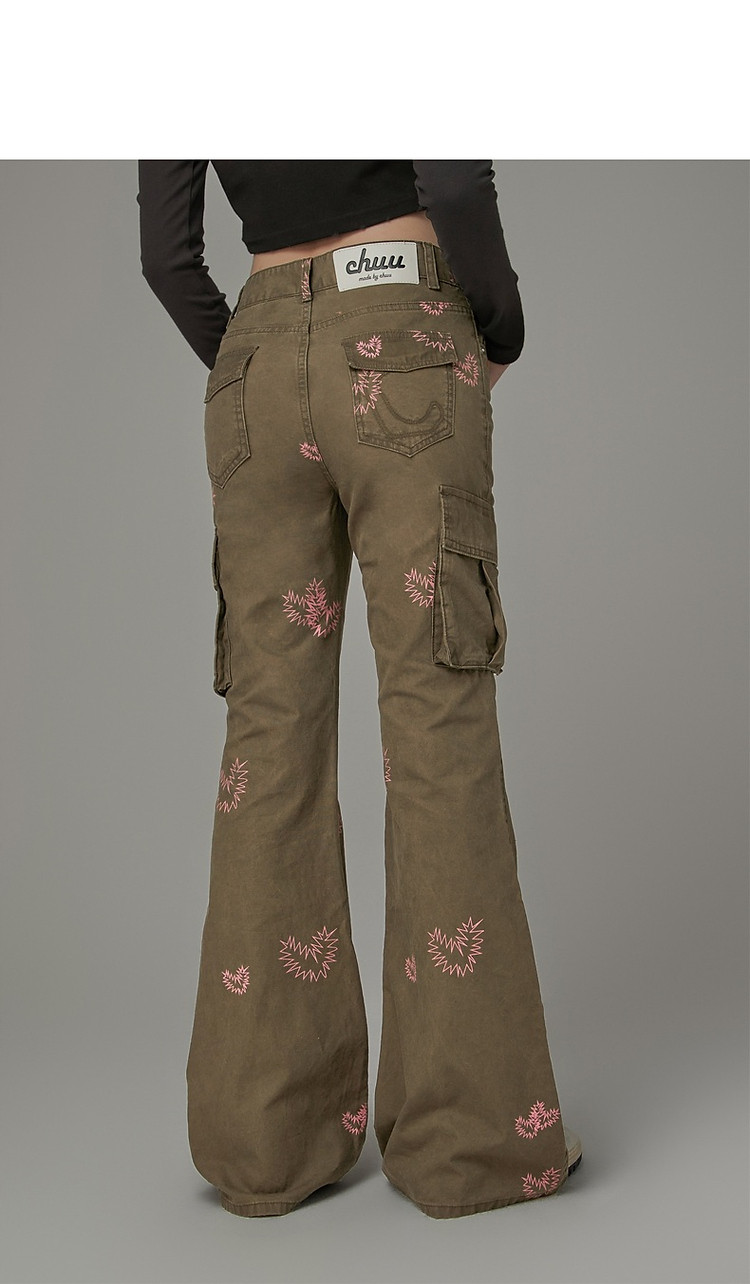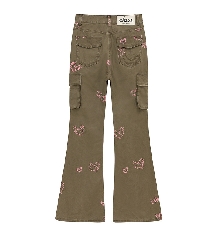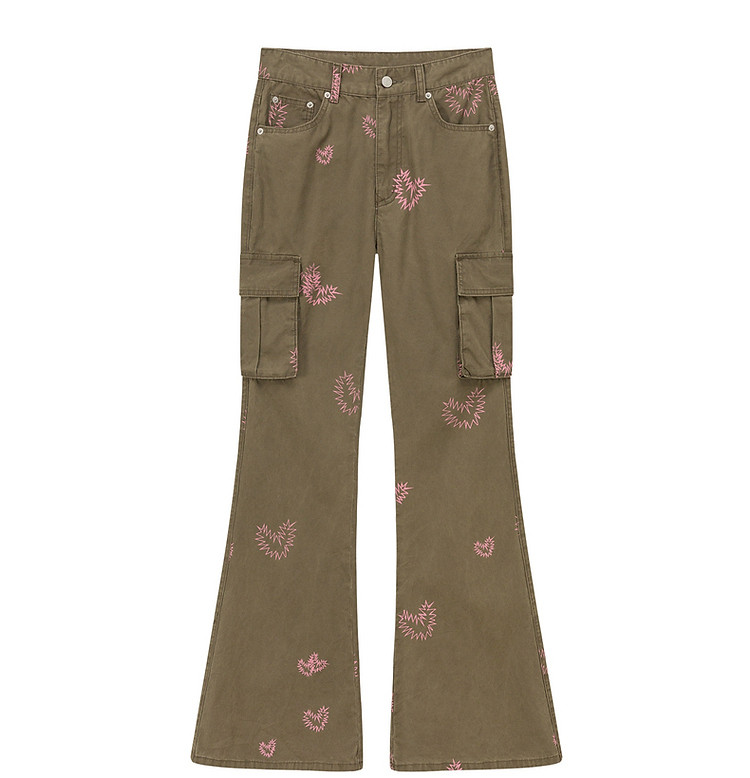 商品名称:爱心粉印花休闲裤女2025夏高妹军绿显长工装微喇裤子 775827