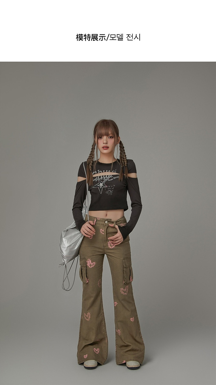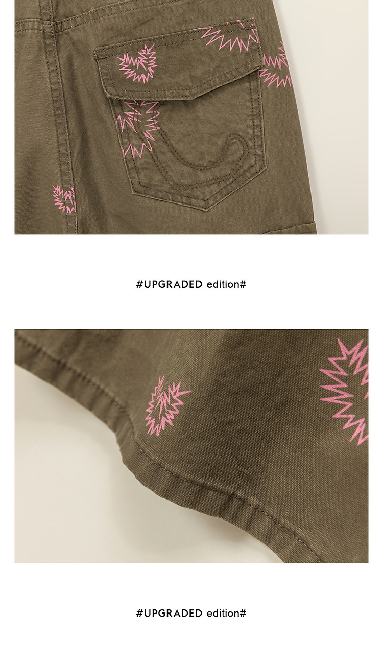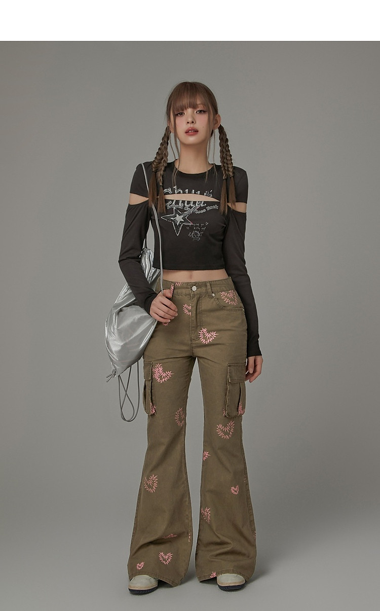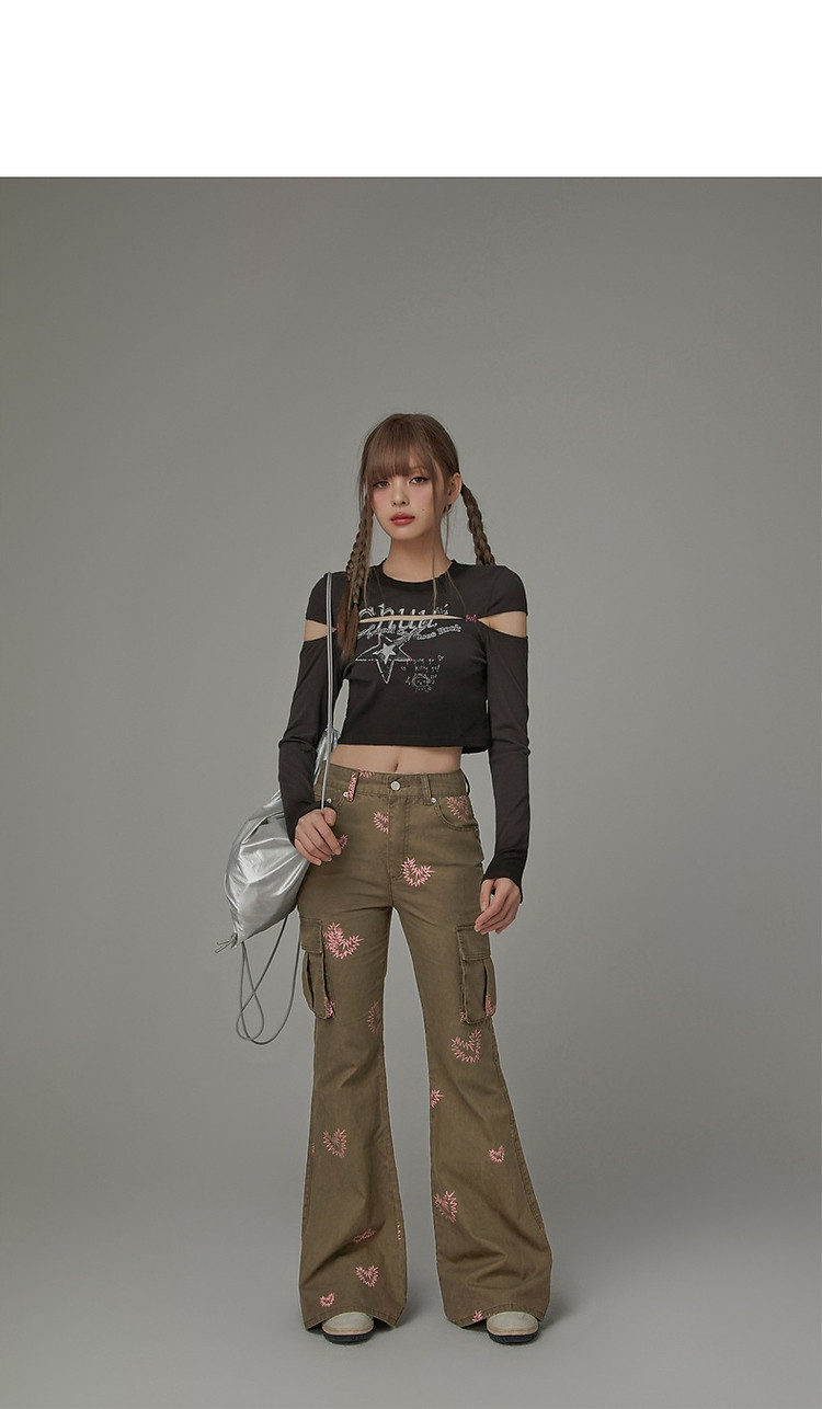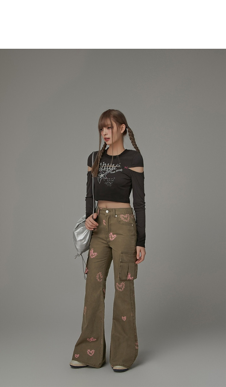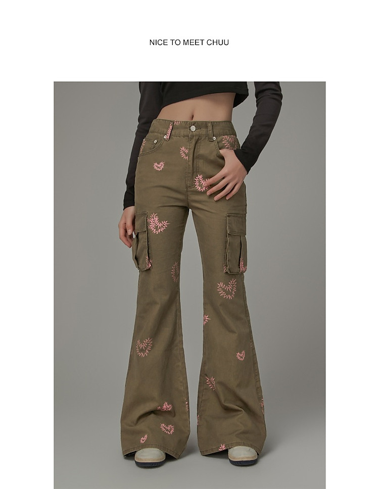 商品名称:爱心粉印花休闲裤女2025夏高妹军绿显长工装微喇裤子 775827