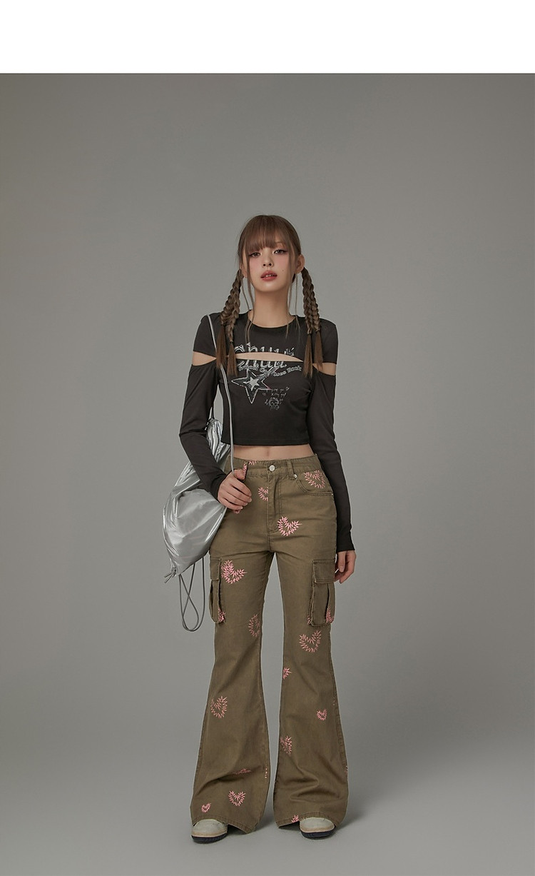 爱心粉印花休闲裤女2025夏高妹军绿显长工装微喇裤子 775827