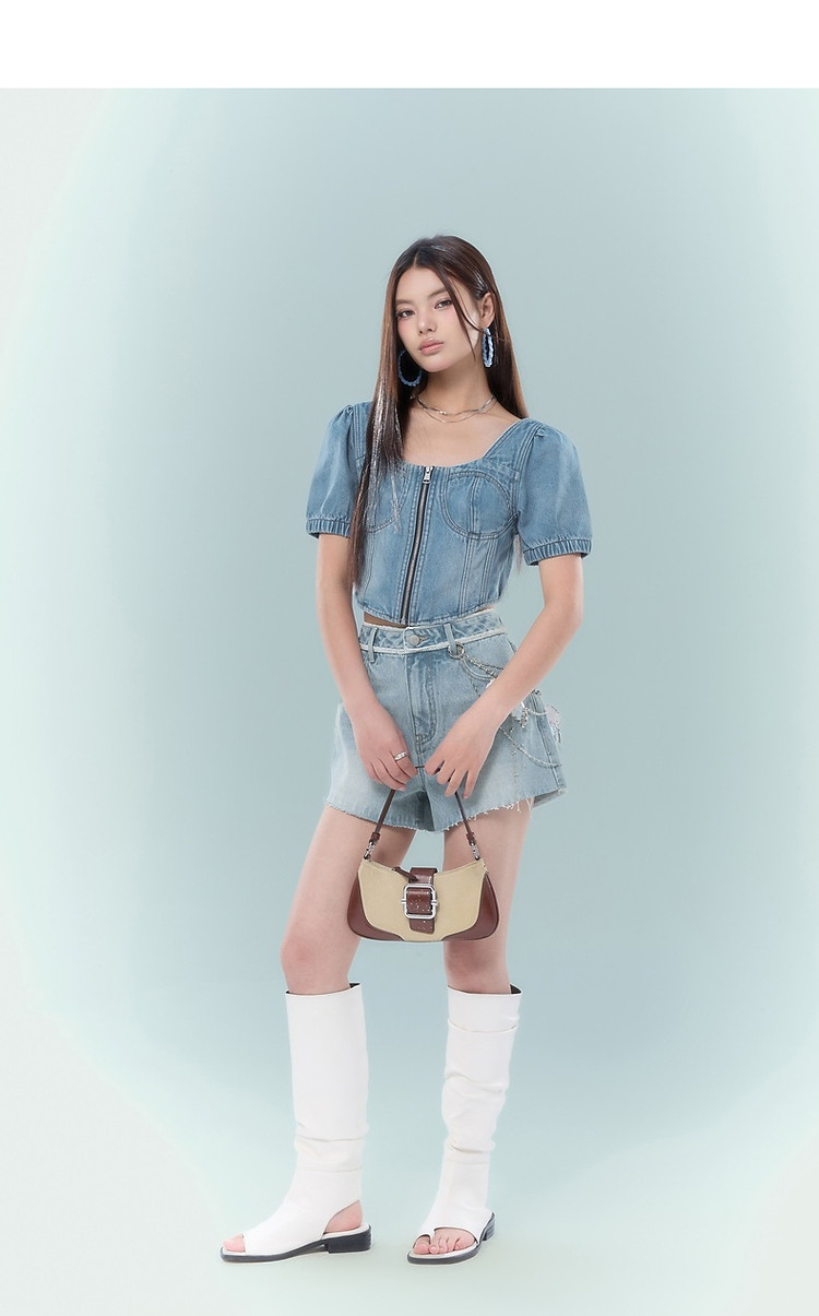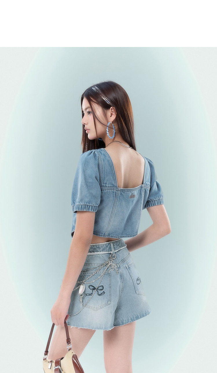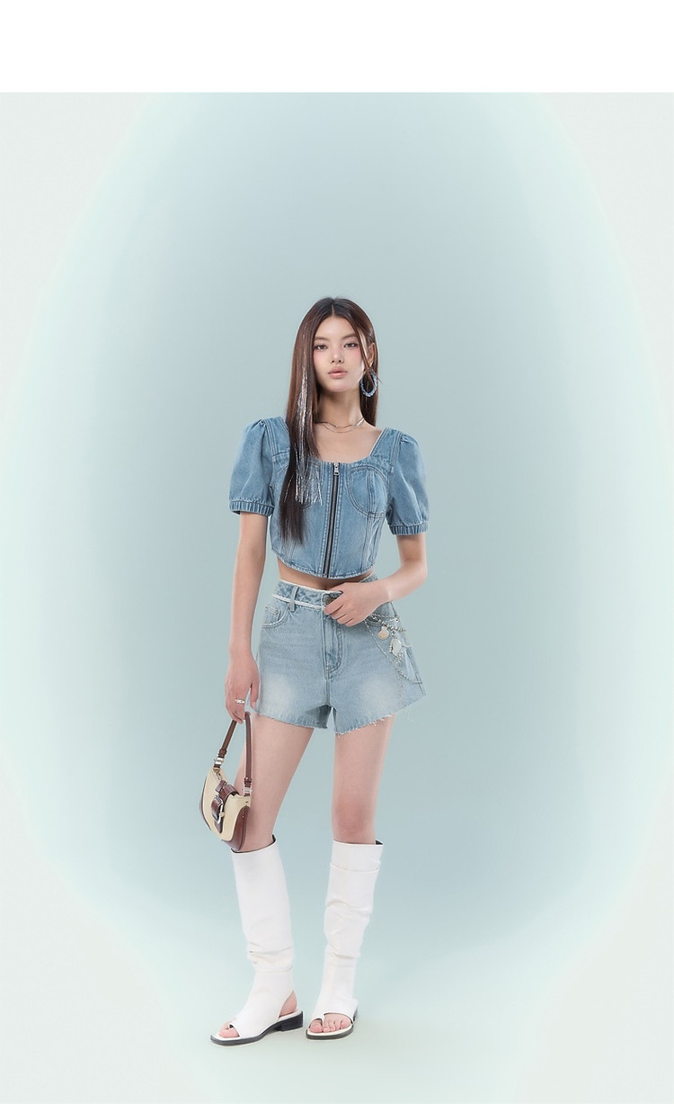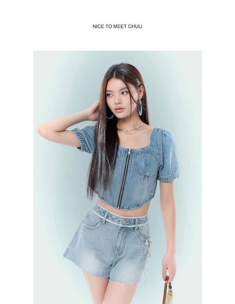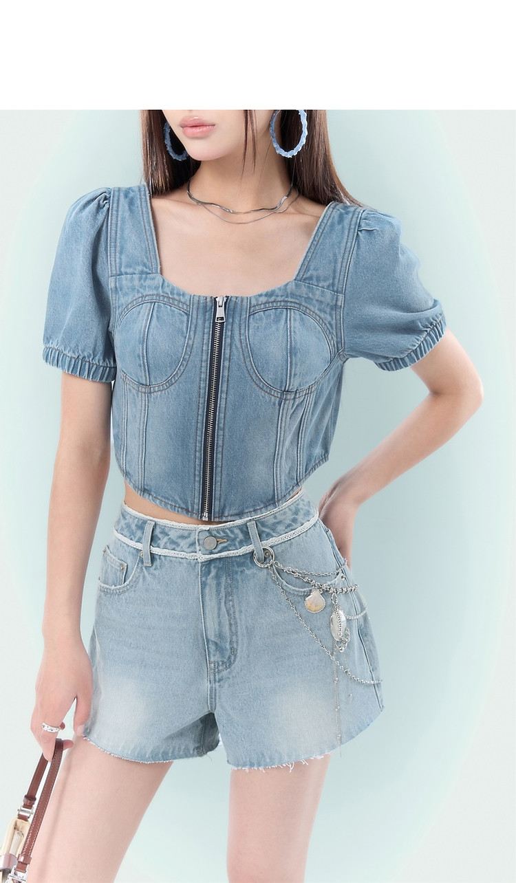 刺绣字母外套女士2025夏拉链泡泡袖短袖牛仔短上衣 015251