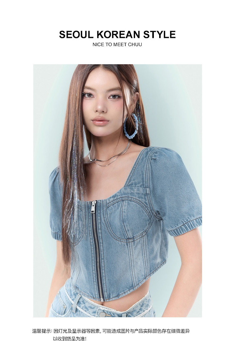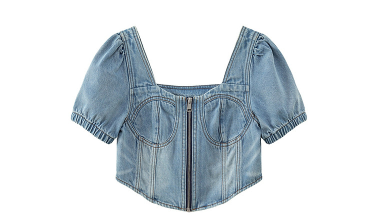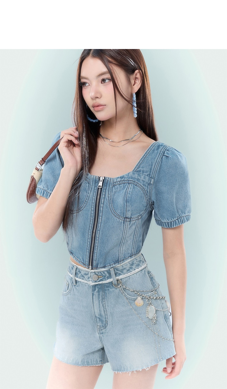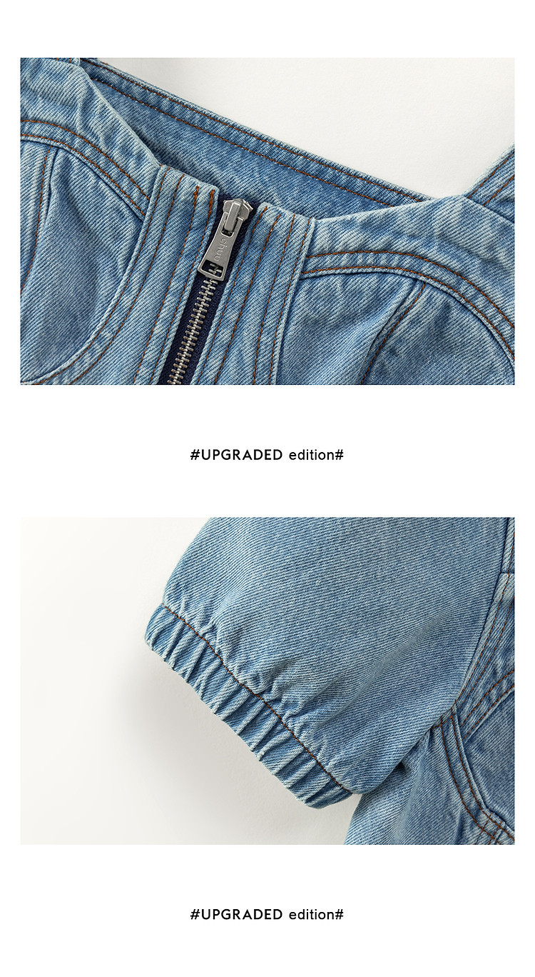 商品名称:刺绣字母外套女士2025夏拉链泡泡袖短袖牛仔短上衣 015251