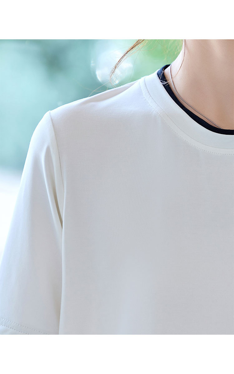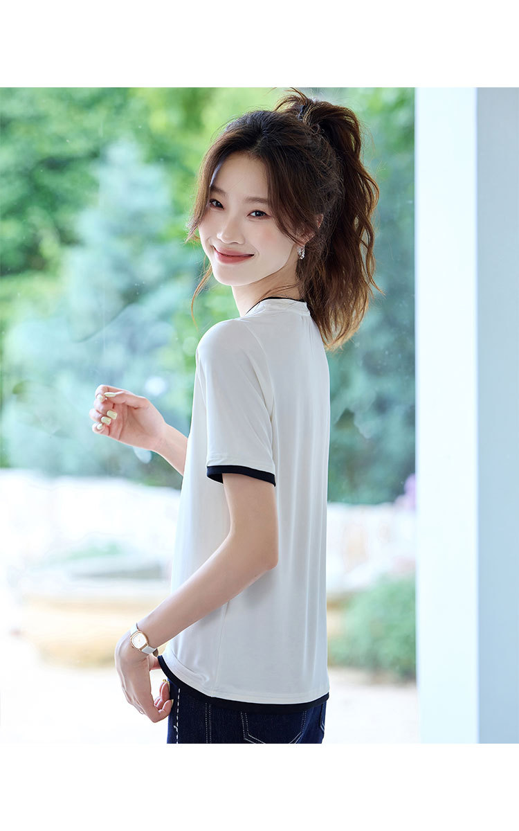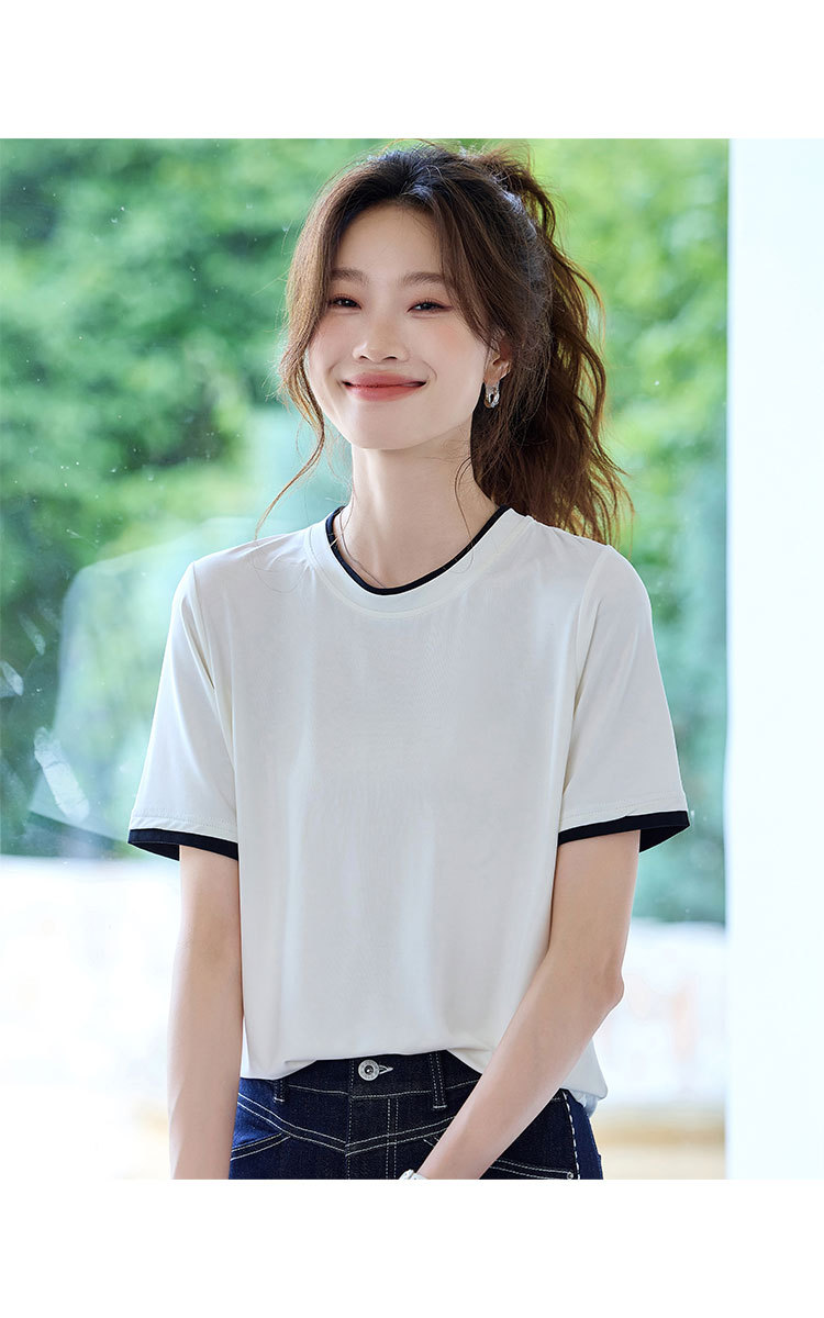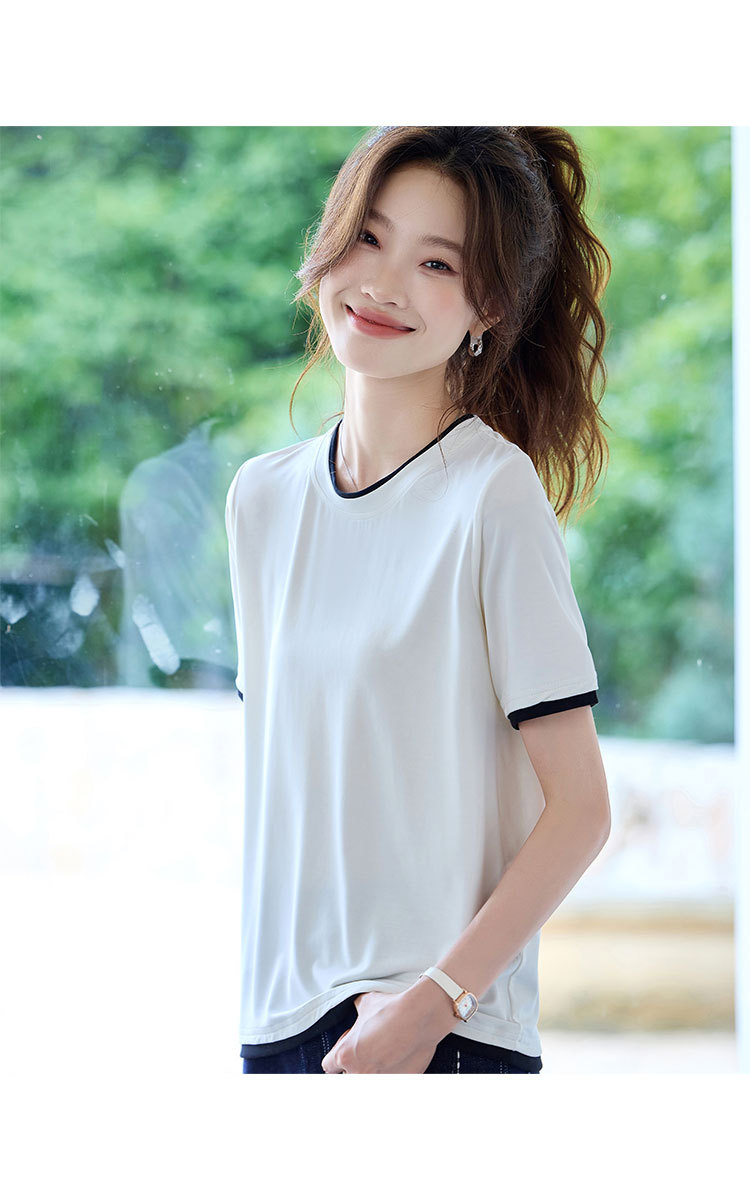 商品名称:2025夏款拼色假两件短袖t恤女圆领内搭减龄休闲打底衫女上衣 987487