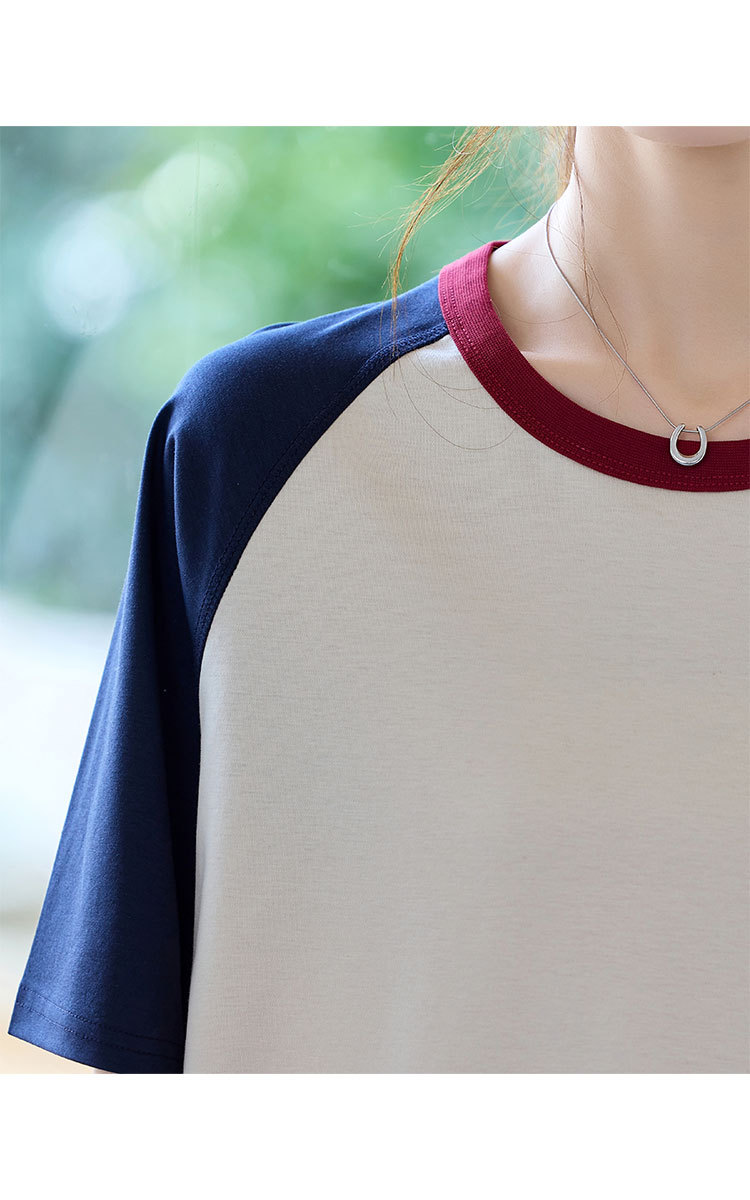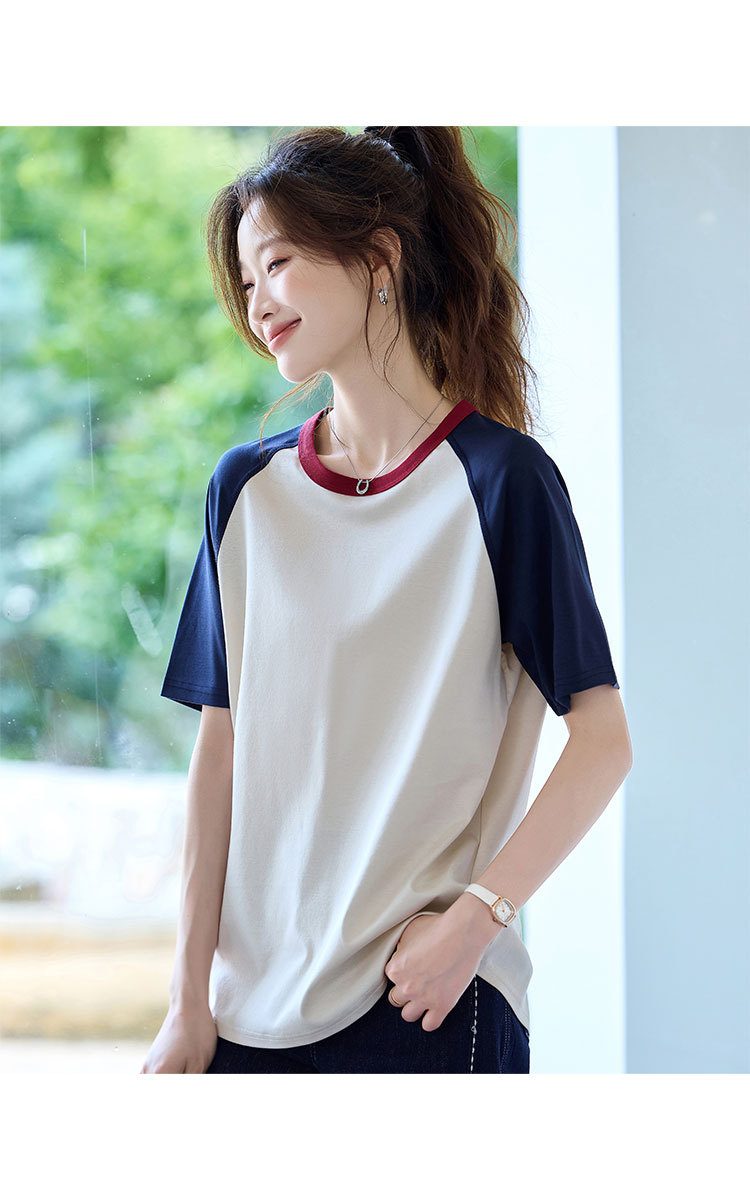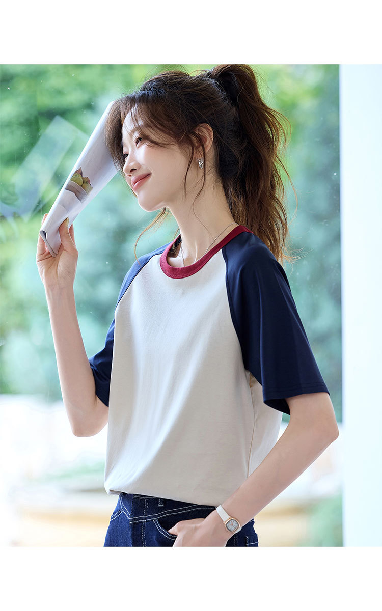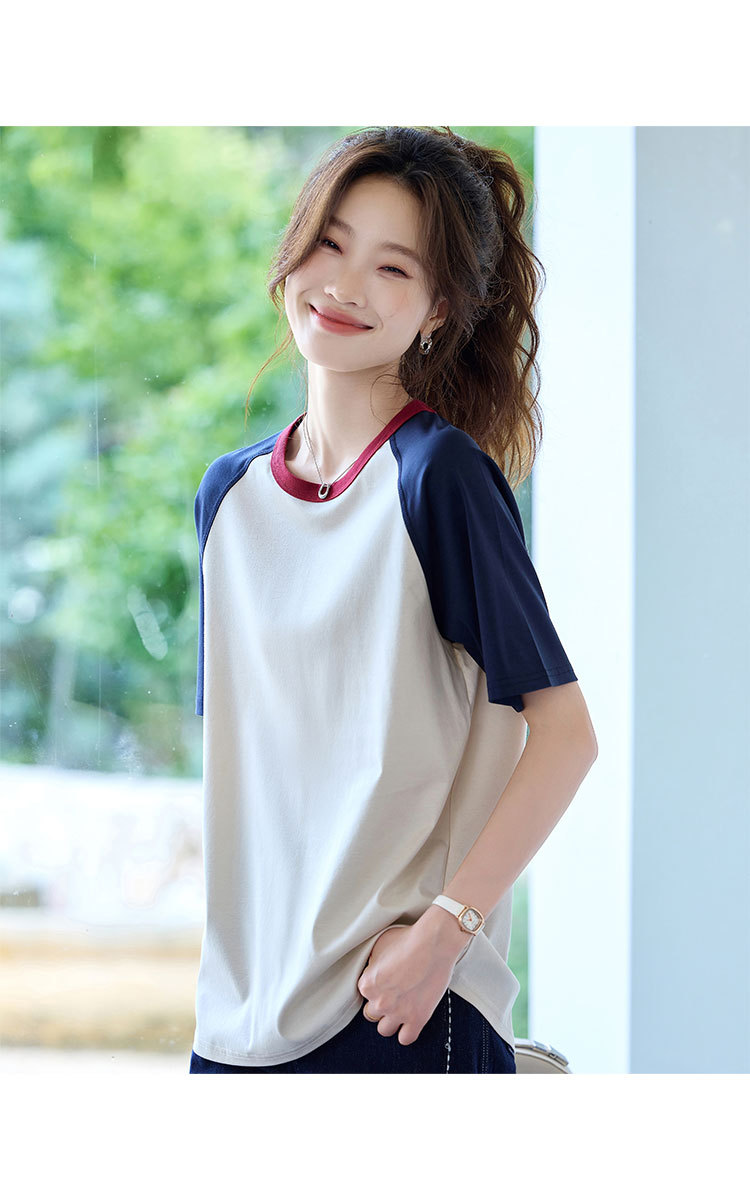 【桑蚕丝牛角袖戏精】夏季撞色减龄短袖衫宽松圆领女式t恤上衣 991583