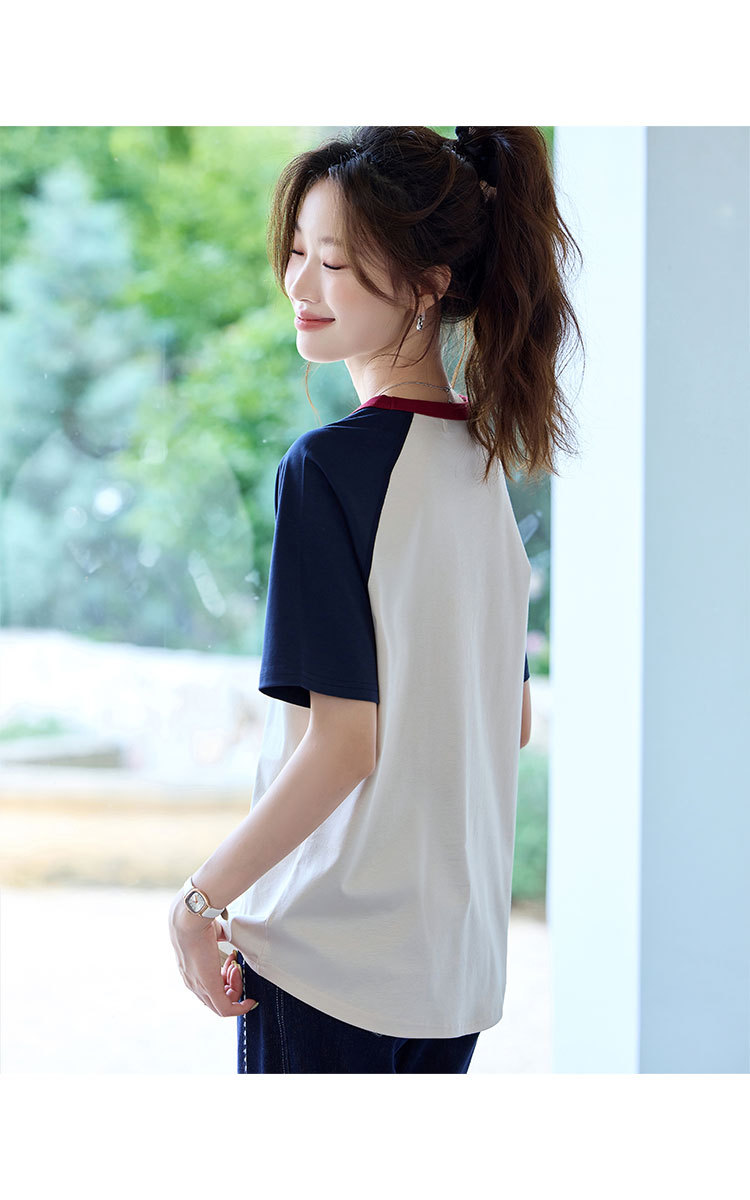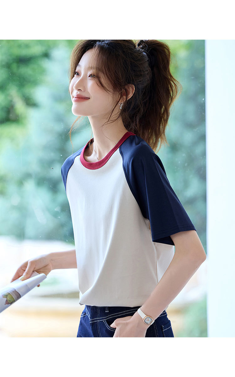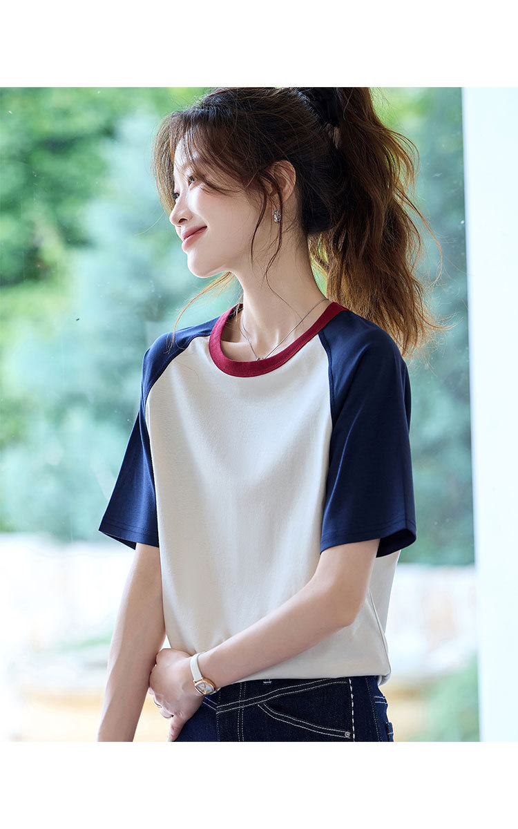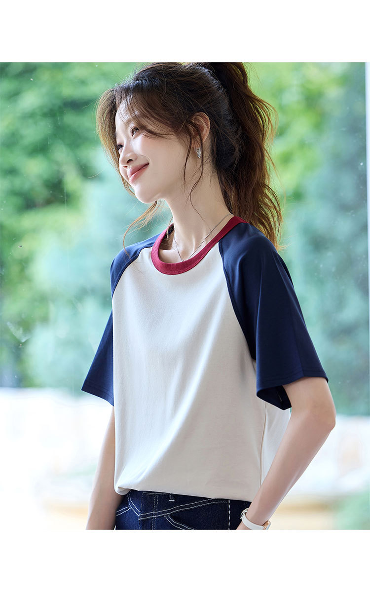 【桑蚕丝牛角袖戏精】夏季撞色减龄短袖衫宽松圆领女式t恤上衣 991583