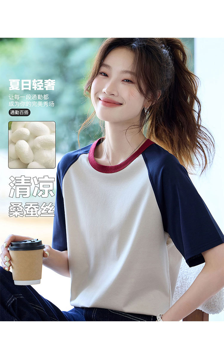 商品名称:【桑蚕丝牛角袖戏精】夏季撞色减龄短袖衫宽松圆领女式t恤上衣 991583