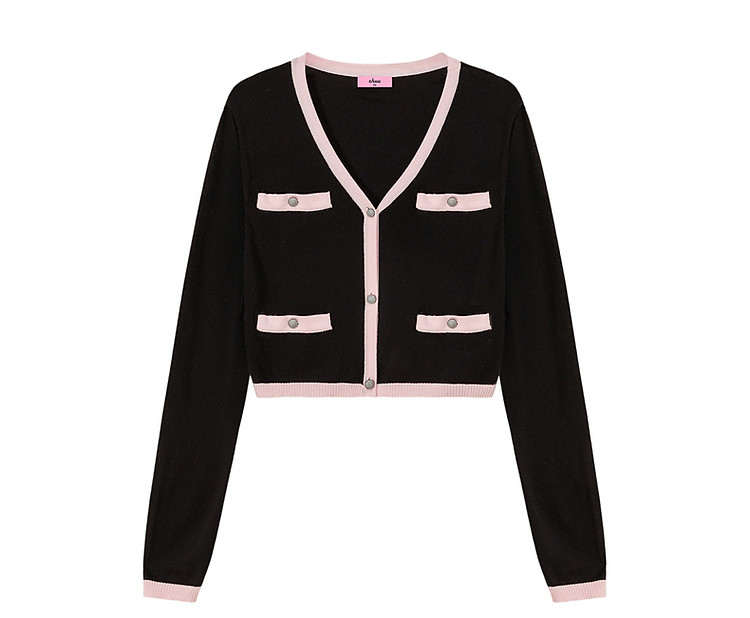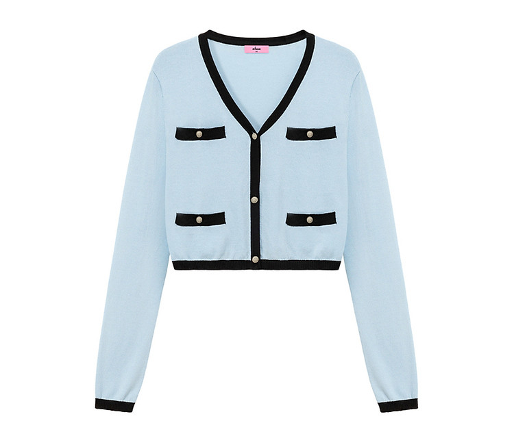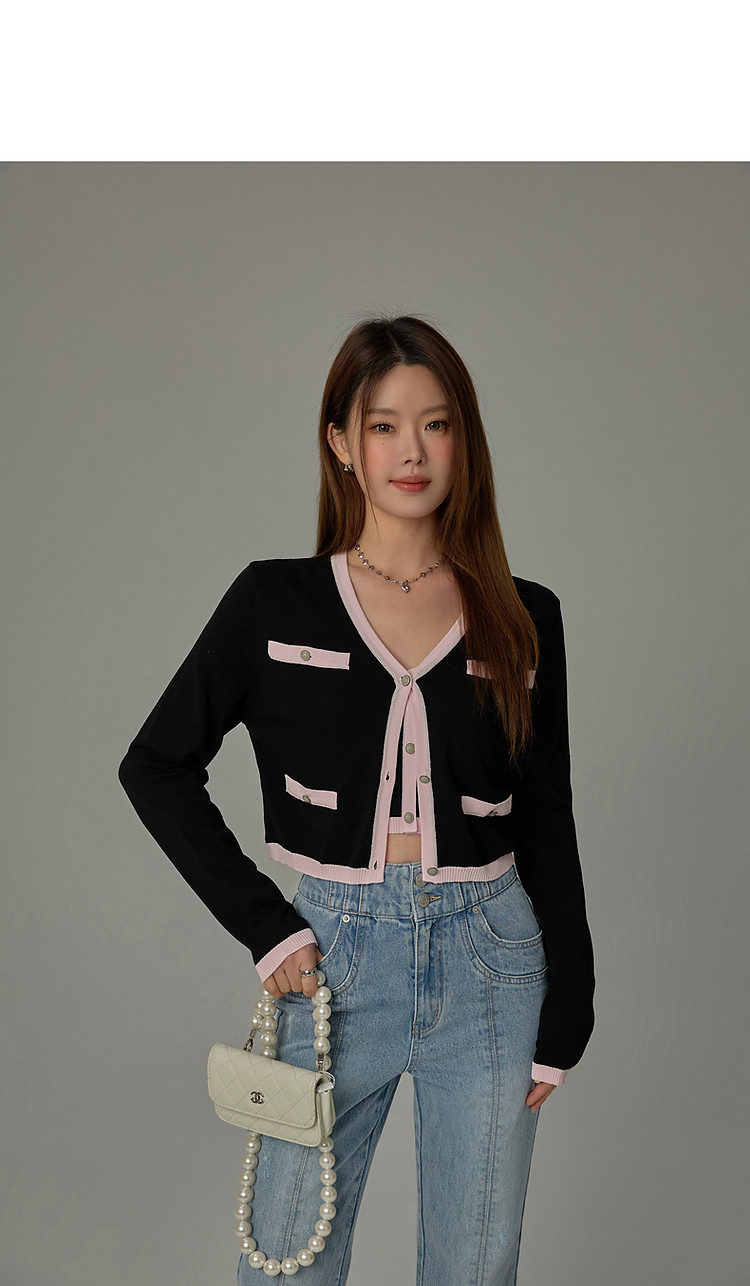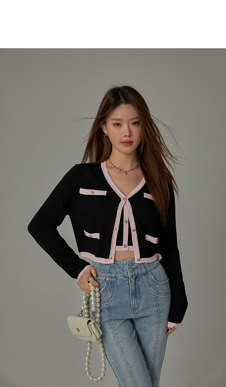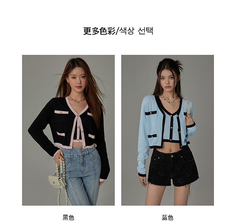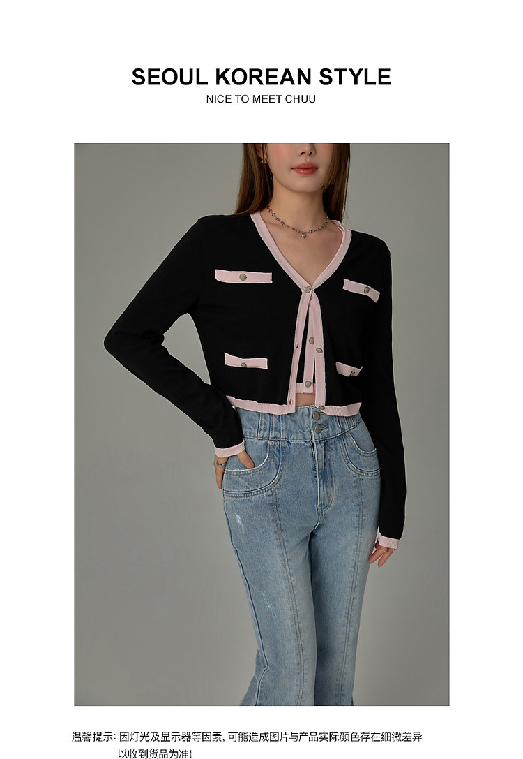 商品名称:撞色拼接V领毛衣女2025夏学院风休闲开衫长袖针织衫 957907