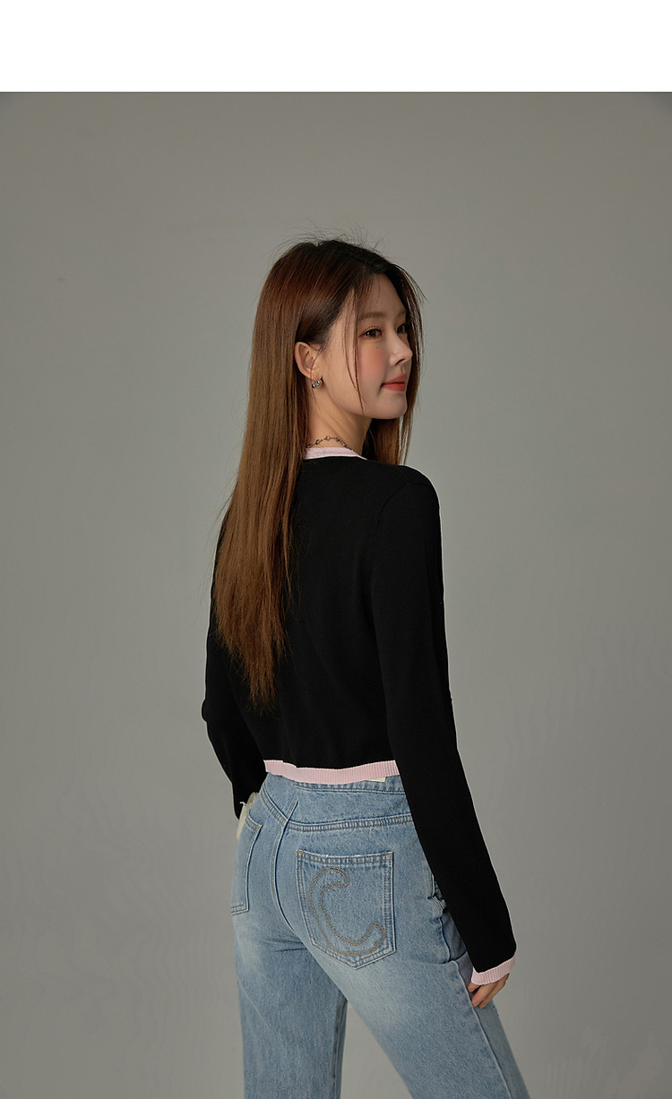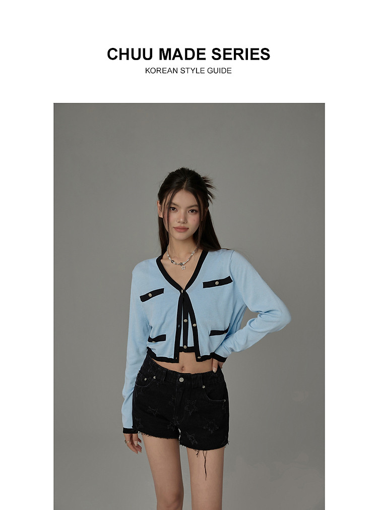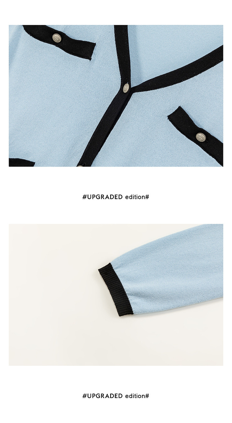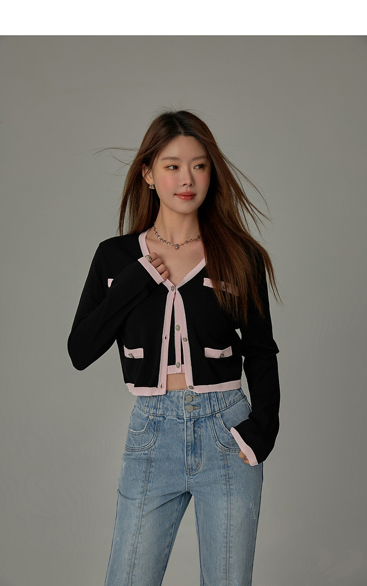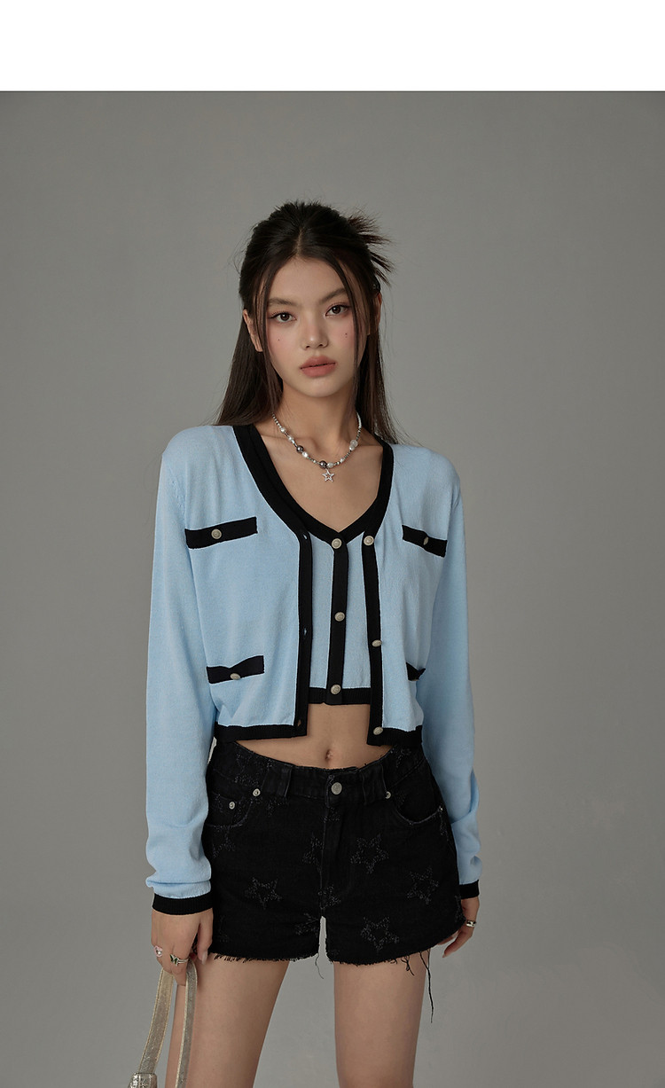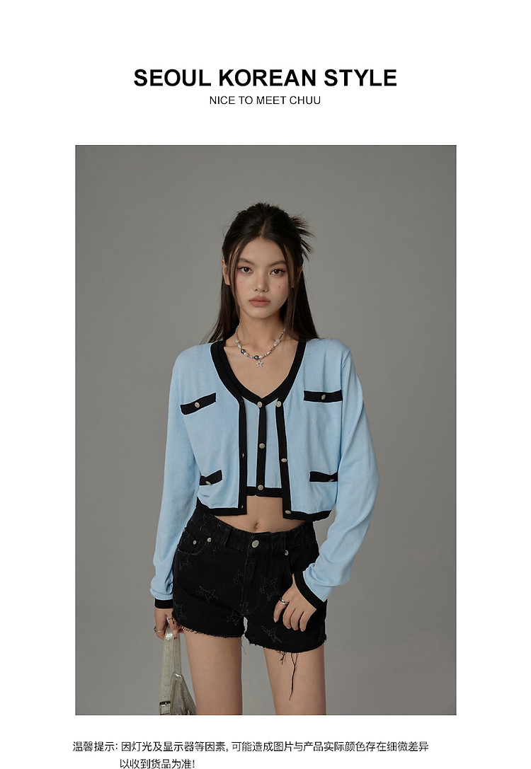 商品名称:撞色拼接V领毛衣女2025夏学院风休闲开衫长袖针织衫 957907