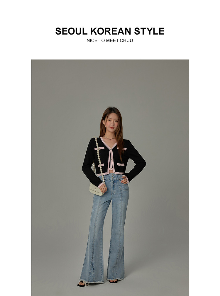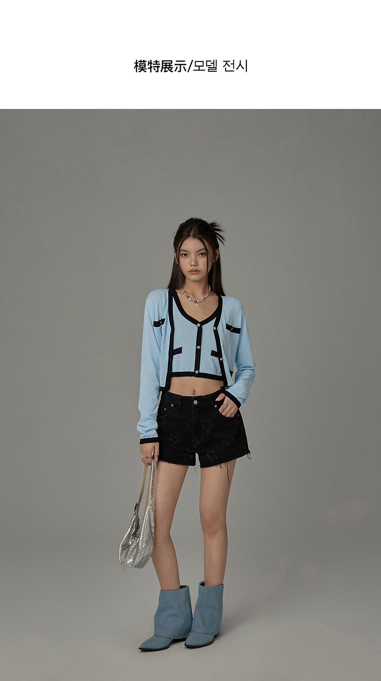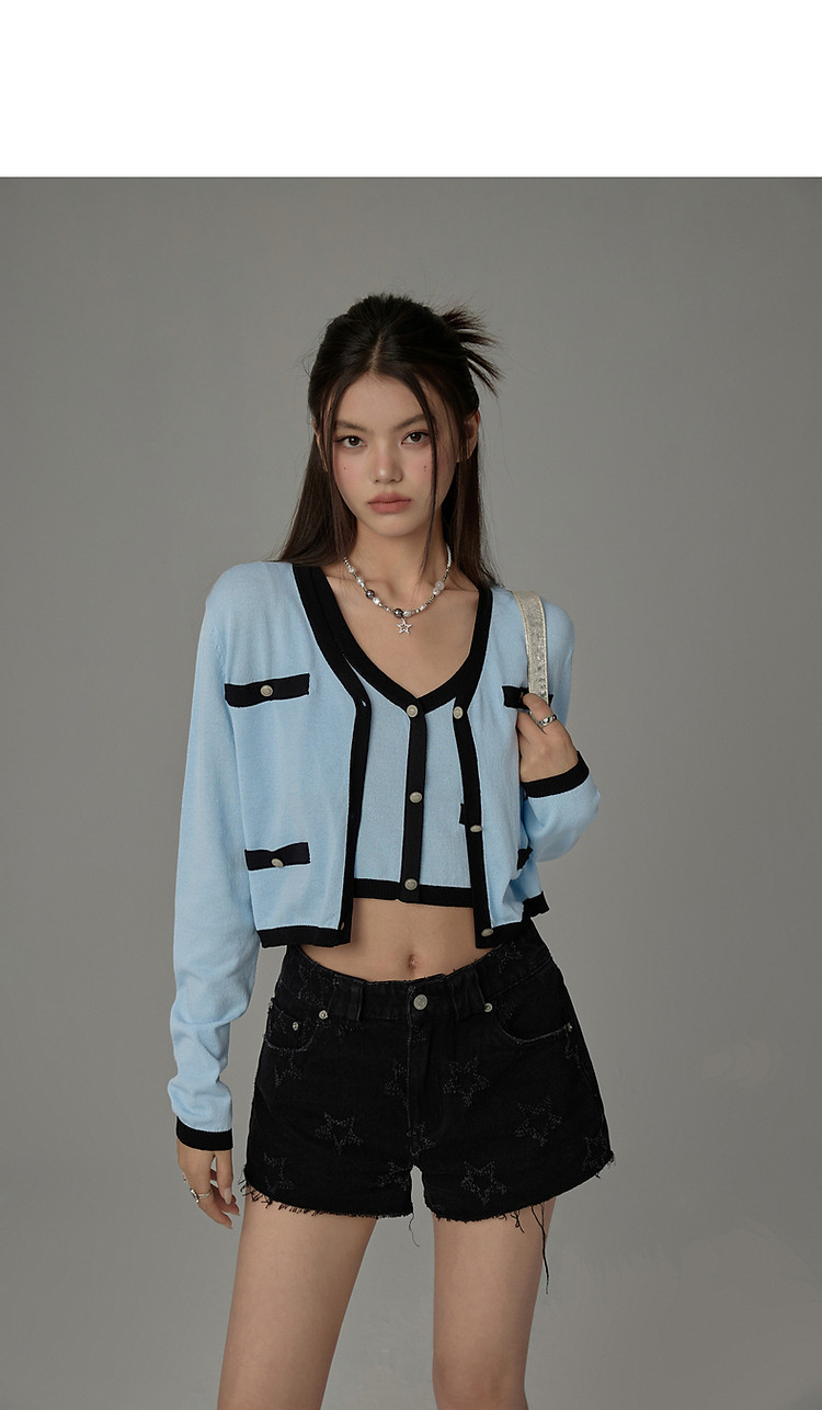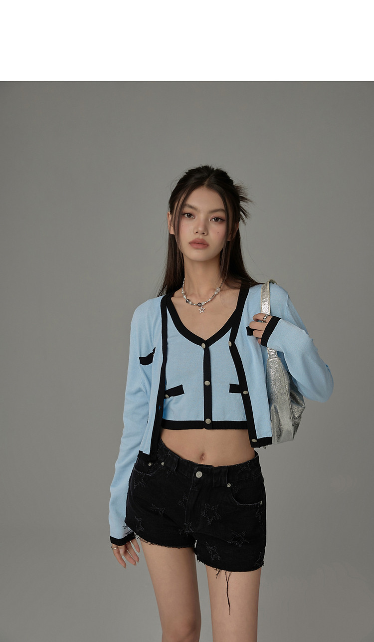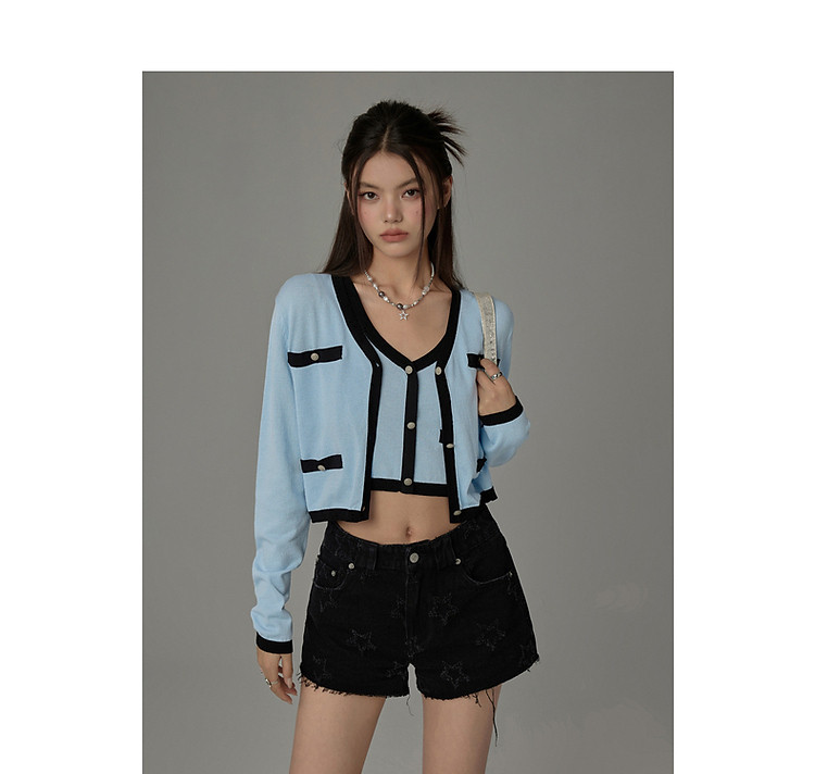 商品名称:撞色拼接V领毛衣女2025夏学院风休闲开衫长袖针织衫 957907