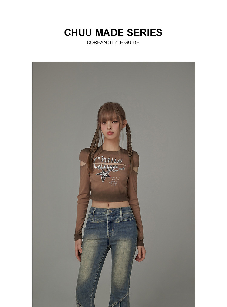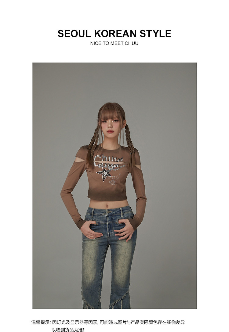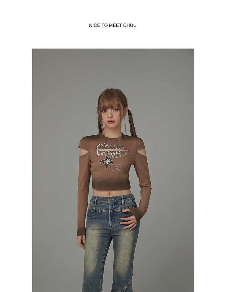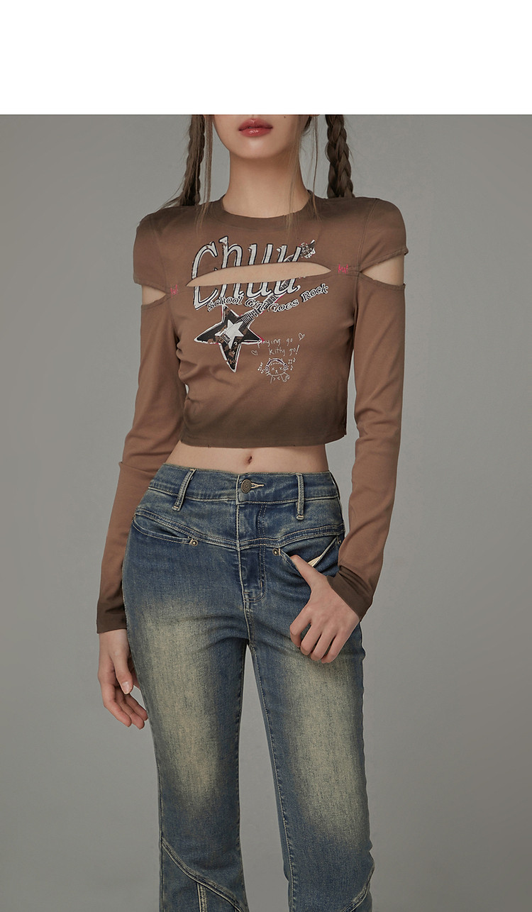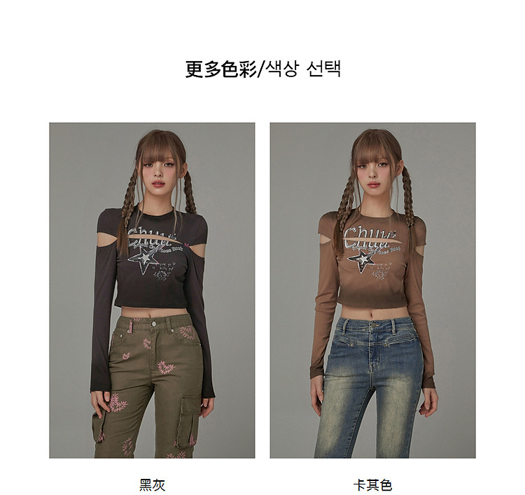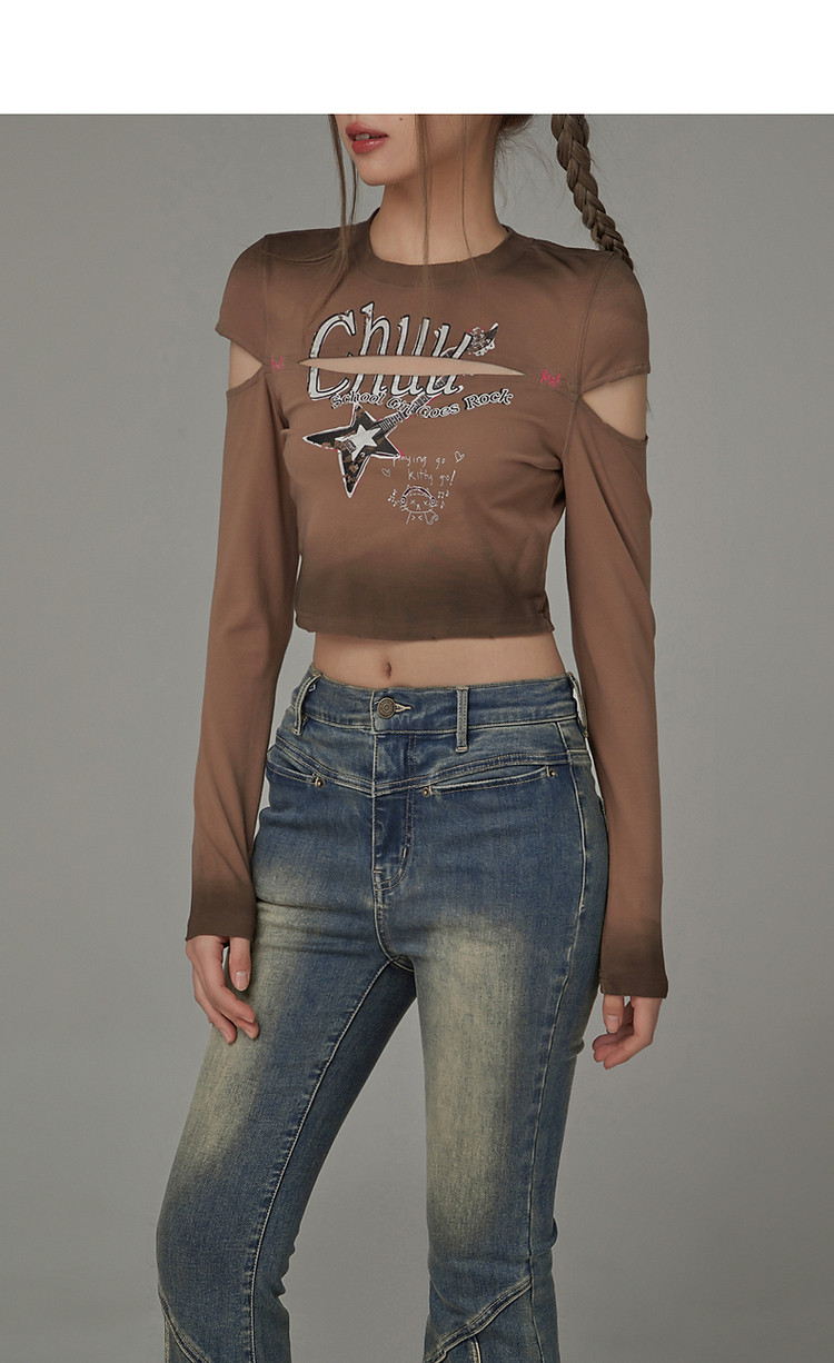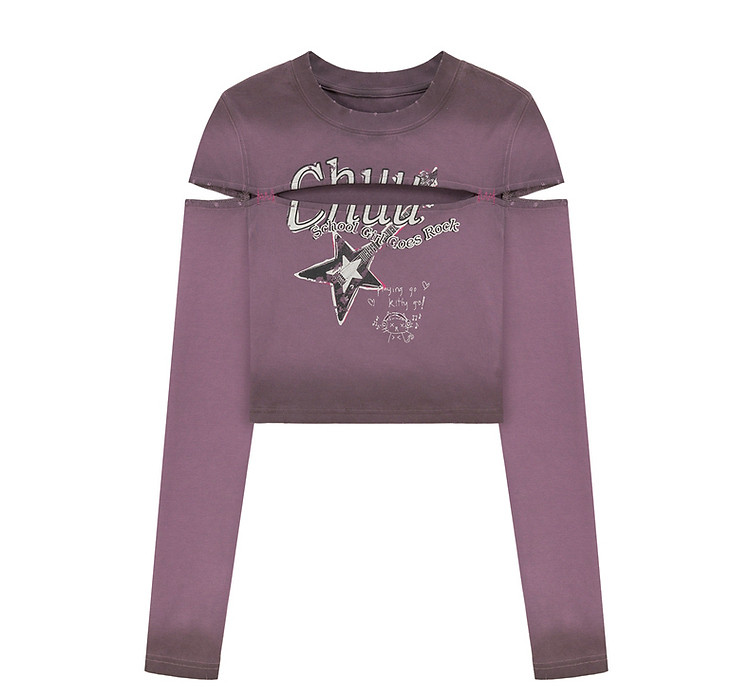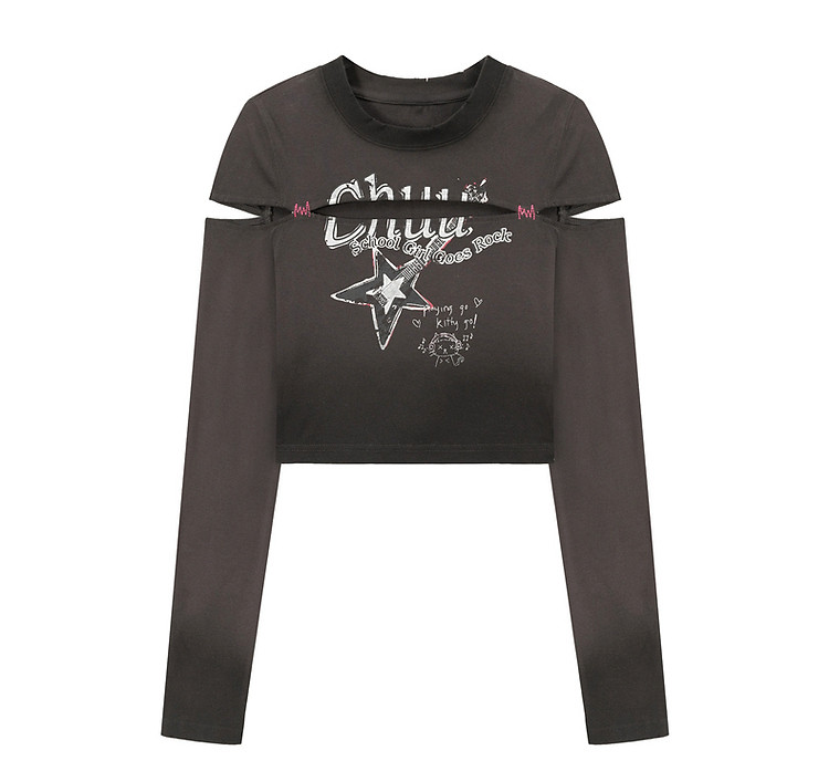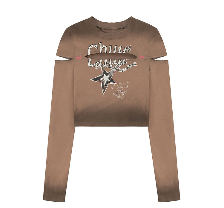 字母卡通印花2025夏镂空渐变色磨破长袖T恤 368147