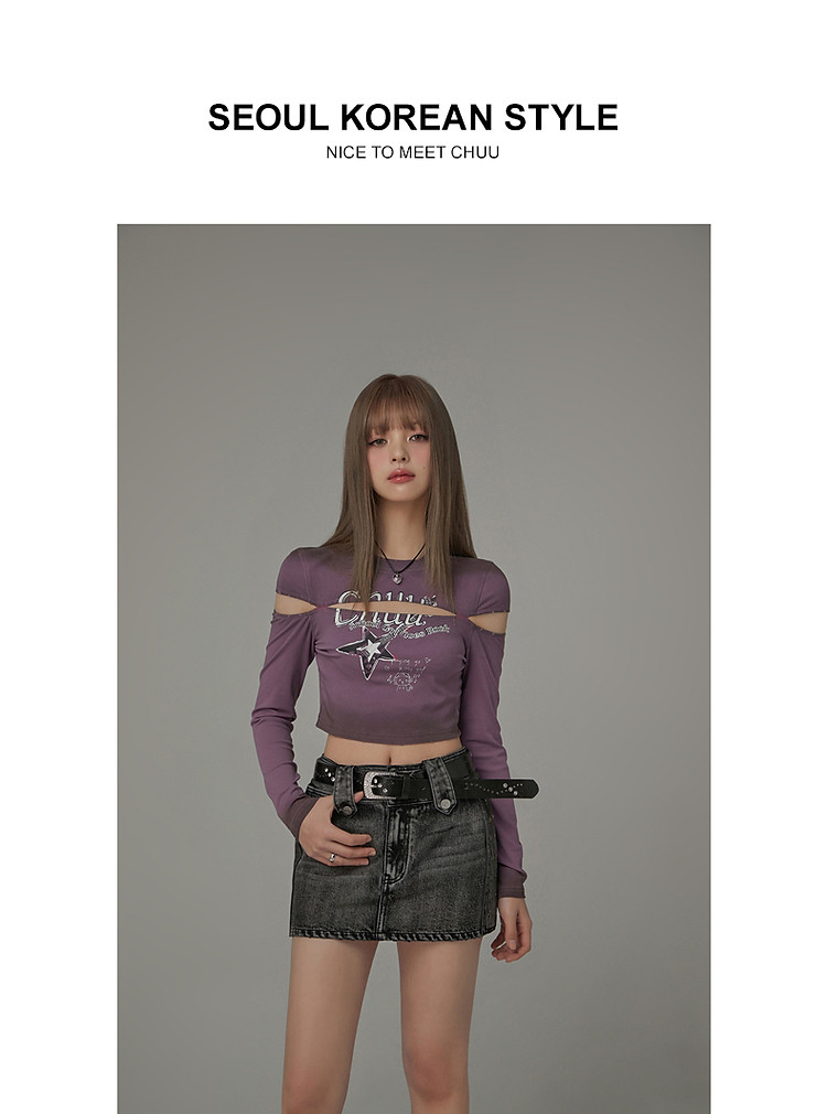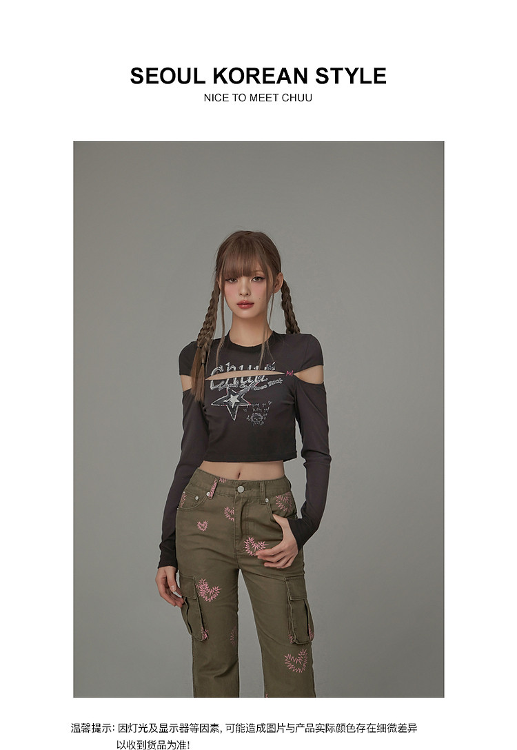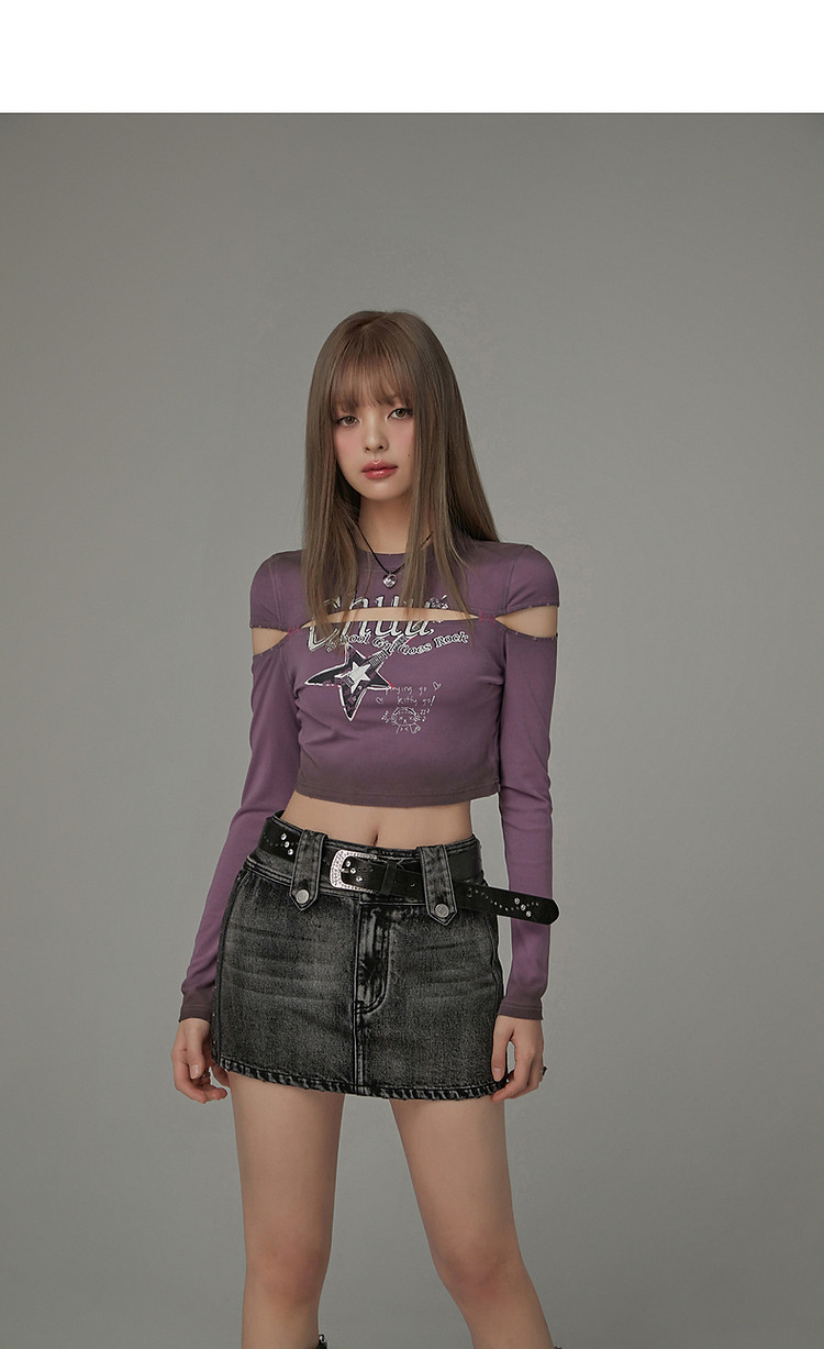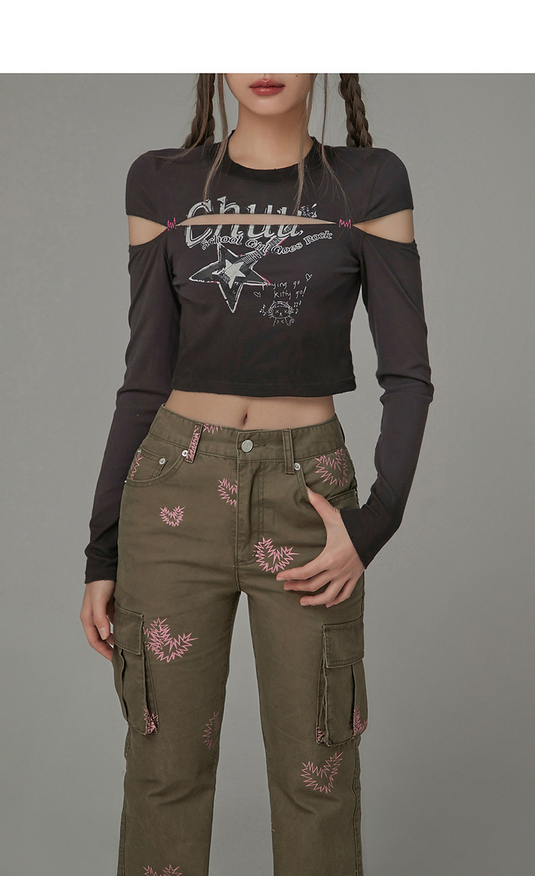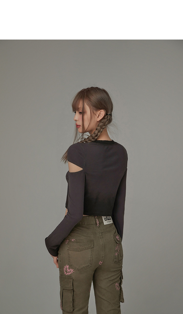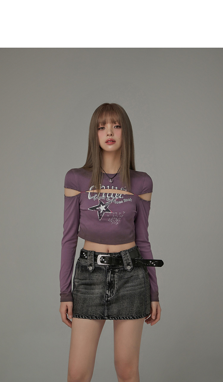 字母卡通印花2025夏镂空渐变色磨破长袖T恤 368147