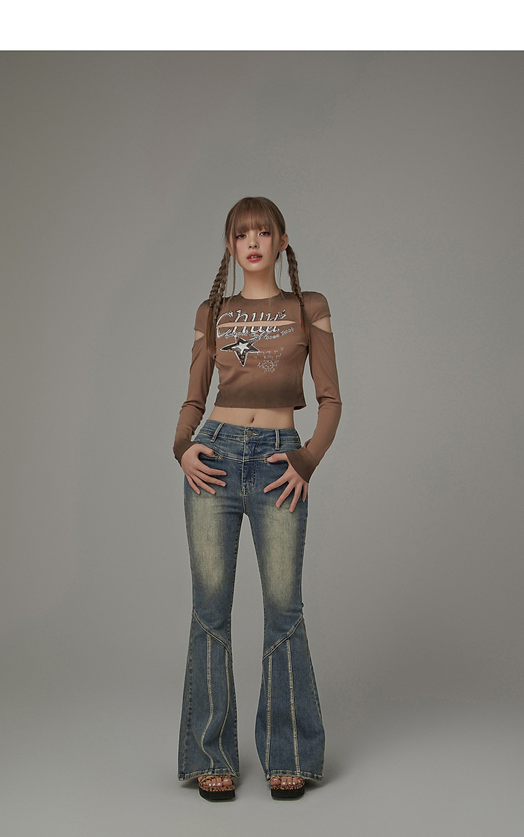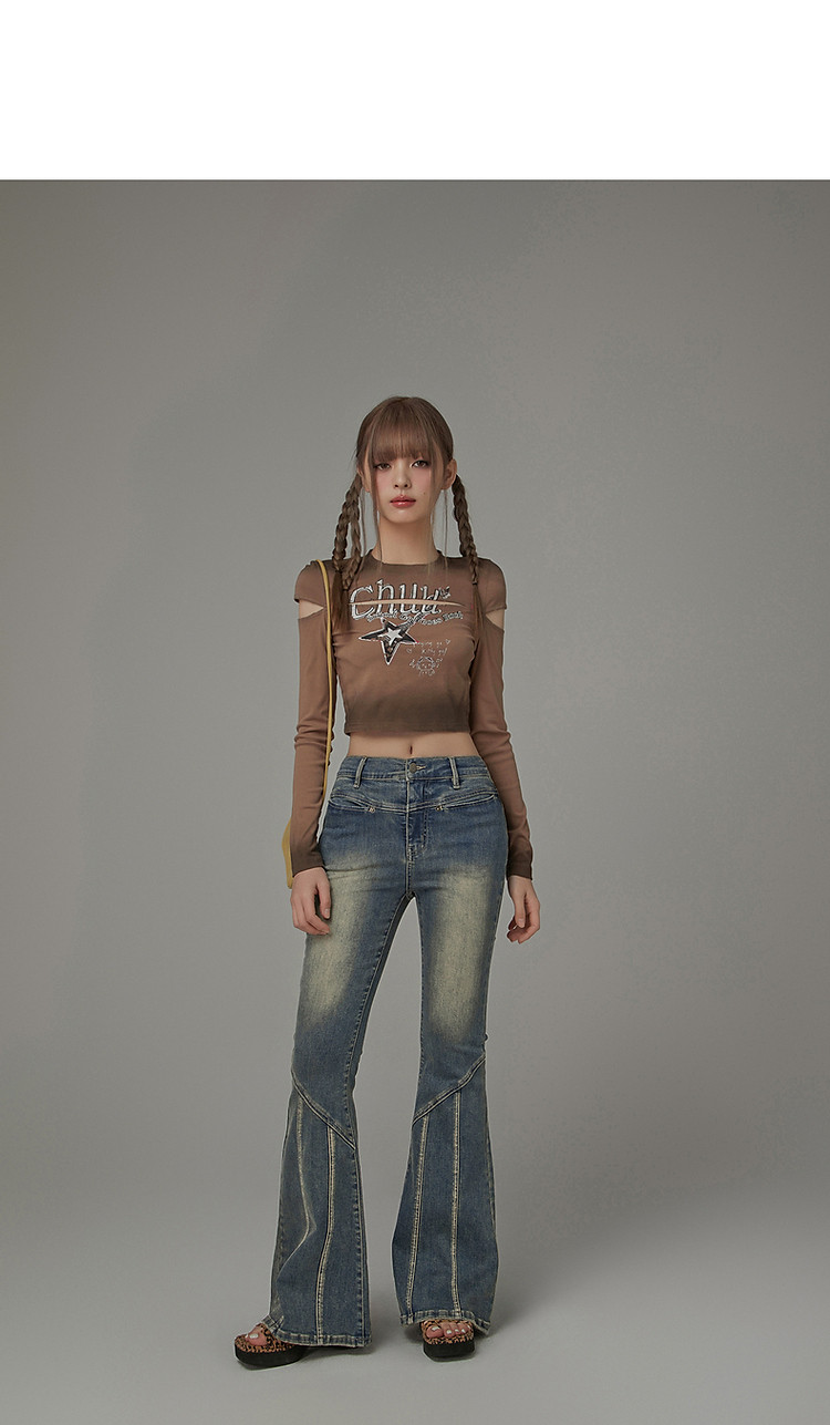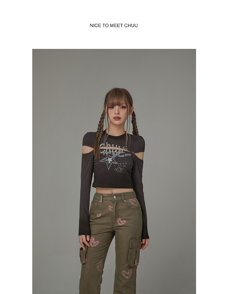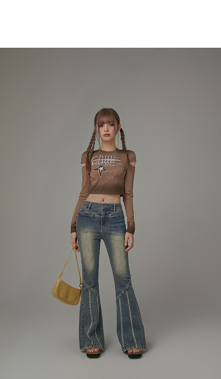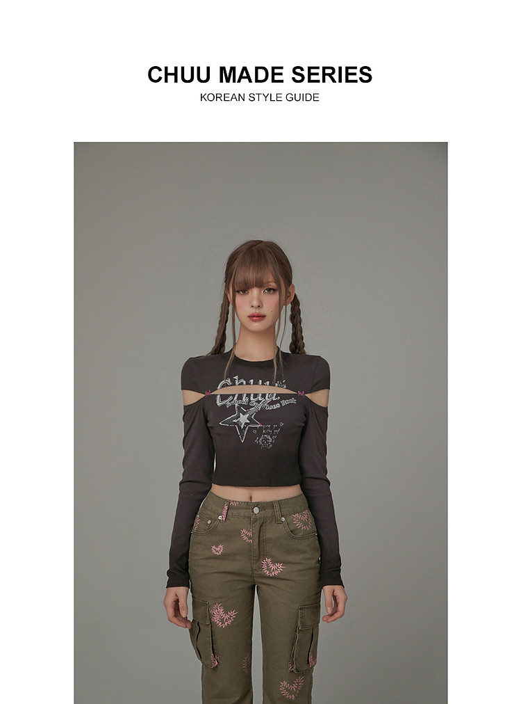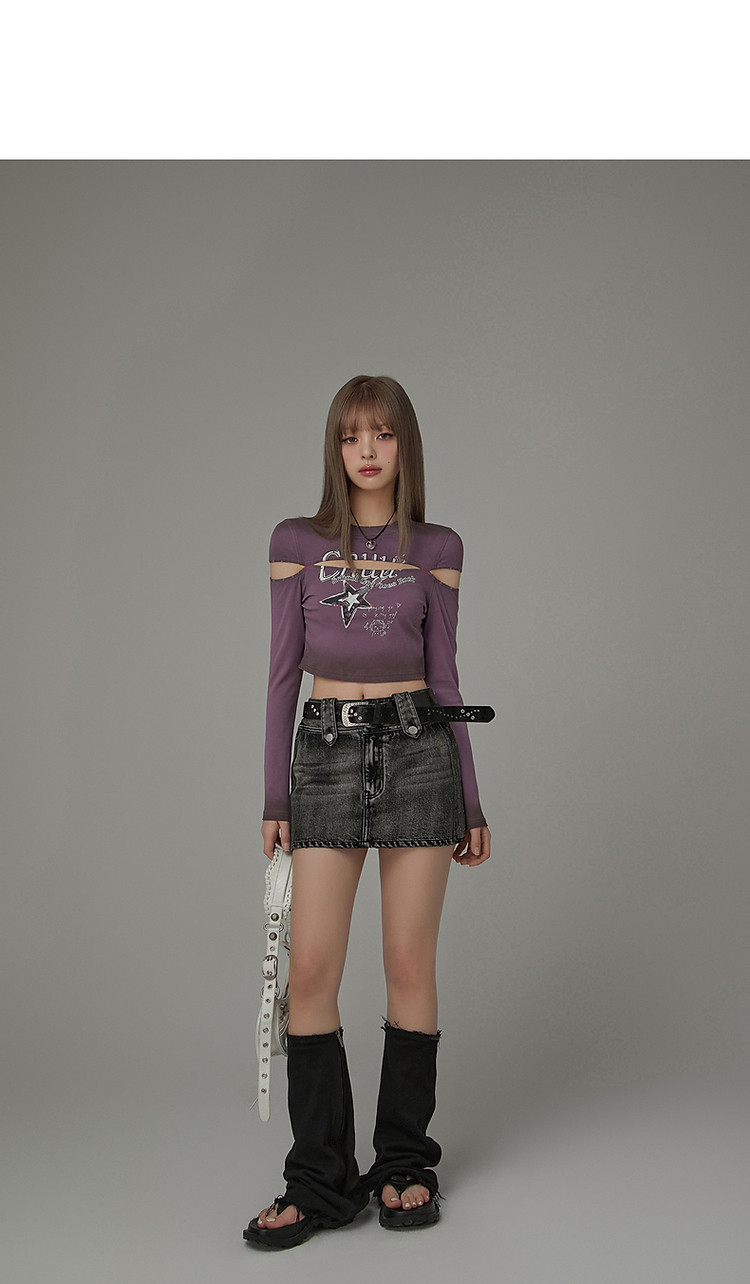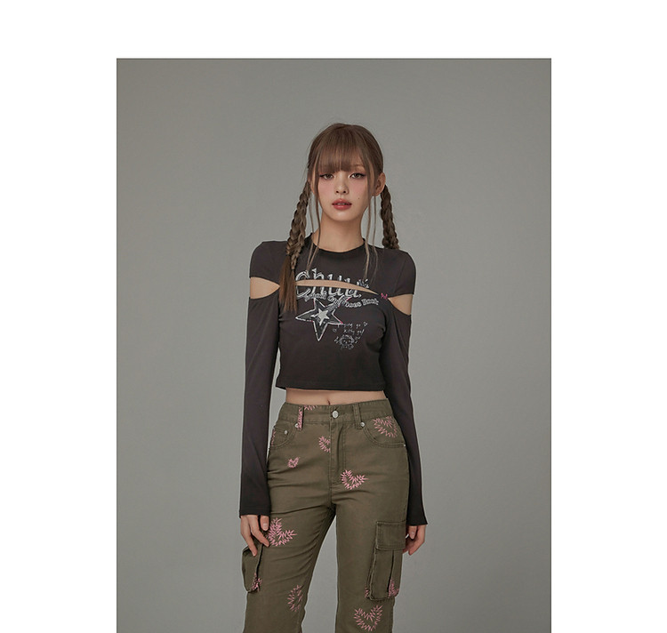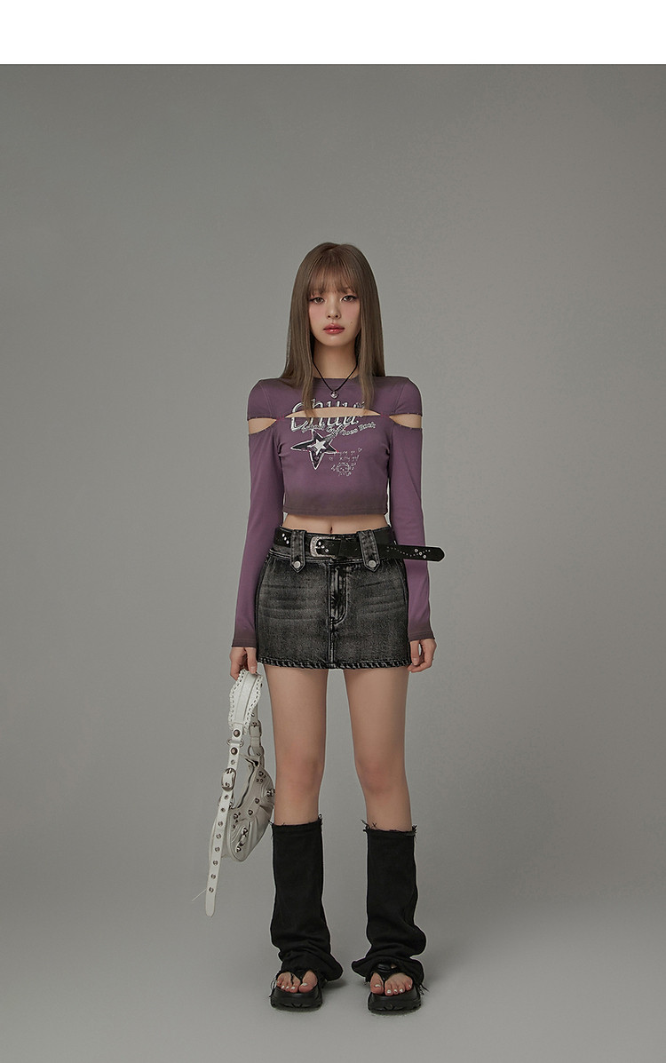 字母卡通印花2025夏镂空渐变色磨破长袖T恤 368147