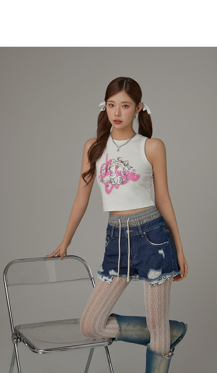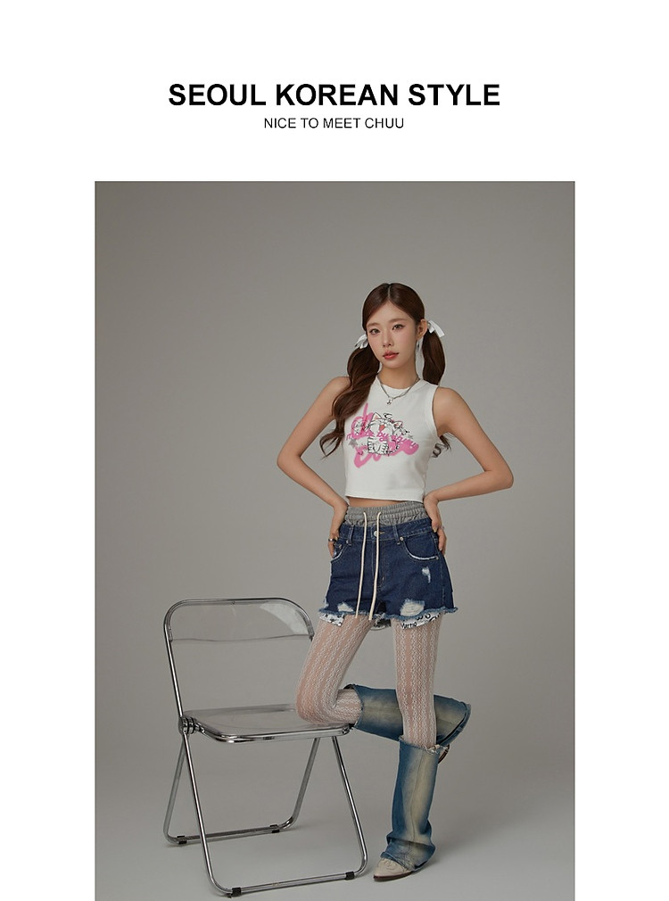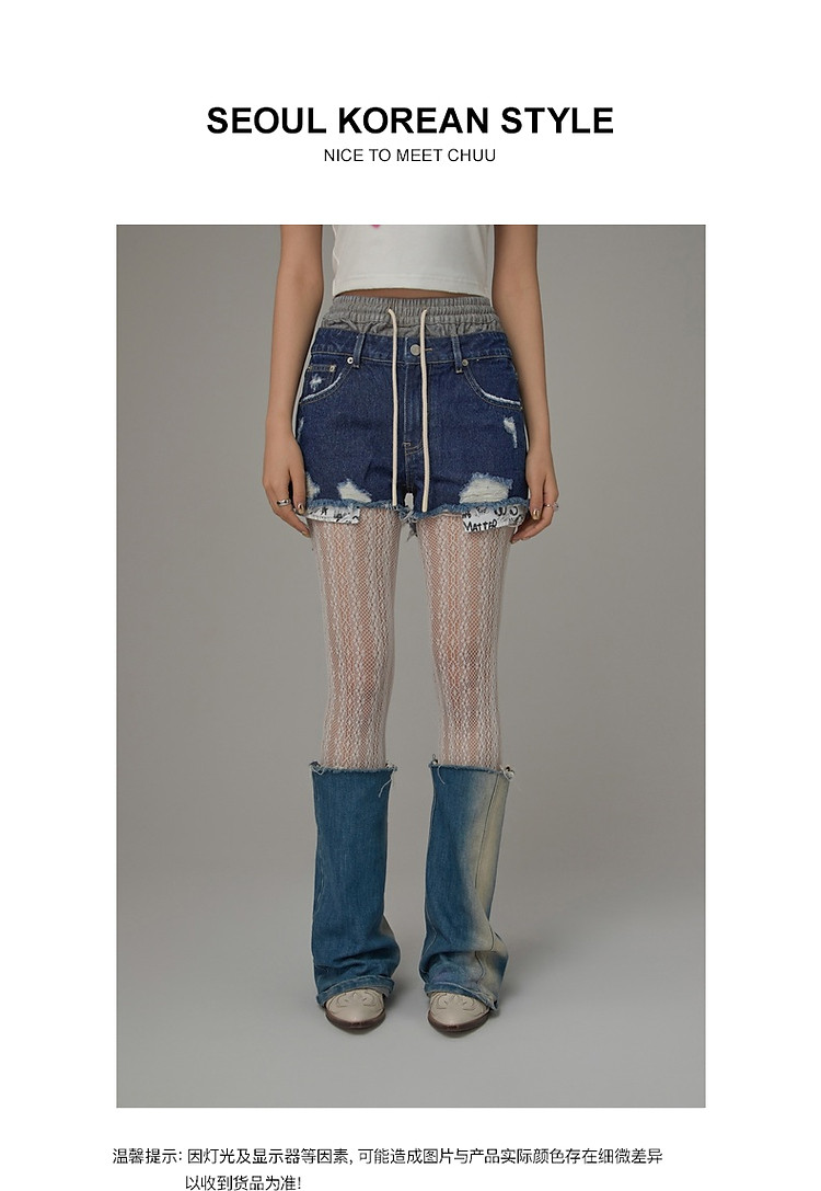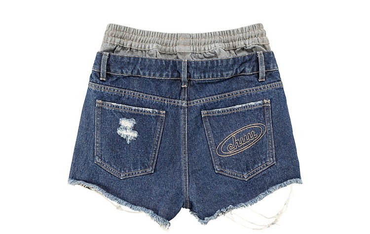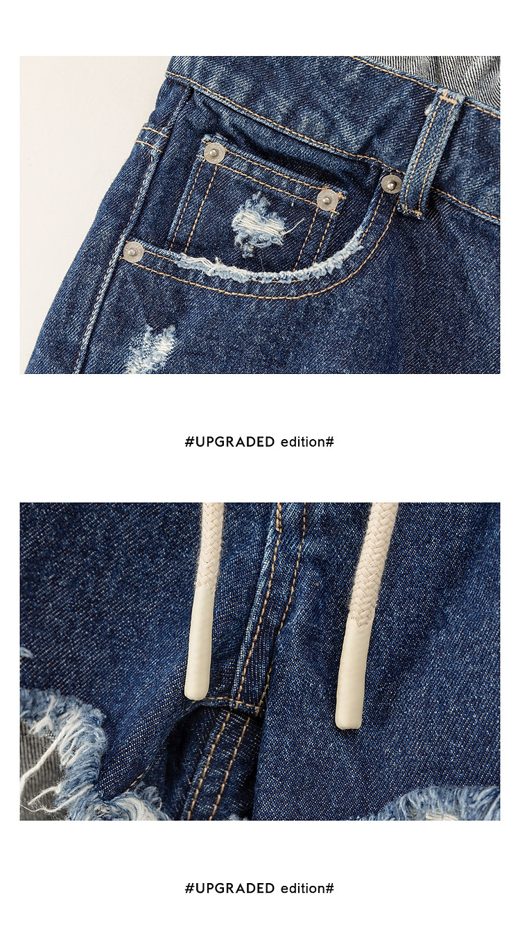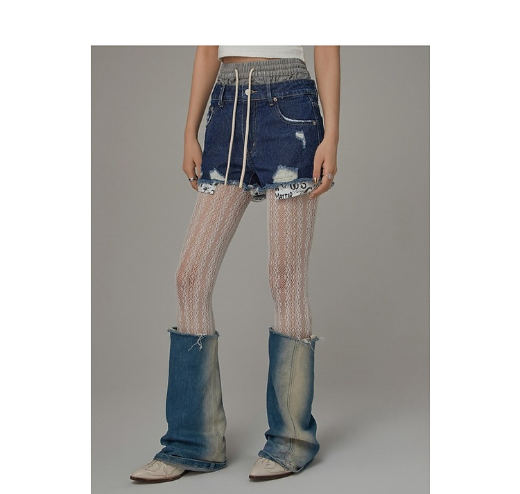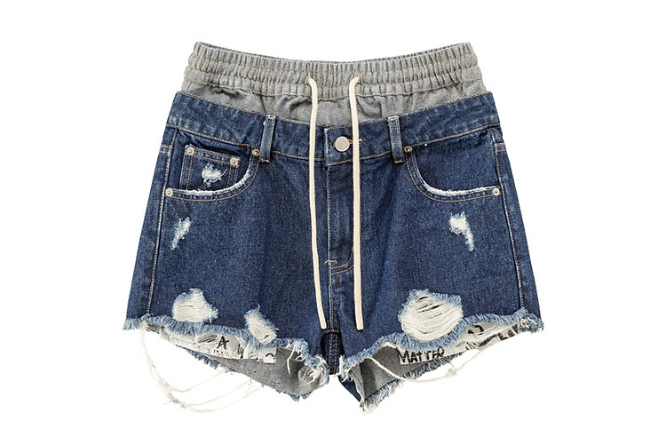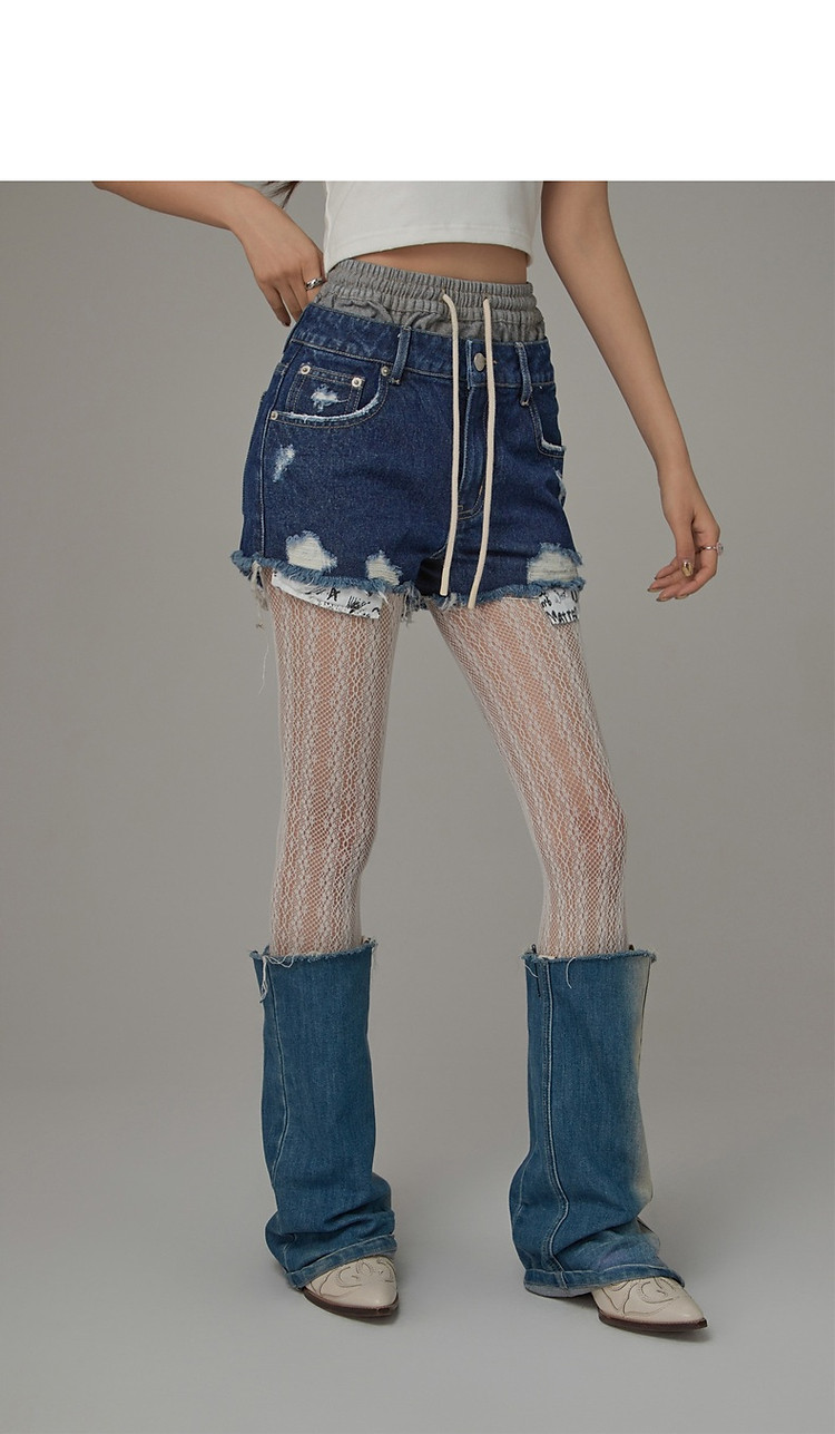 商品名称:破洞毛边牛仔短裤女2025夏设计感拼接松紧腰系带裤子 050579
