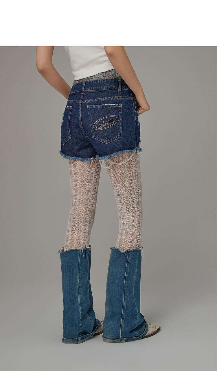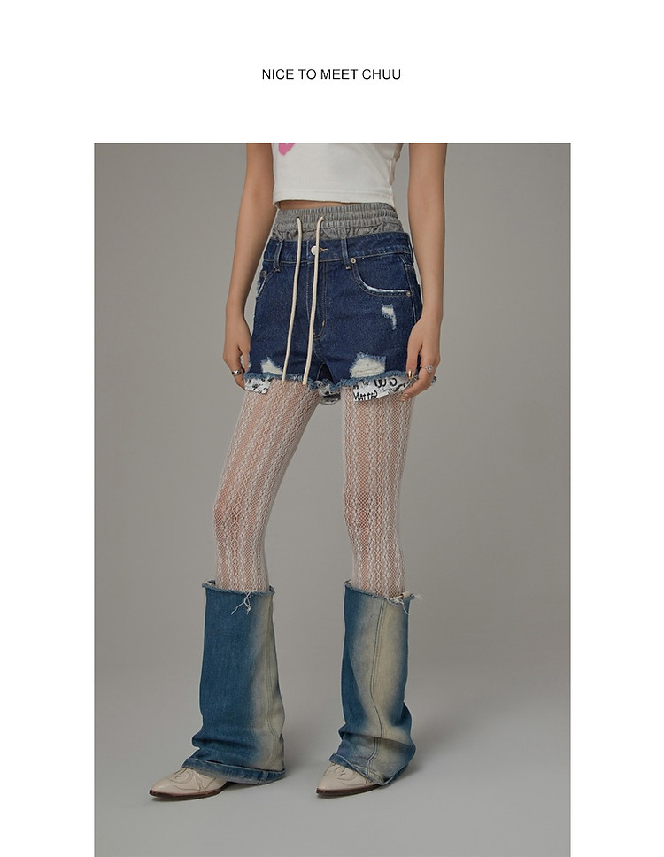 破洞毛边牛仔短裤女2025夏设计感拼接松紧腰系带裤子 050579