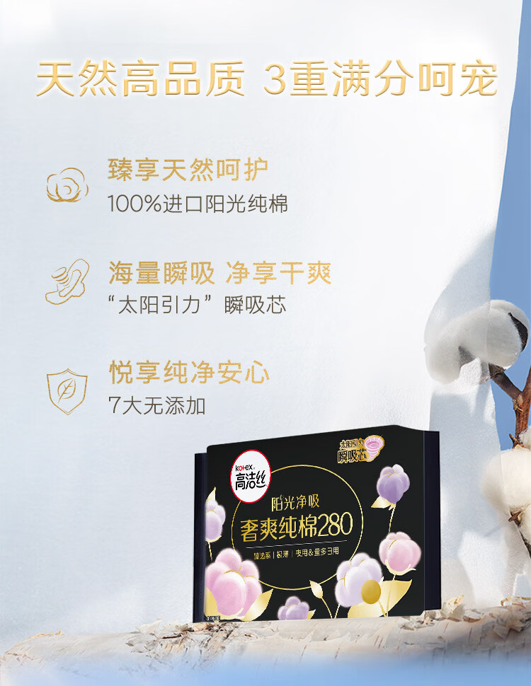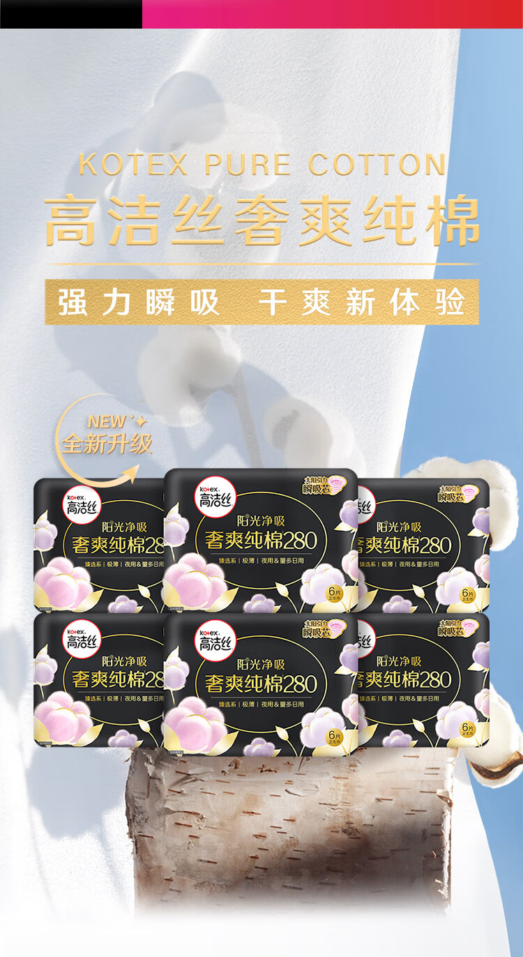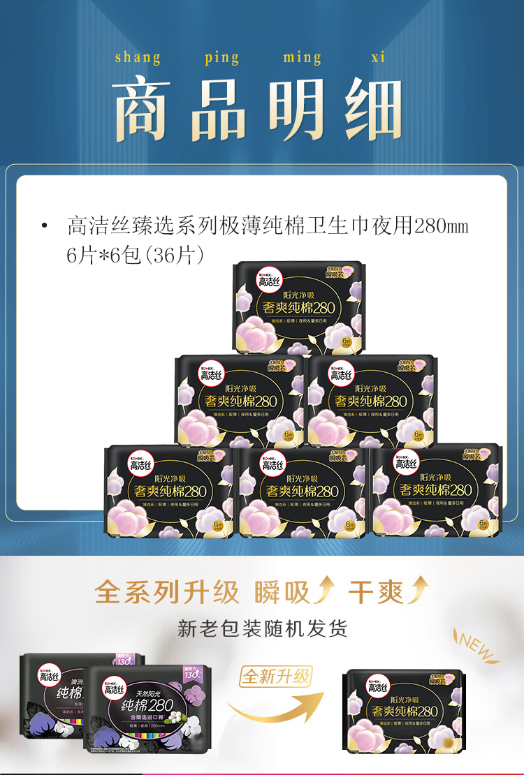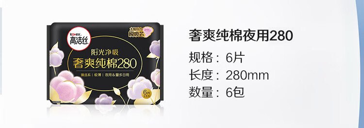 商品名称:kotex/高洁丝臻选系列280mm极薄纯棉夜用卫生巾6片*6包