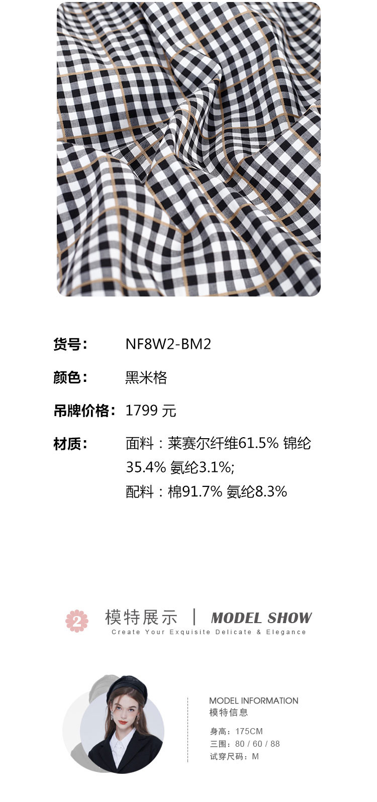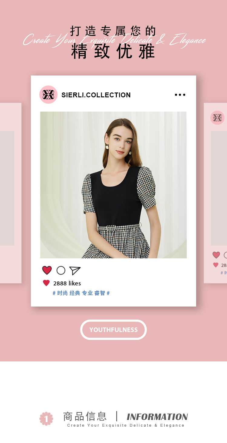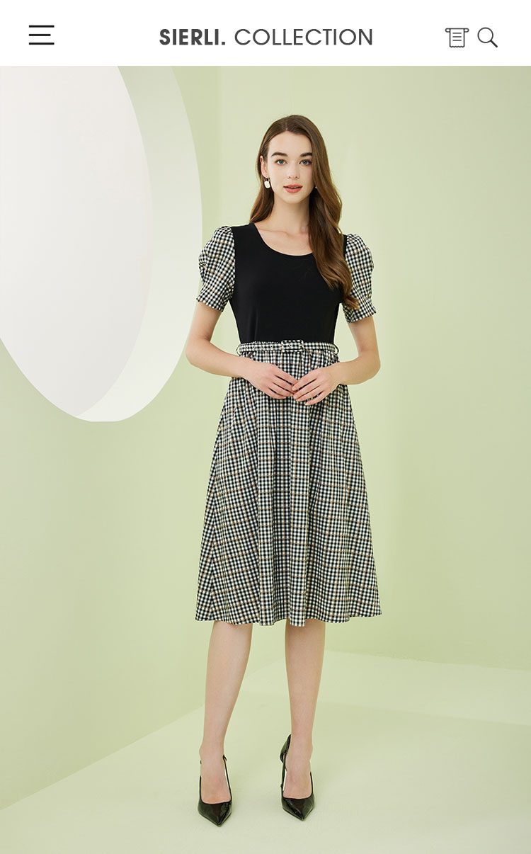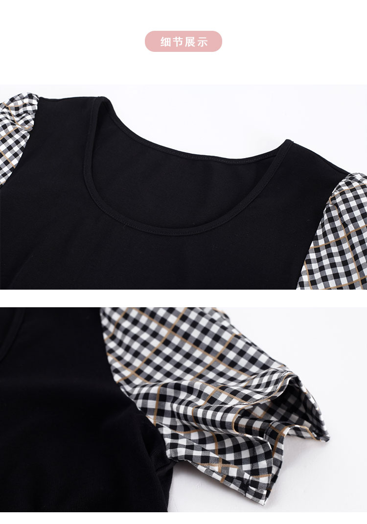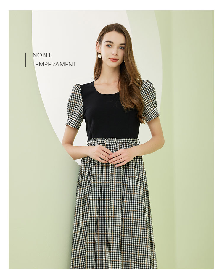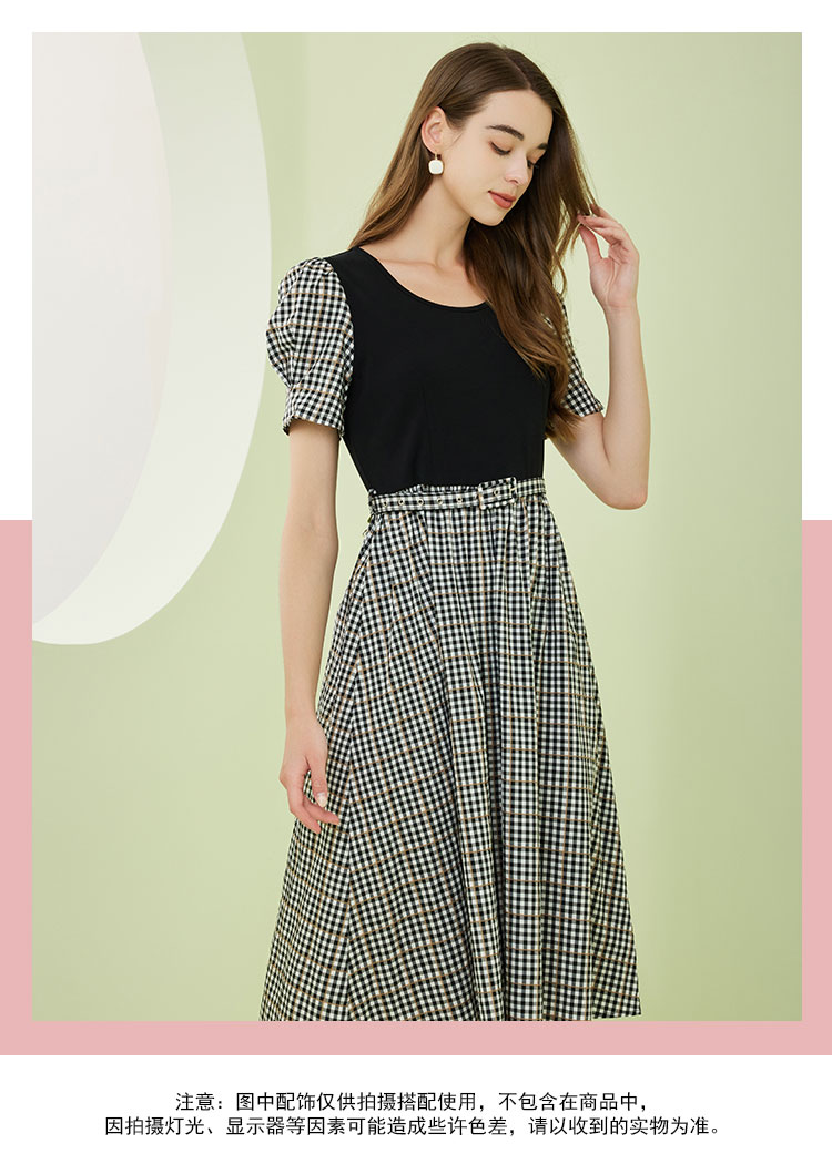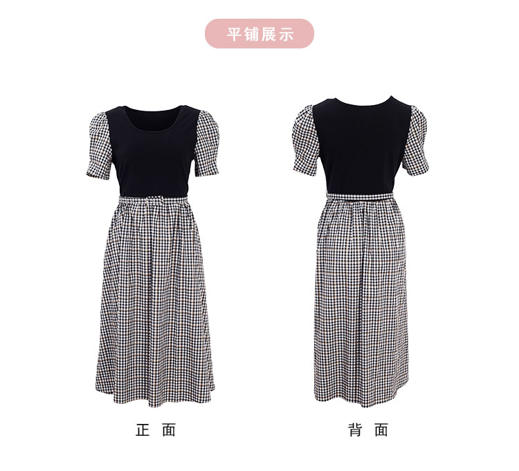 商品名称:[时尚格纹拼接]春夏圆领泡泡袖收腰A摆中长款连衣裙 608927