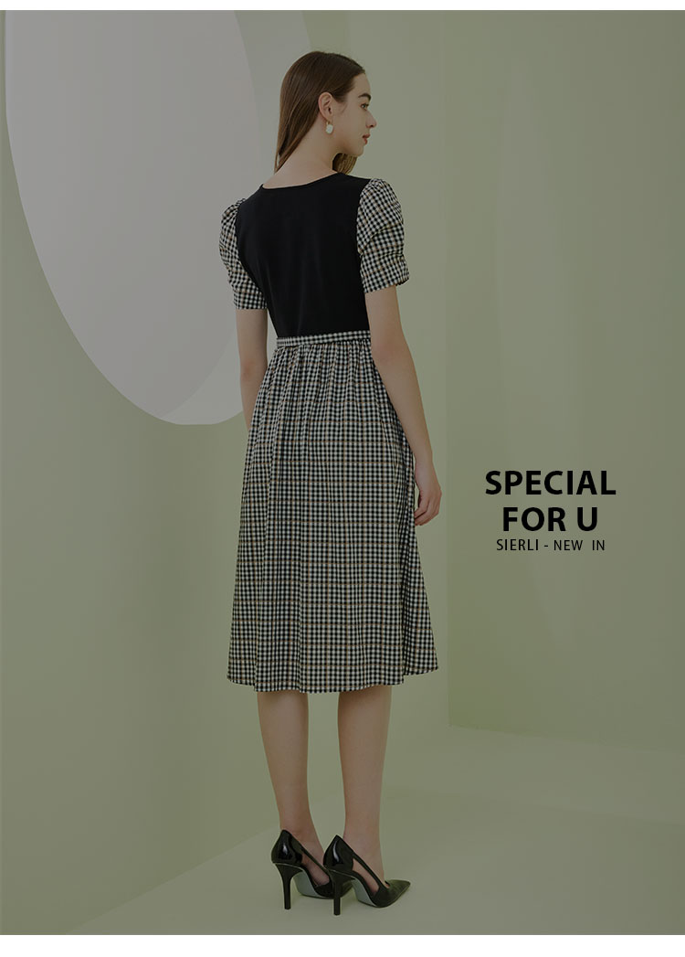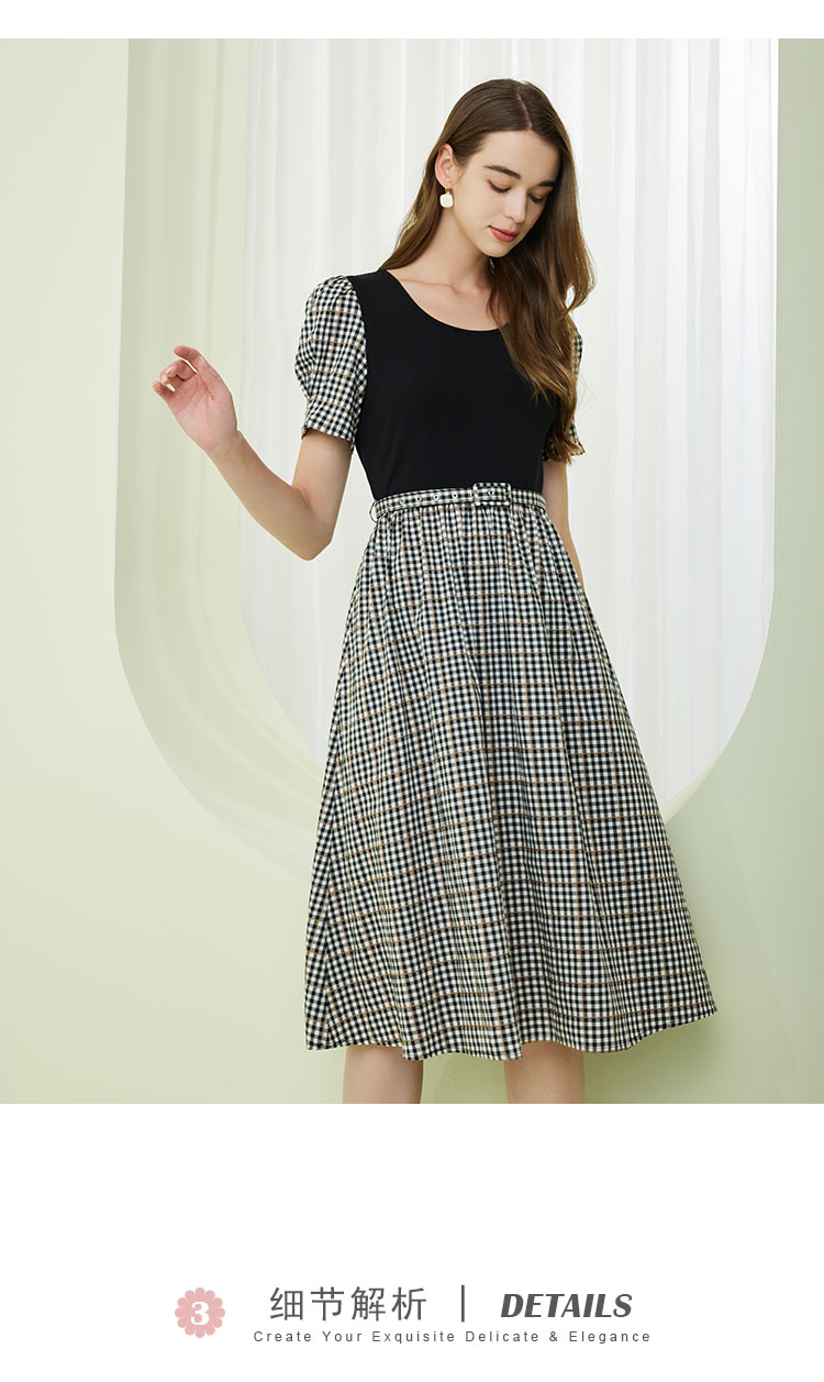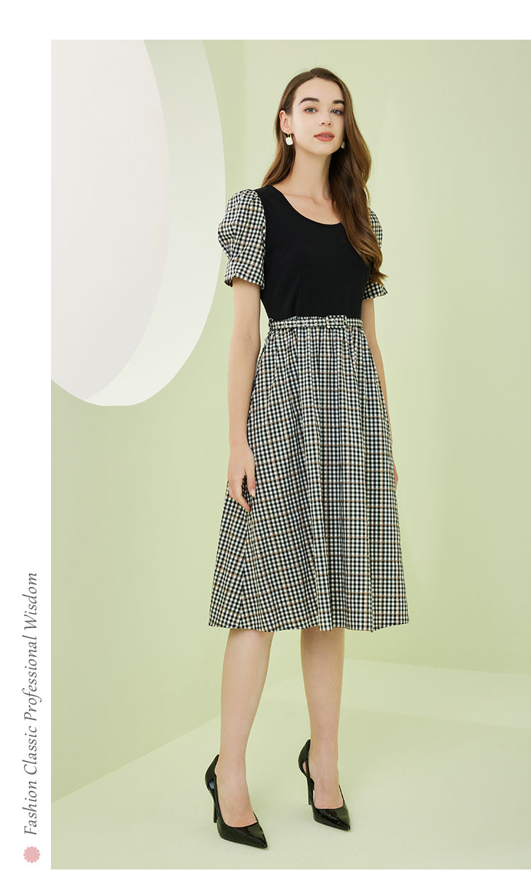 [时尚格纹拼接]春夏圆领泡泡袖收腰A摆中长款连衣裙 608927