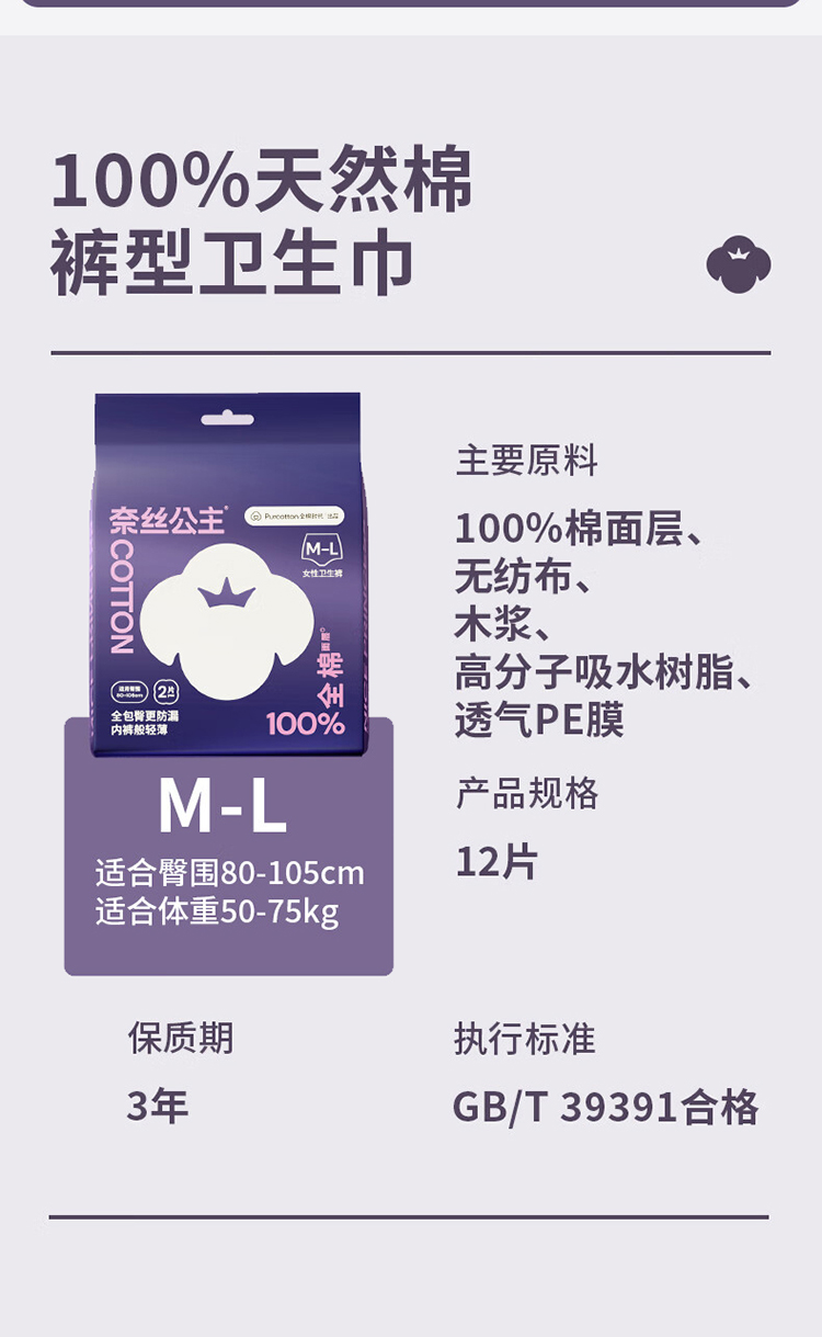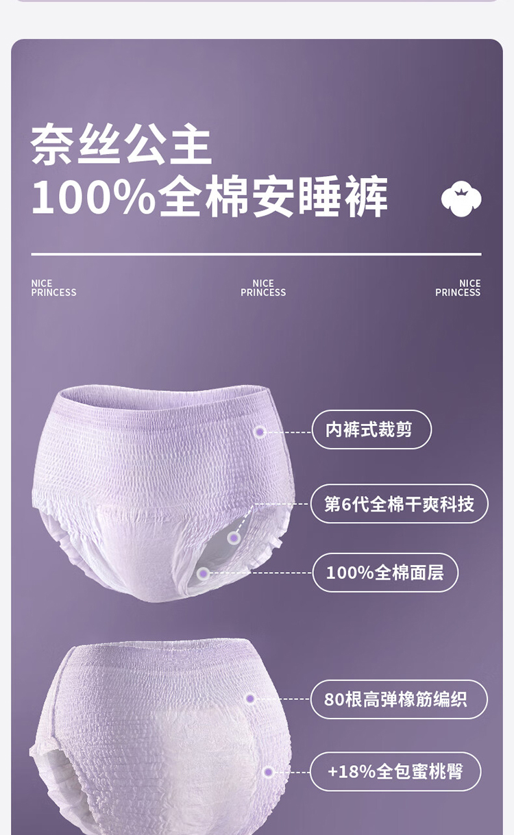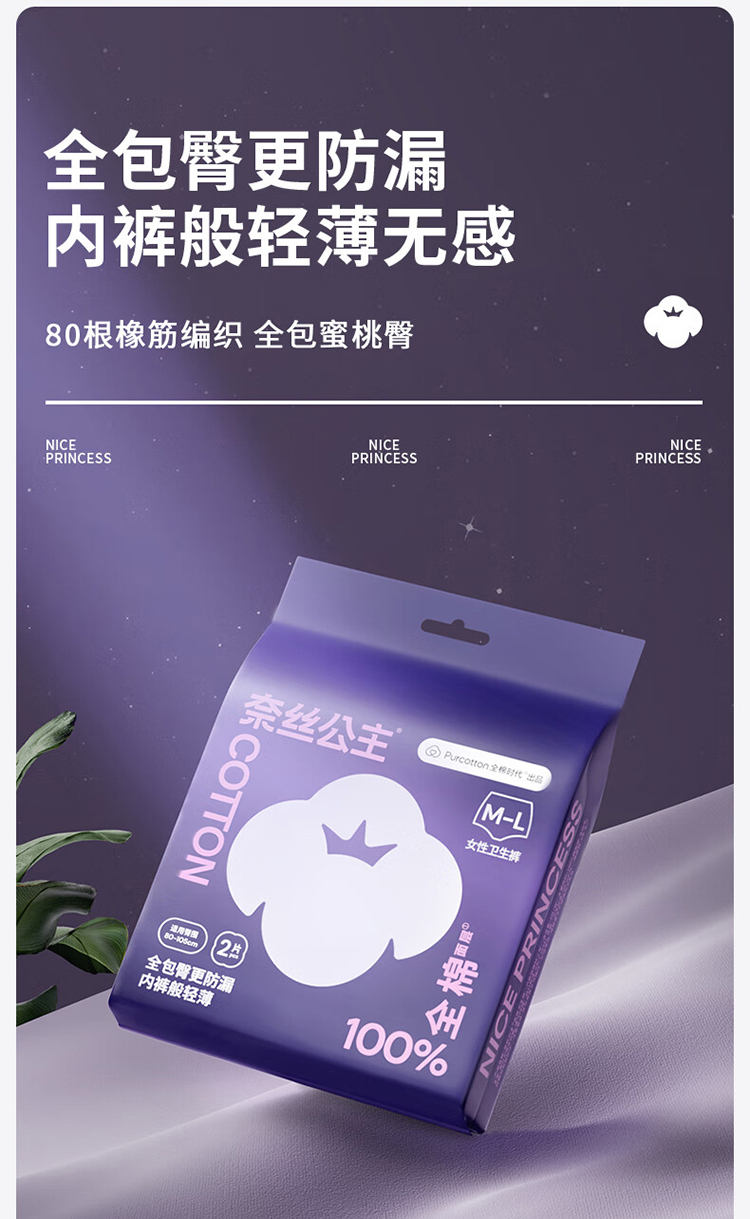 商品名称:Purcotton/全棉时代奈丝公主安睡超薄透安心裤M-L码2片*6袋
