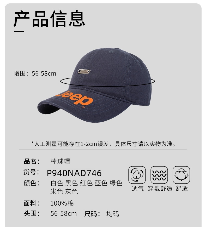 商品名称:Jeep/吉普宽帽檐撞色LOGO棒球帽P940NAD746