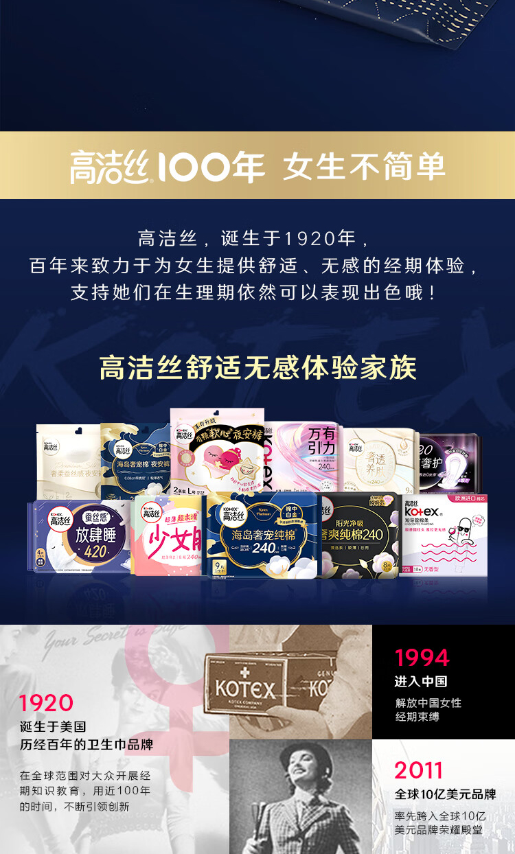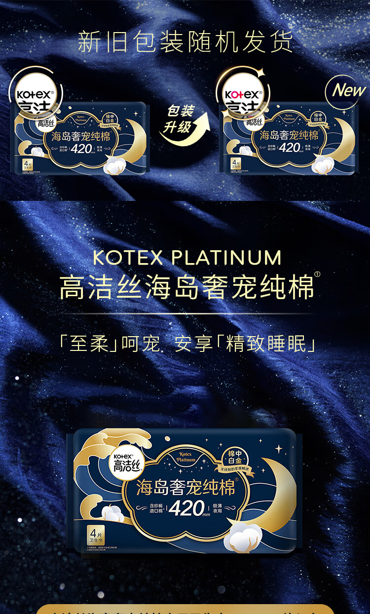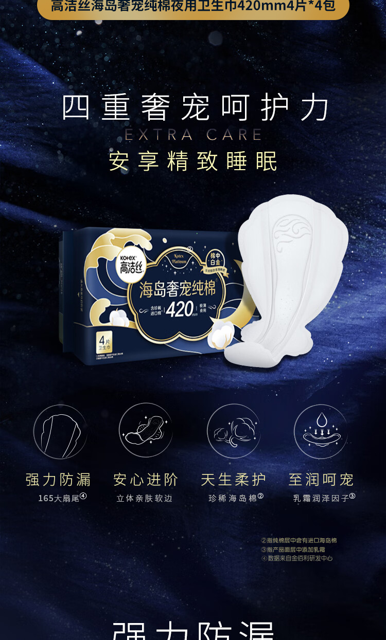 商品名称:kotex/高洁丝海岛奢宠420mm纯棉夜用卫生巾4片*4包