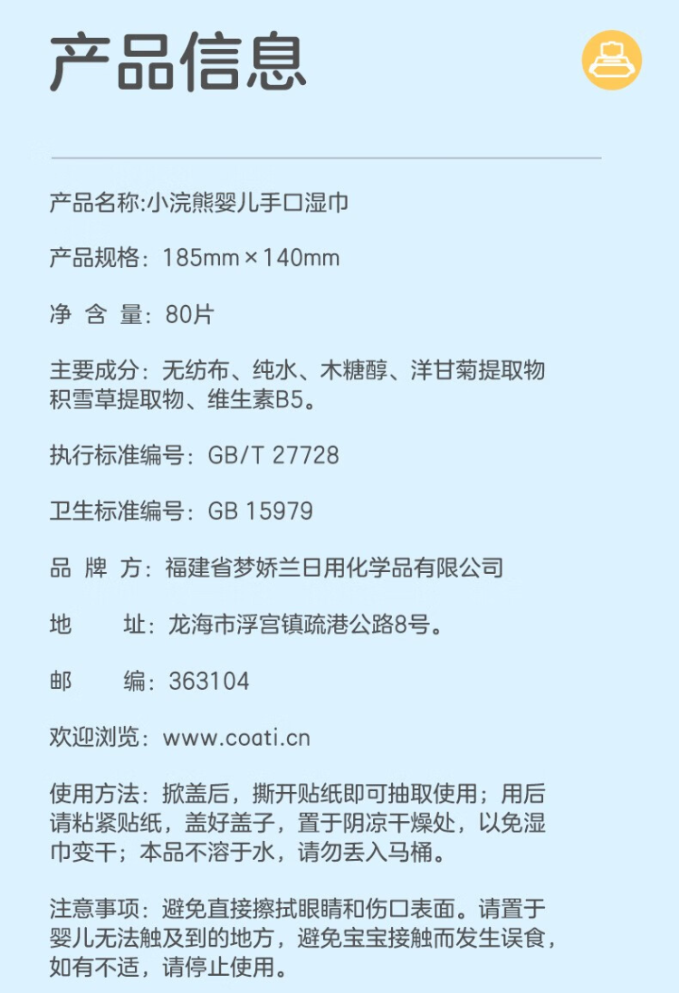 商品名称:小浣熊婴儿手口湿巾80片*5包
