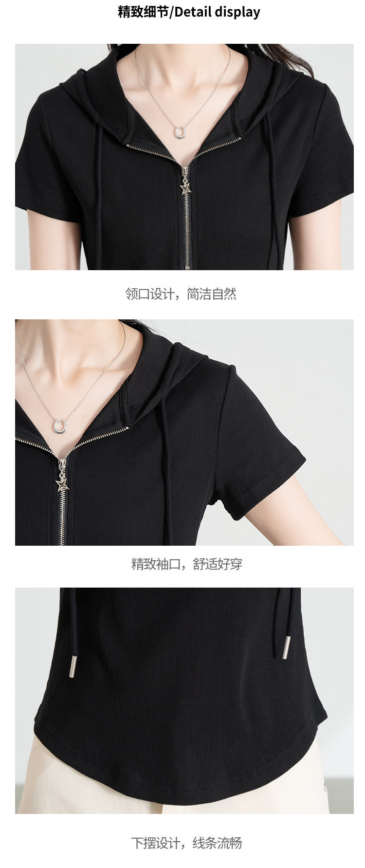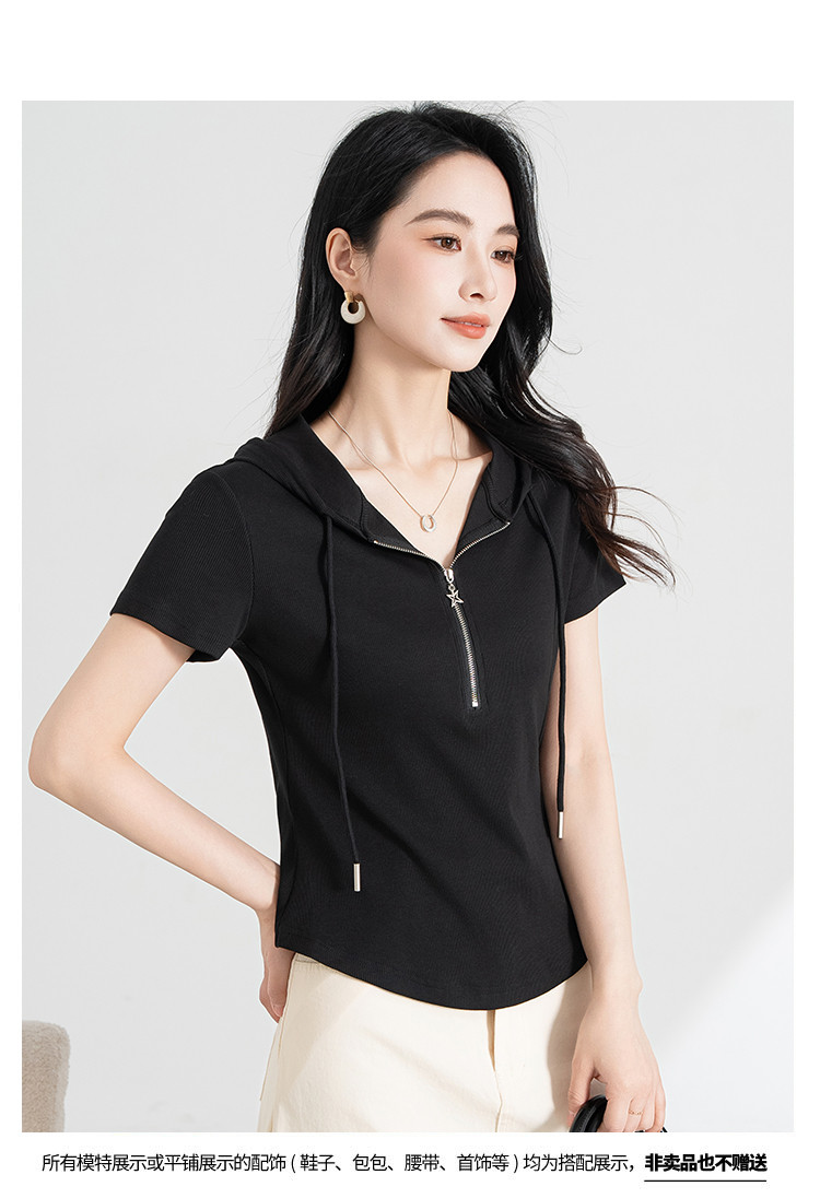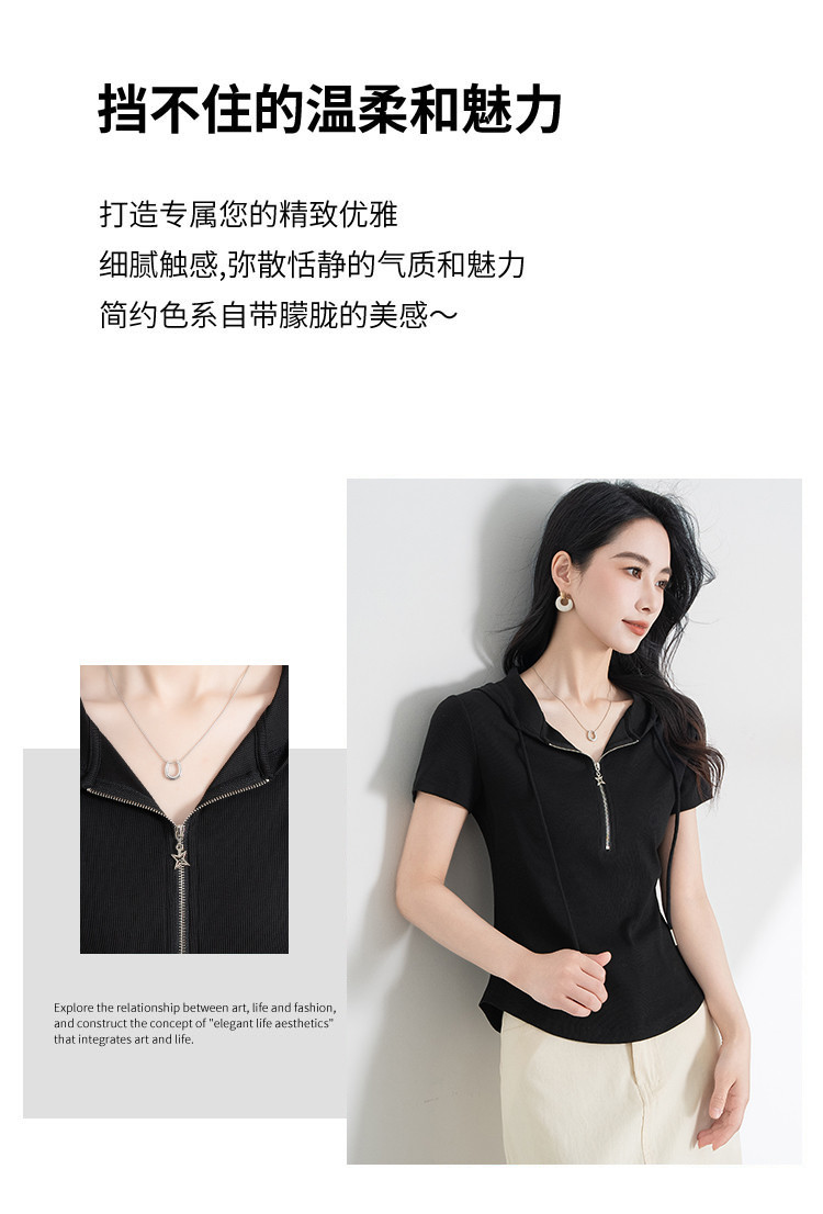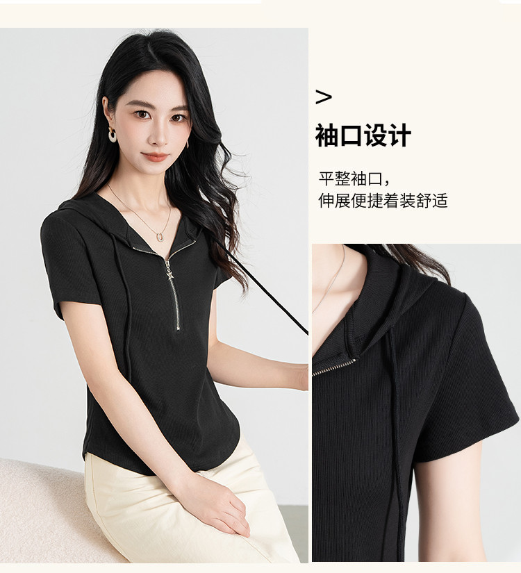 商品名称:【凉爽冰丝】半拉链连帽针织短袖女夏季2025修身显瘦短袖上衣 314143
