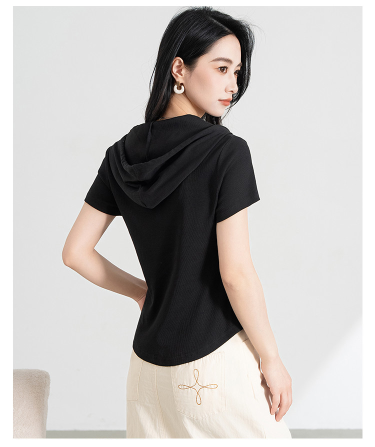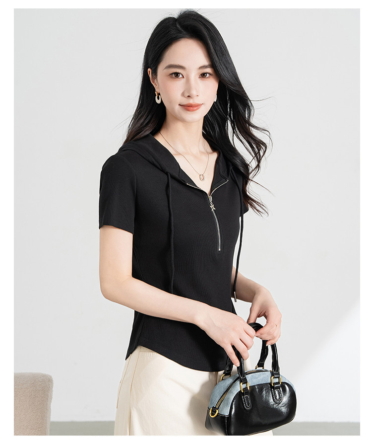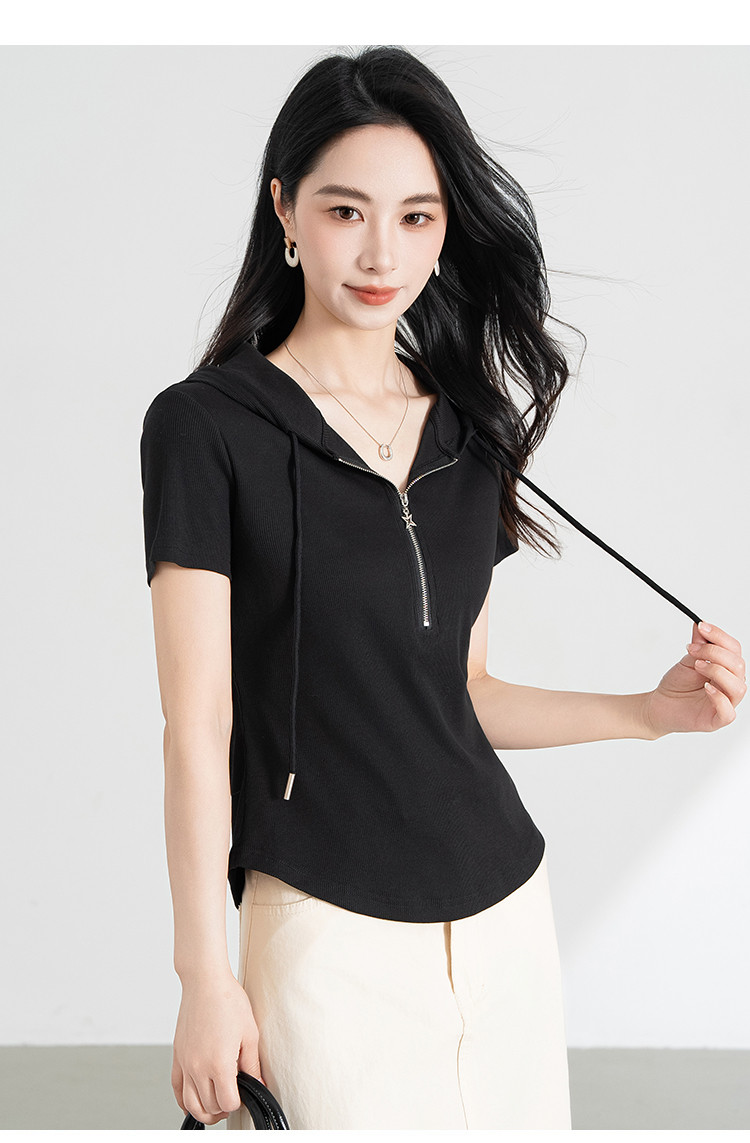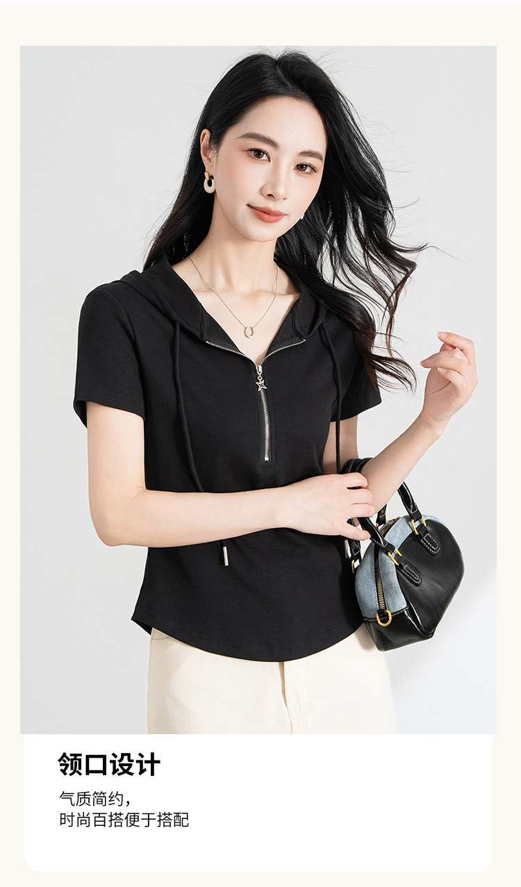 商品名称:【凉爽冰丝】半拉链连帽针织短袖女夏季2025修身显瘦短袖上衣 314143