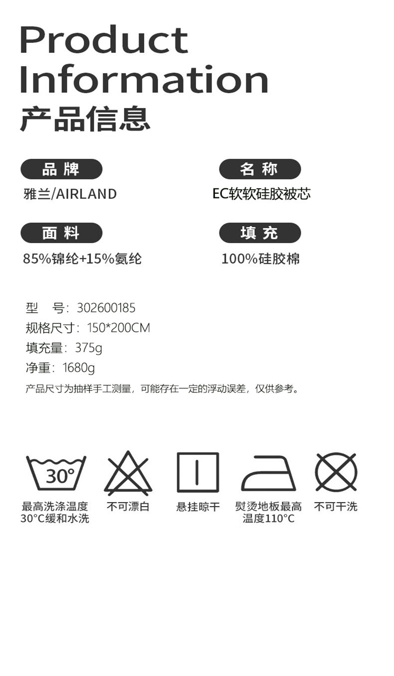 商品名称:雅兰家纺EC软软硅胶被芯150*200cm填充克重375g