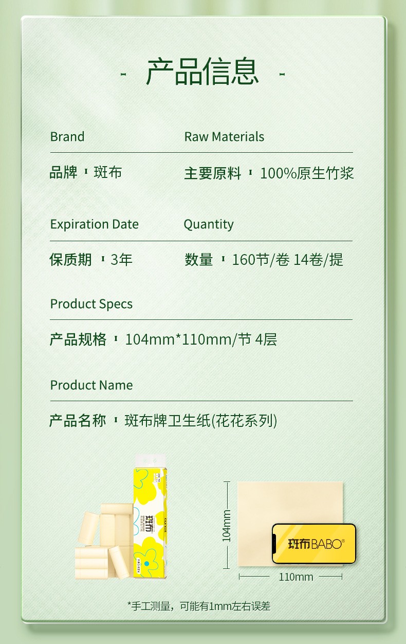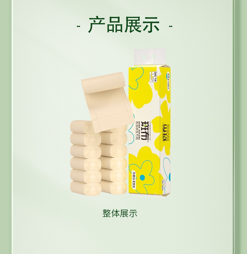商品名称:BABO/斑布花花系列无芯卷纸4层160节*14卷